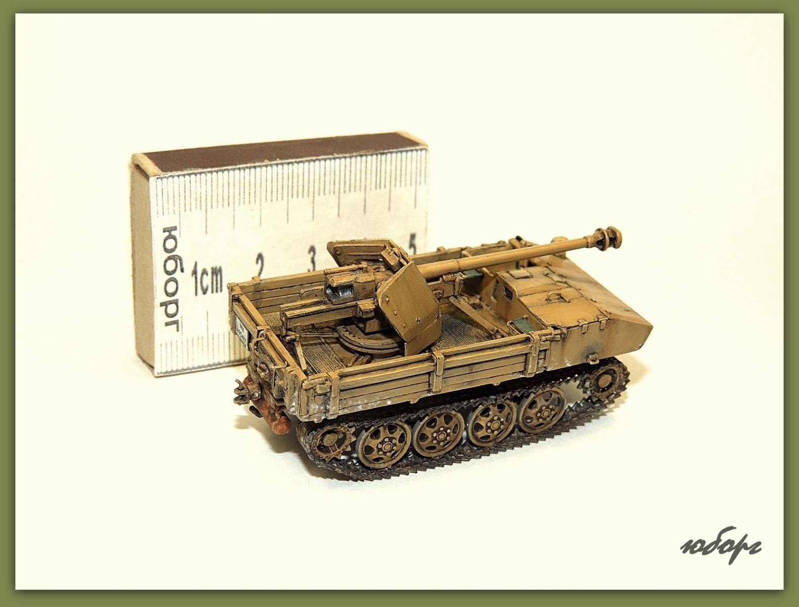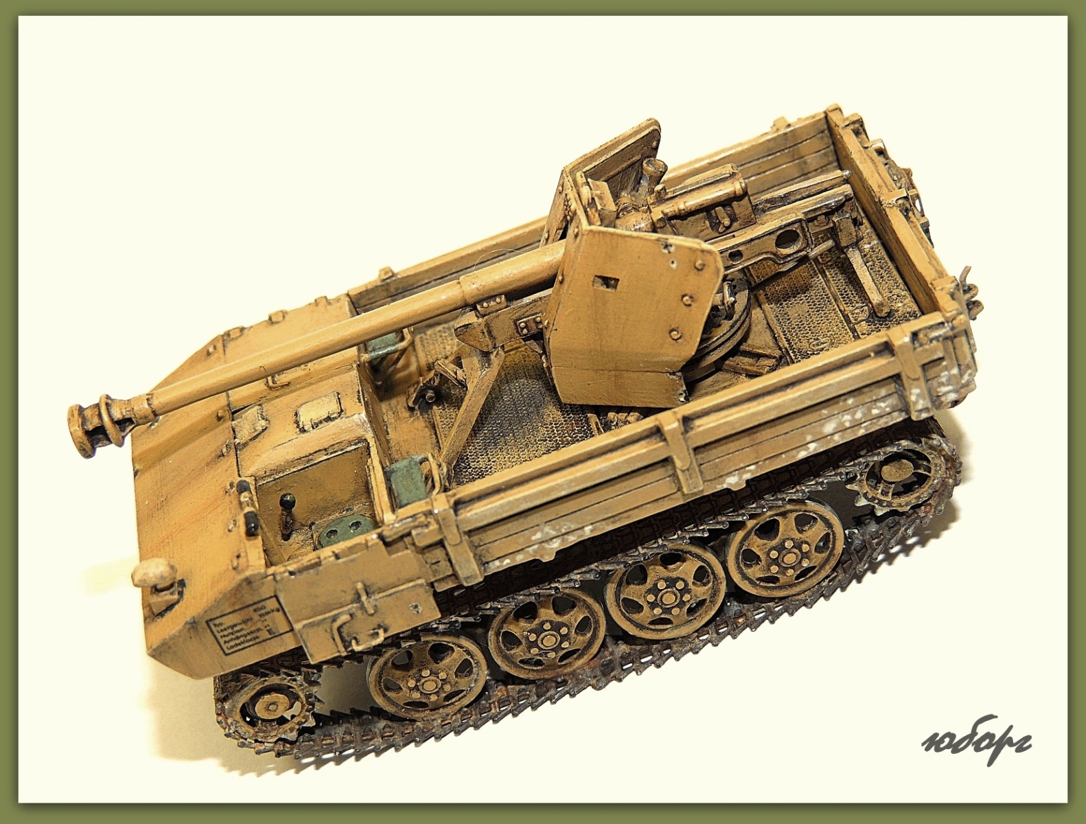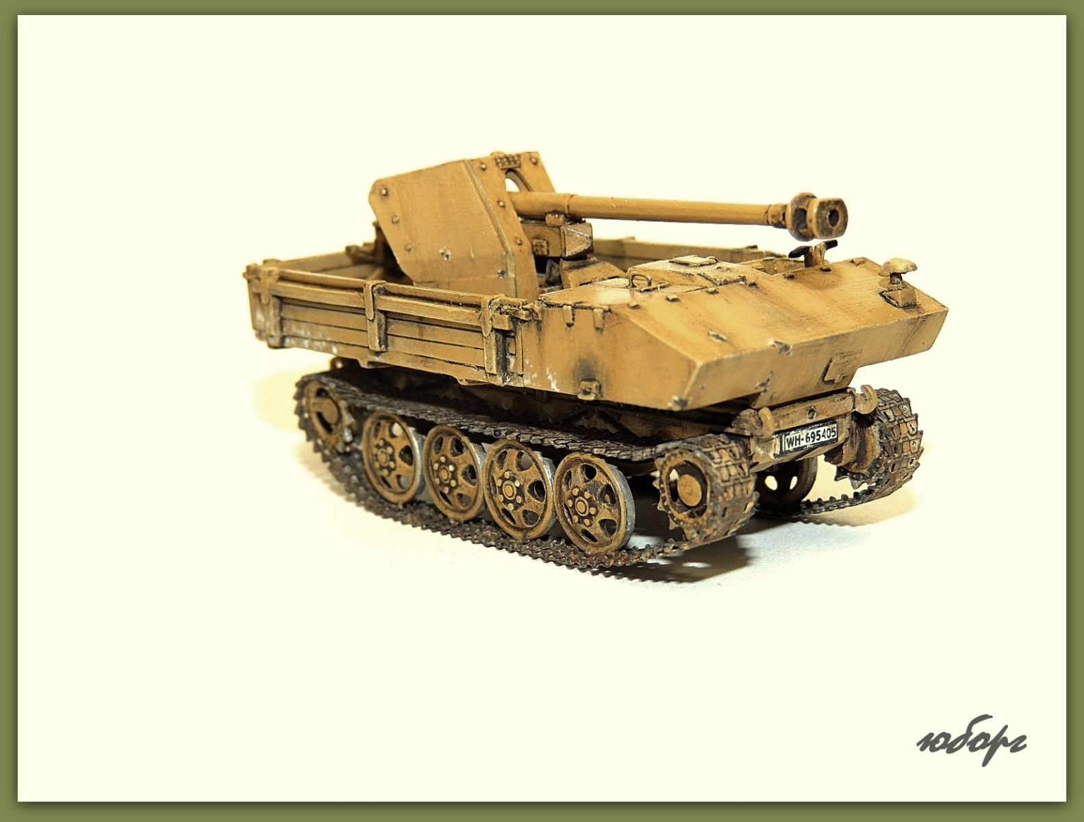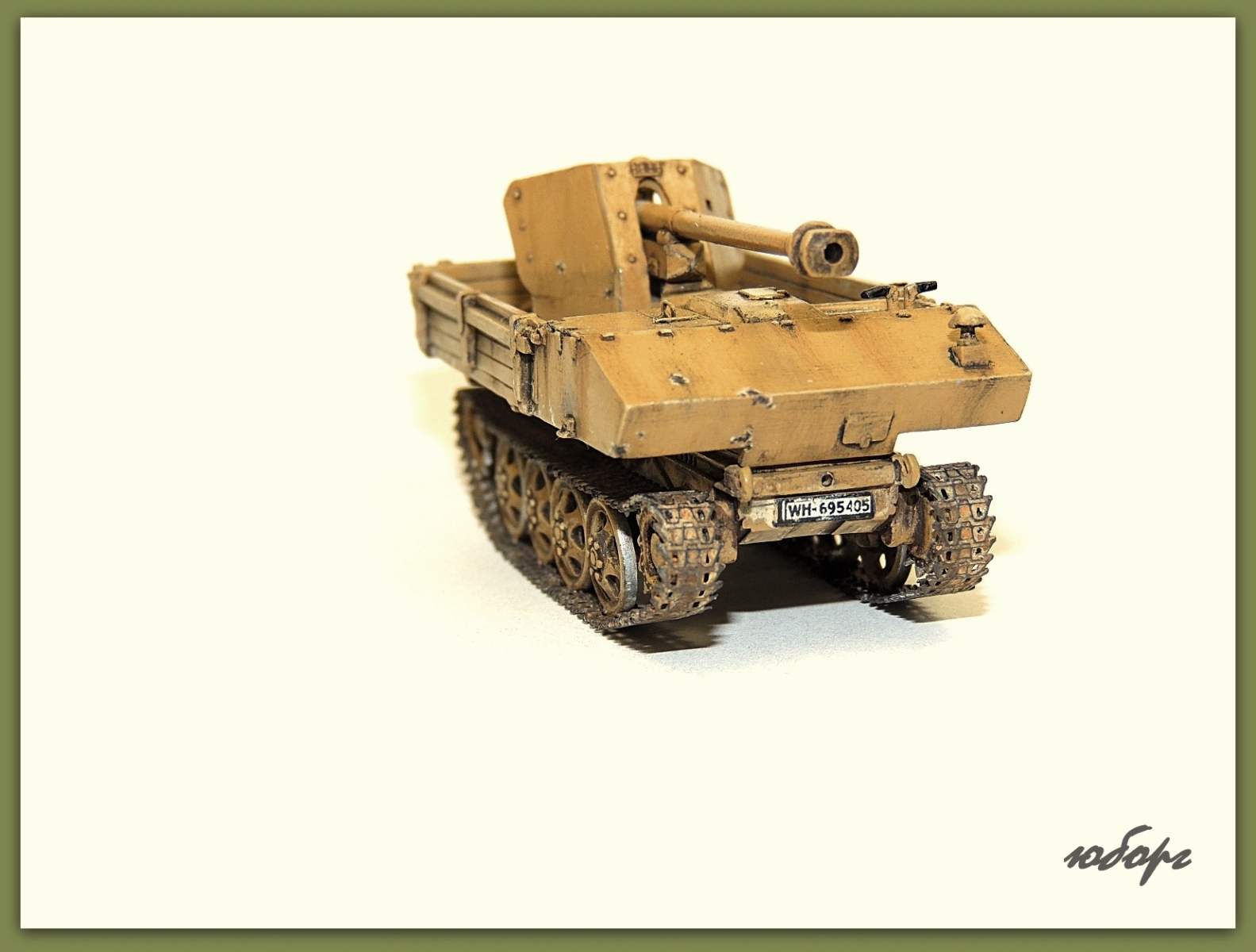 Всем здравствуйте! Выставляю редкую САУ на базе тягача RSO, от легендарной фирмы АСЕ. Что любопытно детали были неплохого качества, хотя пришлось стачивать, выравнивать и подправлять и подчас и просто вменять некоторые элементы на собственноручные(правда по мелочи). Данный образец тёмного германского гения давно будоражил моё желание его добавить в мою коллекцию(вариант с запилом был временно отложен), но появилось предложение, от которого я не мог отказаться и вот машина в сборе. Модель частая "изкаробка"! Ни чего сверх выдумывать не стал, дабы не затягивать и что самое главное не испортить, хотя конечно натяжной тент с рамой сделать бы не помешало. Из того что сделал, это стачивал, стачивал всё по толщине(откидные крышки рубки, борта кузова, орудийные щиты, станки крепления орудия, звёздочки по ширине и пр.). Гусеницы травлёные, впервые с ними сталкиваюсь, пришлось помучится что бы не испортить. Кое что рассказано в сказке, вот тут: http://karopka.ru/forum/messages/forum261/topic24712/message1101741/#message1101741