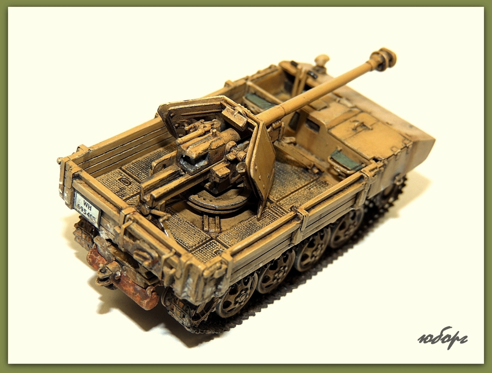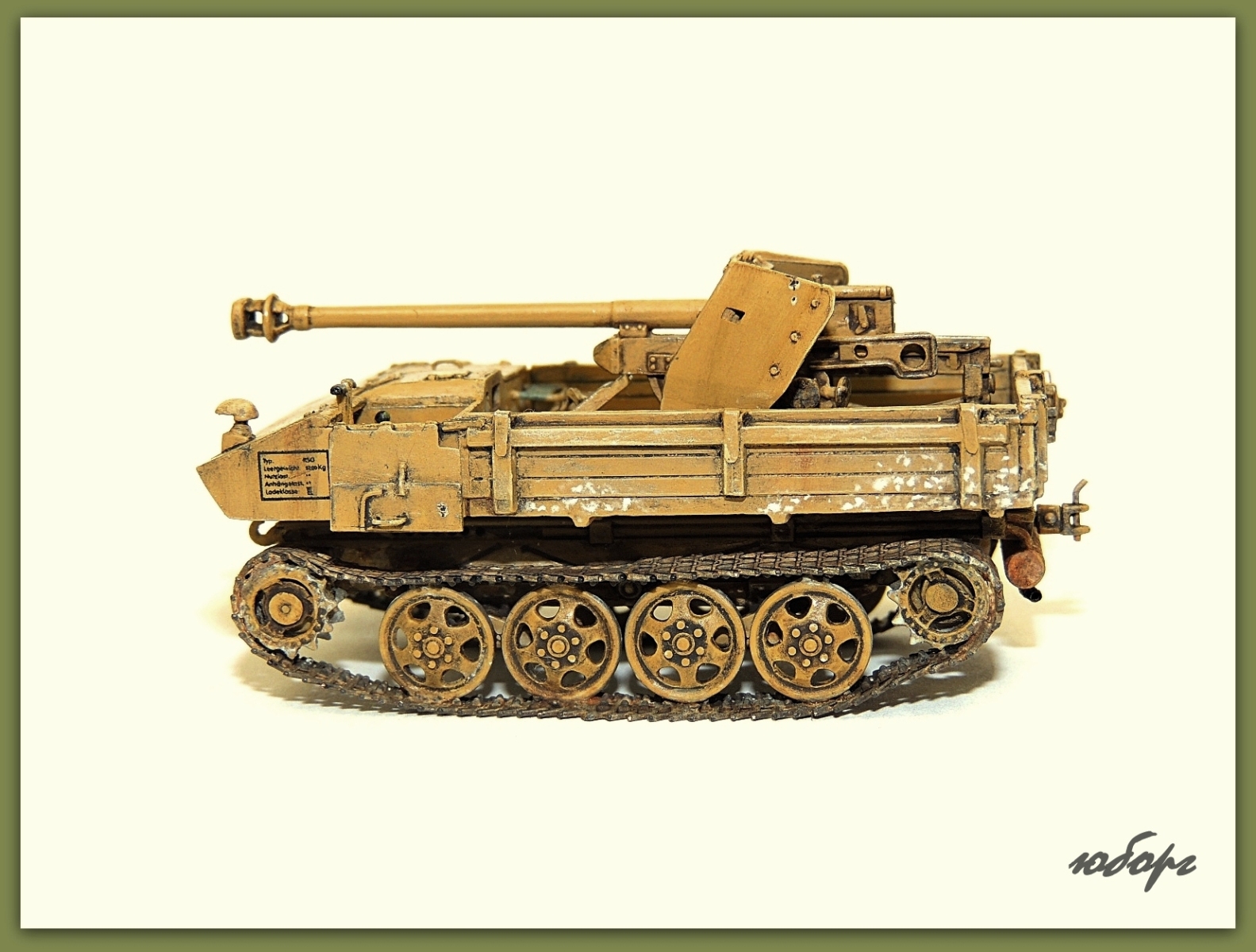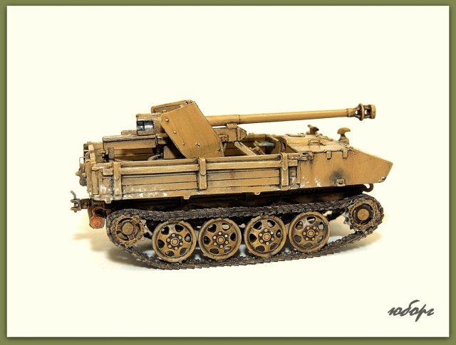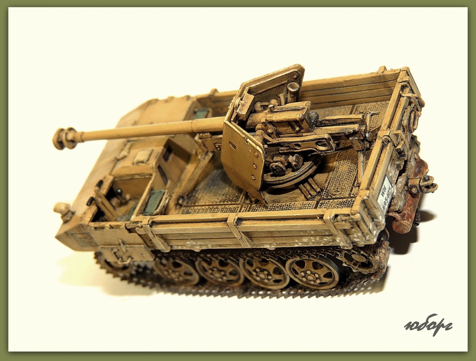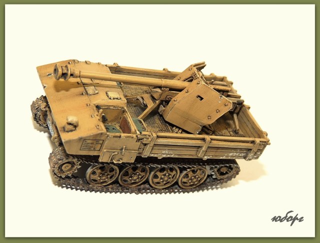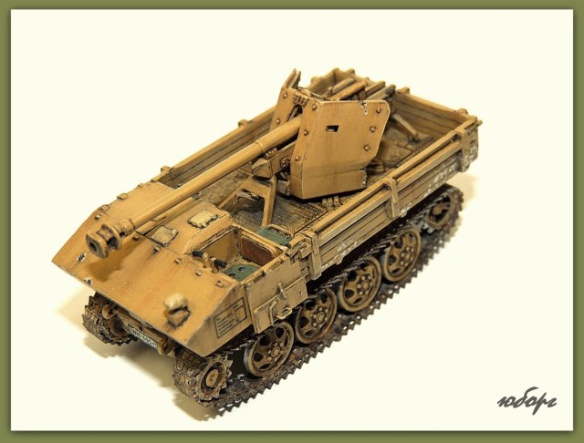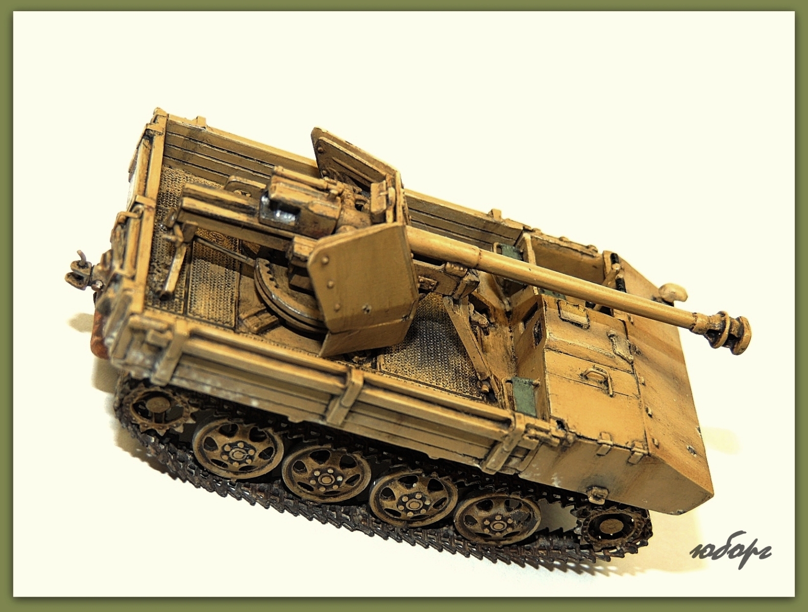 Всем здравствуйте! Выставляю редкую САУ на базе тягача RSO, от легендарной фирмы АСЕ. Что любопытно детали были неплохого качества, хотя пришлось стачивать, выравнивать и подправлять и подчас и просто вменять некоторые элементы на собственноручные(правда по мелочи). Данный образец тёмного германского гения давно будоражил моё желание его добавить в мою коллекцию(вариант с запилом был временно отложен), но появилось предложение, от которого я не мог отказаться и вот машина в сборе. Модель частая "изкаробка"! Ни чего сверх выдумывать не стал, дабы не затягивать и что самое главное не испортить, хотя конечно натяжной тент с рамой сделать бы не помешало. Из того что сделал, это стачивал, стачивал всё по толщине(откидные крышки рубки, борта кузова, орудийные щиты, станки крепления орудия, звёздочки по ширине и пр.). Гусеницы травлёные, впервые с ними сталкиваюсь, пришлось помучится что бы не испортить. Кое что рассказано в сказке, вот тут: http://karopka.ru/forum/messages/forum261/topic24712/message1101741/#message1101741