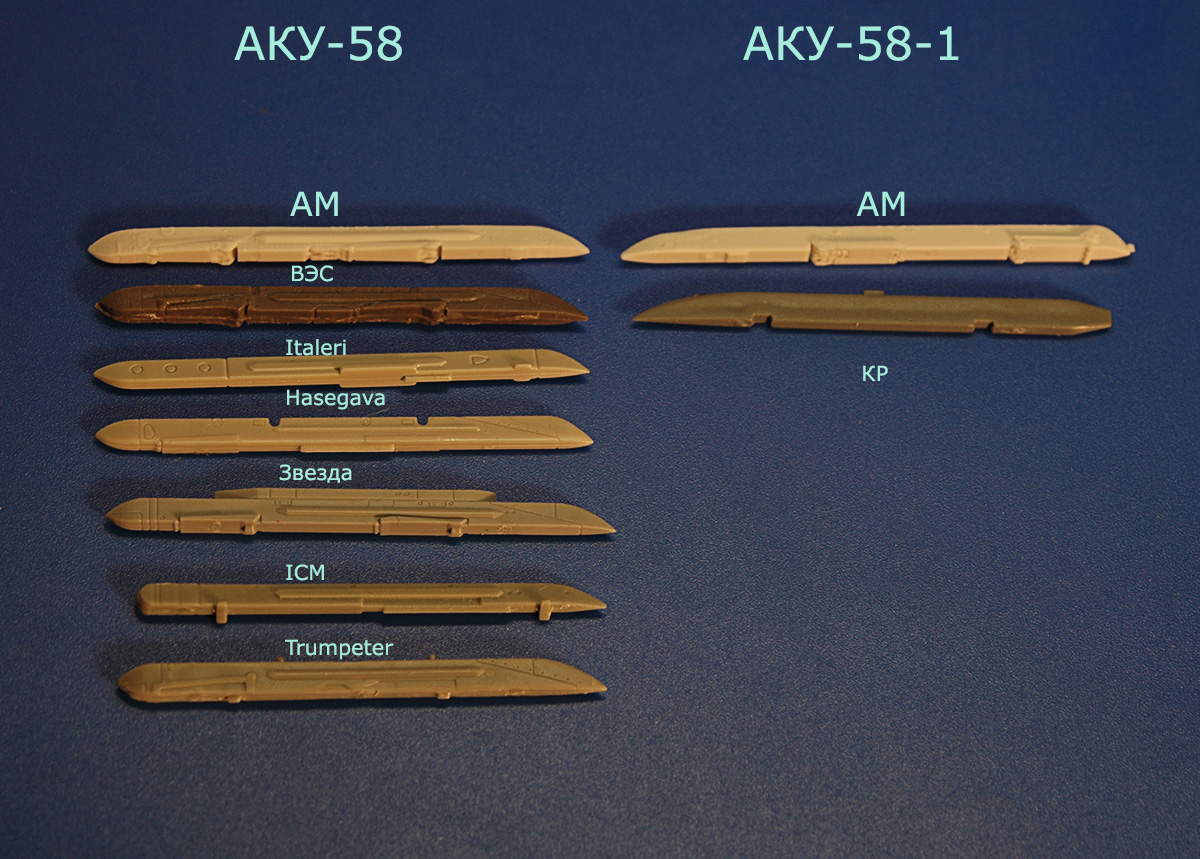 Вернемся к нашему общему хобби. АКУ-58 комплектуется целый ряд моделей советских самолетов. Кроме этого, производители афтемакетинга дают АКУ-58 в комплектах авиационного вооружения. Увы, но при всем разнообразии выбора, моделист неизбежно сталкивается с тем, что уменьшенные копии АКУ имеют лишь отдаленное сходство с прототипом. Это связанно, как с отсутствием достоверной информации, так и конструктивными особенностями АКУ-58. Разработчикам компании АМ удалось достаточно точно передать деталировку и характерные особенности изделия. Чтобы не быть голословным, привожу фотографии реальных образцов.