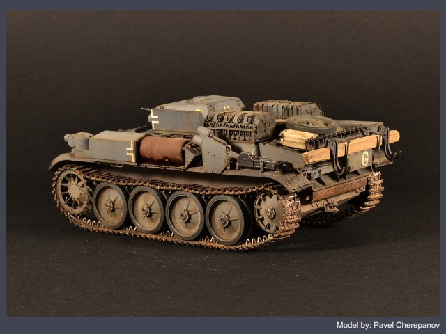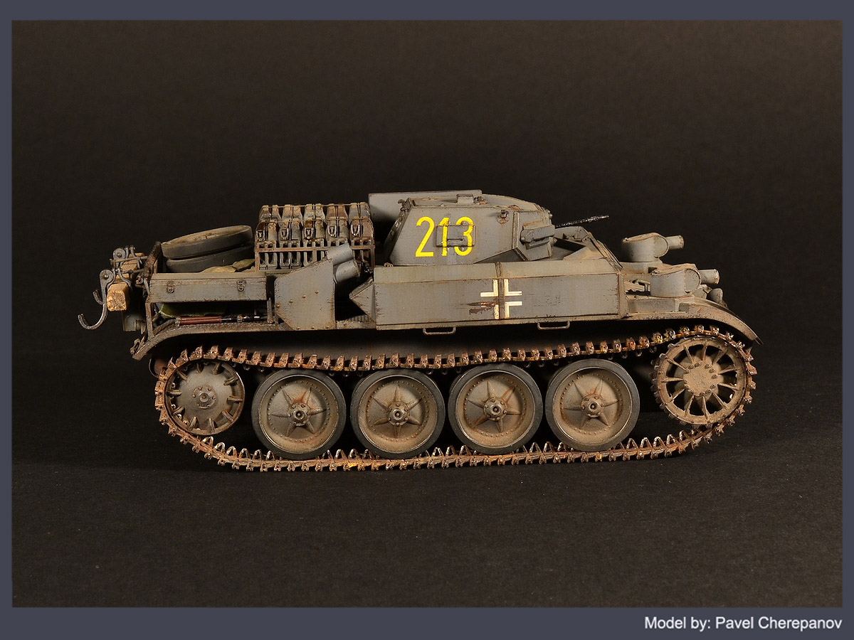 Моделисты старой закалки помнят дровяной набор фирмы ALAN, который портил людям нервы еще с середины 90-х годов. Слава богу, я сумел удержаться от приобретения того набора, хотя танк с красивым прозвищем "Фламинго" мечтал построить много лет. Пару лет назад фирма Bronco, наконец, выпустила этот набор в гораздо более приличном качестве, и самое приятное, что этот набор я получил в подарок на свой день рождения. Тут самое место поблагодарить Володю Яшина за такой роскошный презент! Сборка заняла буквально неделю, столько же окраска и тонировка. Самая интересная опция данного набора - возможность сделать открытыми ящики с баками огнесмеси. Один из них я таки сделал наполовину открытым. Также набор позволяет сделать несколько модификаций - раннюю и позднюю, и разные варианты крепления канистр. Декали, правда, никуда не годятся, после долгих мучений штатные декали пришлось выбросить, и использовать эшелоновские цифры, а также кресты и буквы G из старых запасов. От себя я добавил бревно для самовытаскивания, из бальзы. Траки поменял на металл. Не знаю, насколько убедительно получились потеки огнесмеси на передних крыльях, использовал для этой цели смесь масел 502Abt. С историей и ТТХ машины можно ознакомиться тут например: