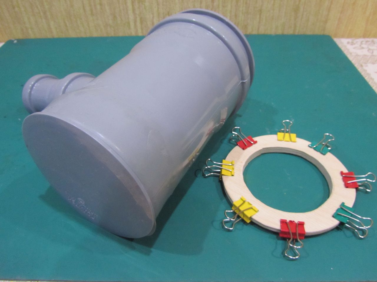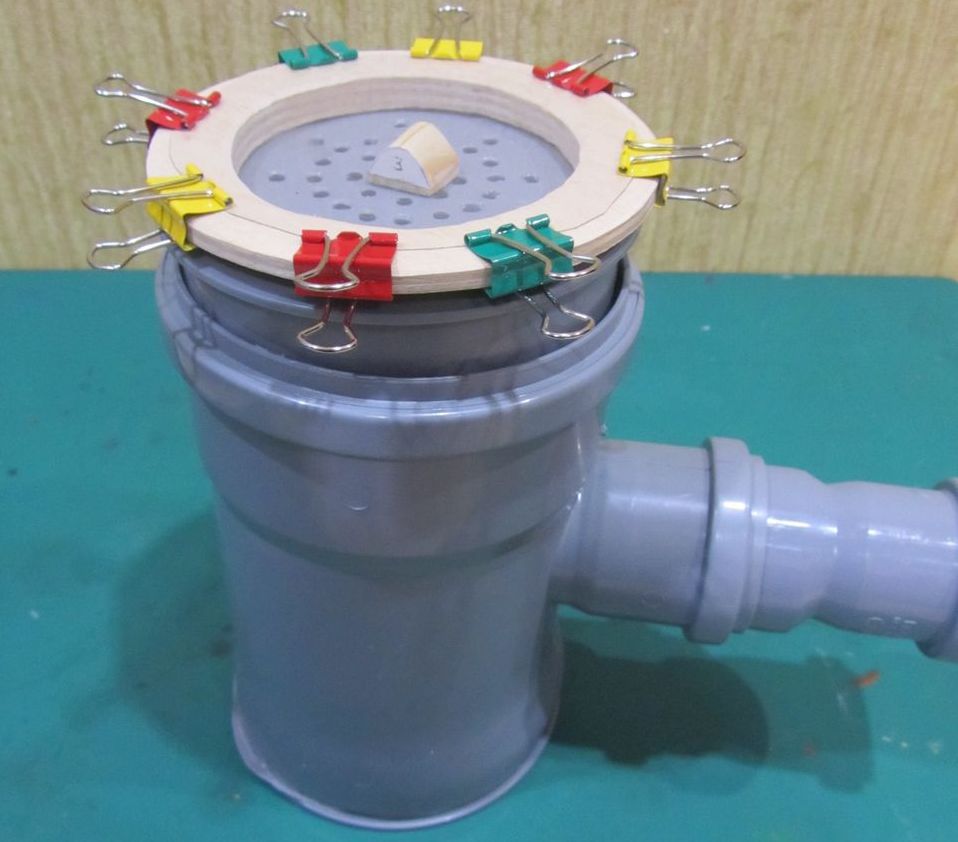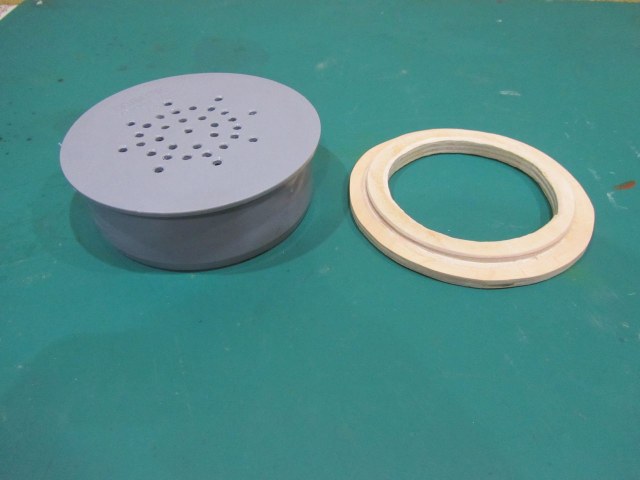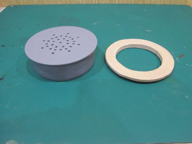 В течении 15 минут разогрел низ тройника промышленным феном, после того как пластик стал мягким, воткнул заглушку. Во второй заглушке насверлил отверстий. Вырезал из куска 10 мм. фанеры круг, отметил центр и в течении 10 минут сделал ступеньку с помощью проксоновской станины и бормашинки.