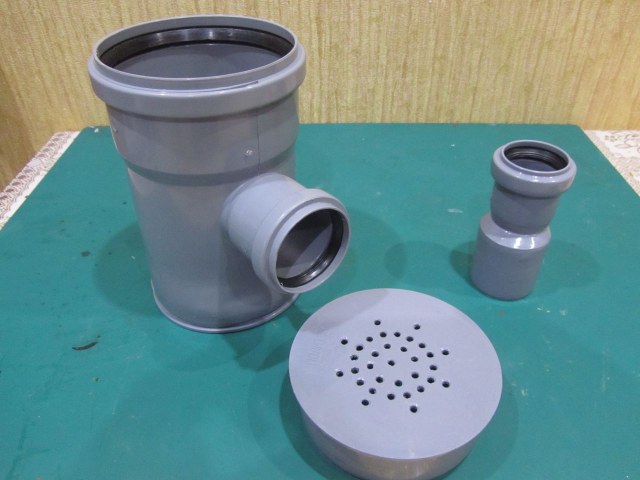 тройник 110 мм. с выходом на 50 мм., две заглушки, переходник 50-40 мм. (для подключения пылесоса). Итого потрачено 141 руб. + в канцелярском магазине за 60 руб. зажимы.