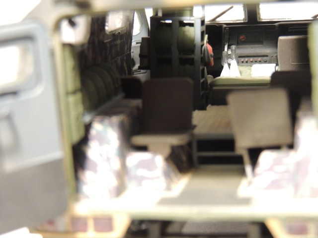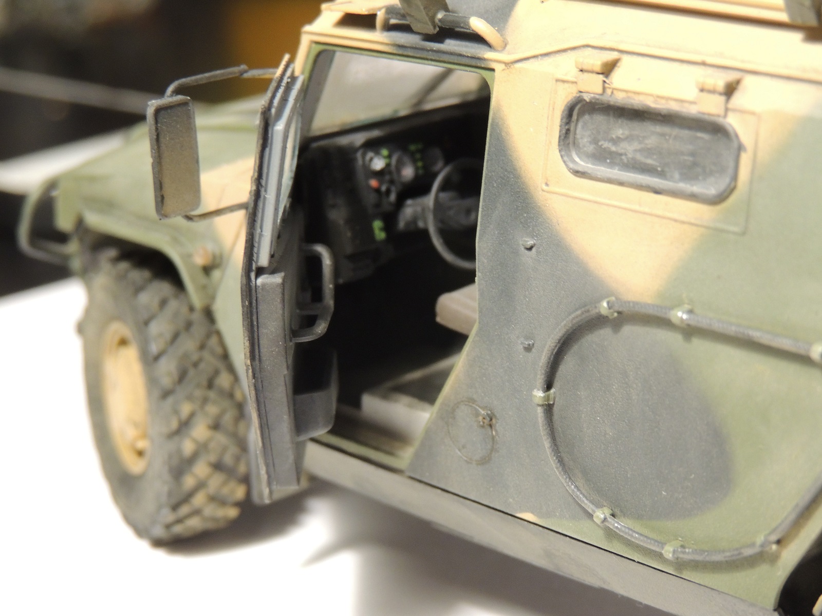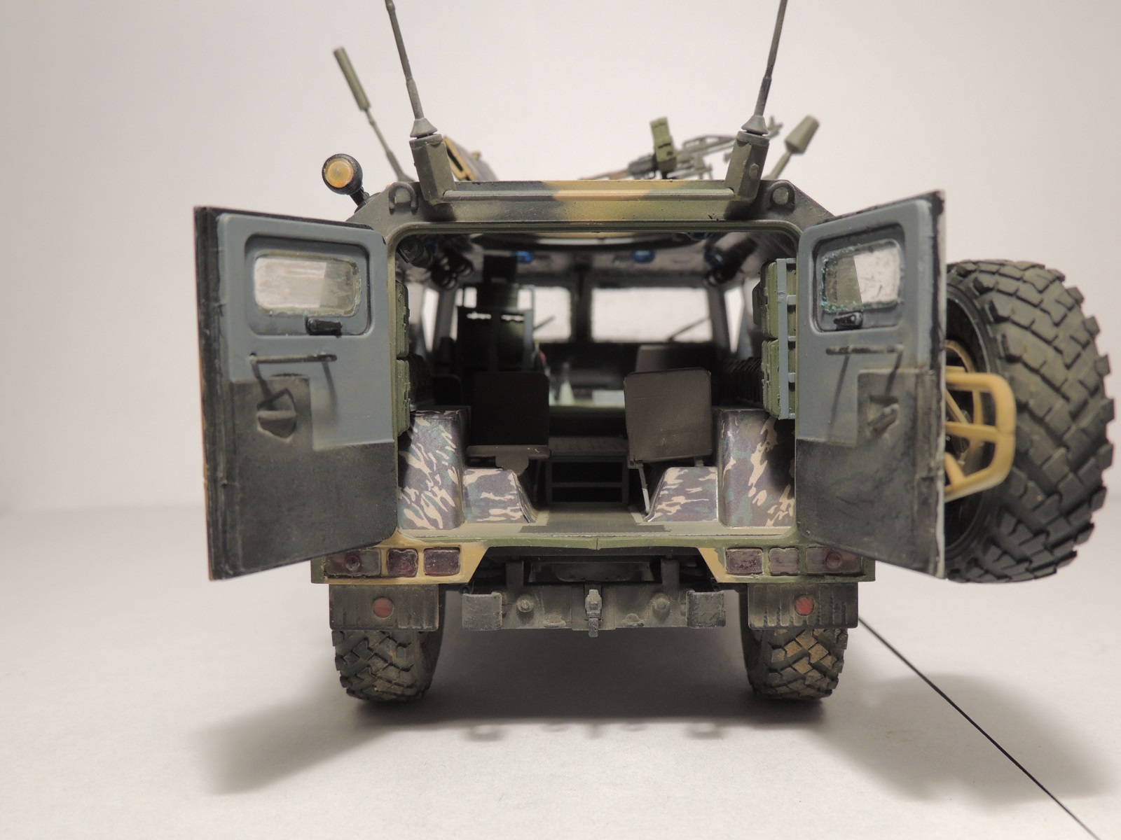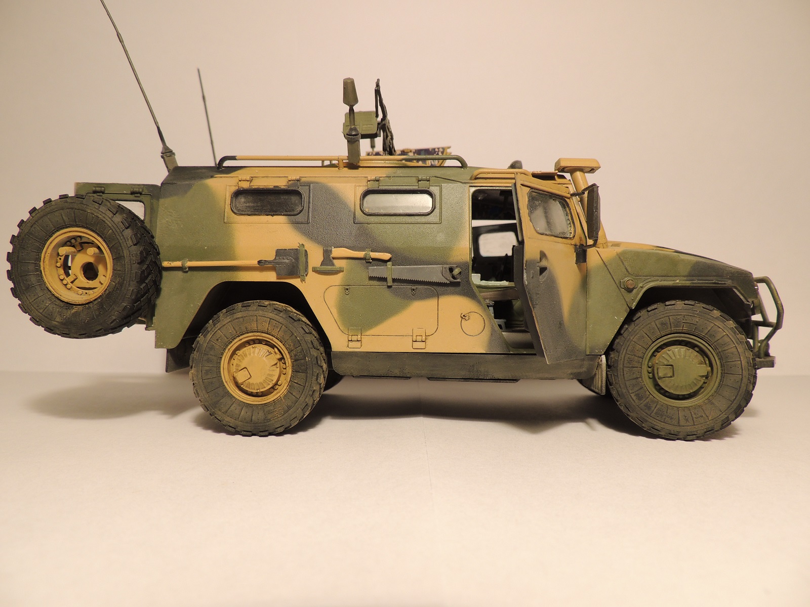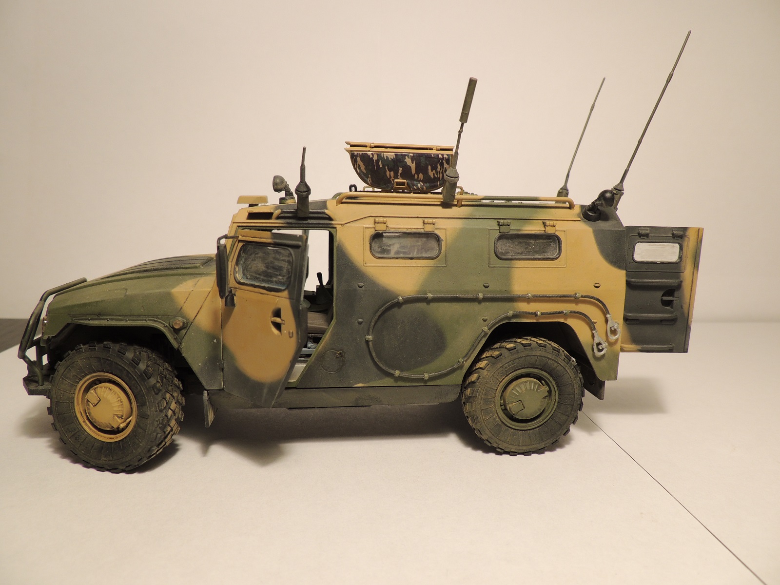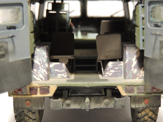 В целом, впечатление от модели благоприятное. На виде спереди и с боков всё неплохо, а вот на виде сзади, при открытых дверях заметны "косяки" неаккуратной покраски и сборки. В частности, на бампере чётко просматривается незашкуренный след от половинок пресс-формы. На внутренних ручках боковых дверей тоже. Покраска торцов дверей очень неровная. Подозреваю, что просто хотелось закончить машину побыстрее. Поскольку заявлена чистая "изкоробка", то придираться к тому, что крепления антенн "Пелены" к наружным рукояткам и проводка отсутствуют, не буду.