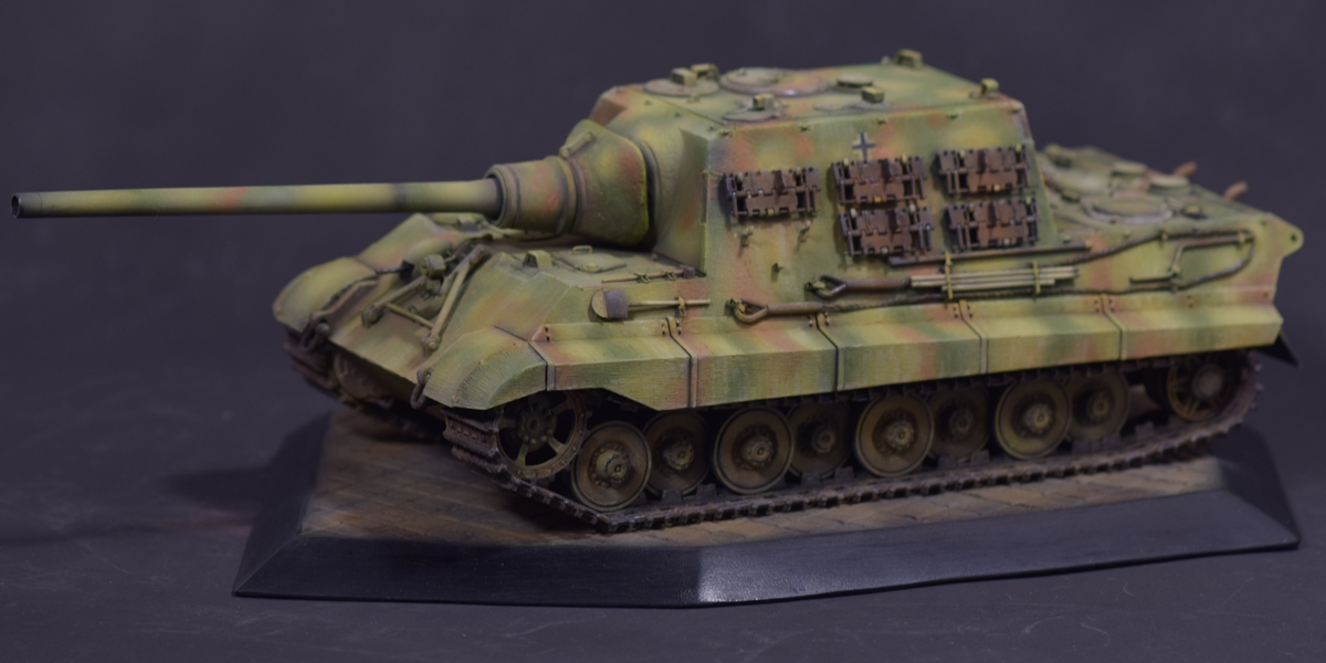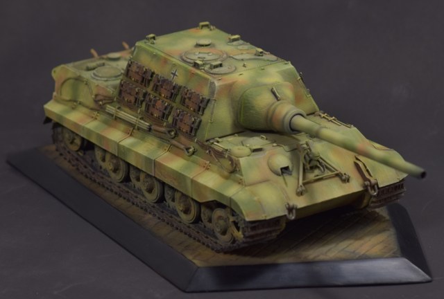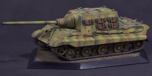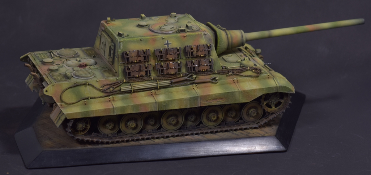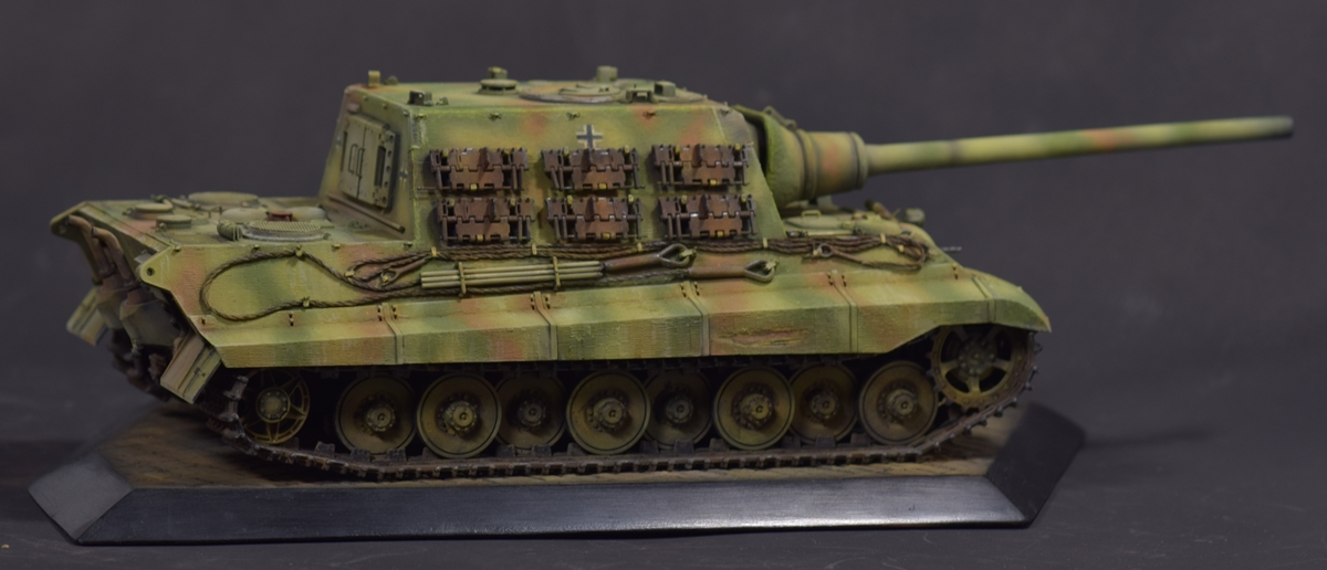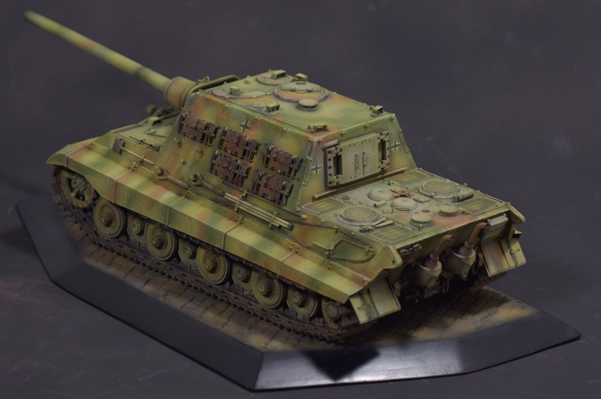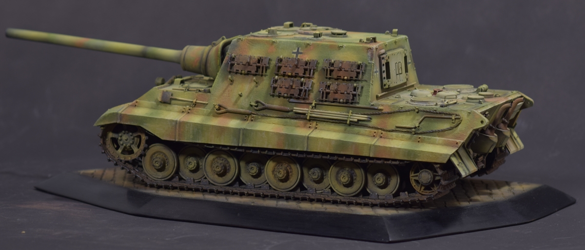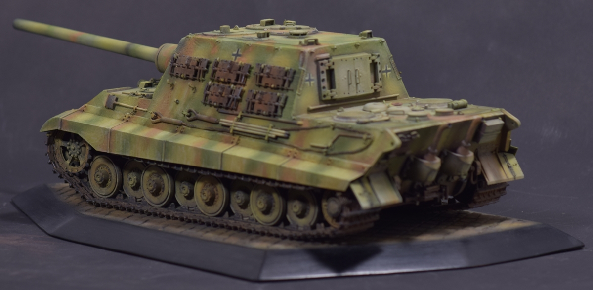 Из того, что удается рассмотреть понравилось практически все - аккуратная сборка, качественный везеринг. Для ранних машин (ходовая Порше с циммеритом) не характерно крепление траков на броне в три ряда, хотя в период эксплуатации могли наварить креплений где угодно. На мой взгляд, не помешал бы крупным планом верхний ракурс на кормовую часть - к сожалению ничего не рассмотреть.