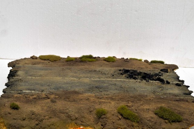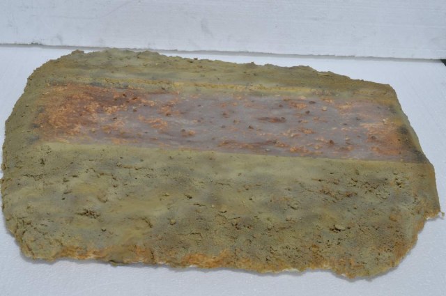 Делаю первый замес из смолы и песка. Готовой массой смазываю полностью поверхность будущей подставки. Там, где в будущем будет обочина, присыпаю песком и различной величины камушками. В результате после высыхания (минимум 24 ч.) получится вот такая шершавая на вид заготовка (фото 6).