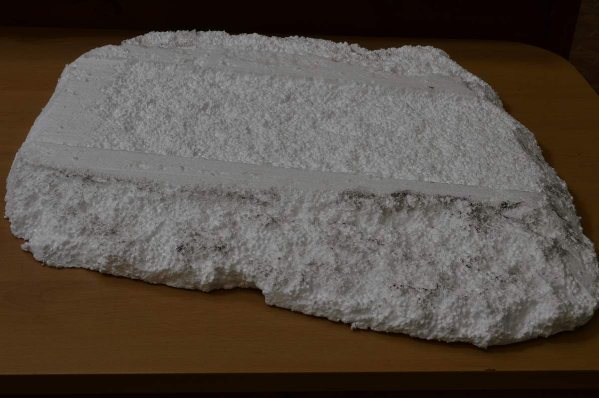 Далее я формирую само основание произвольной формы. Рельеф самого основания очень легко обрабатывается руками, но я использую для этого смоченную в ацетоне марлю. Аккуратно чтобы не заплавить материал, т.е. полистирол, формирую нужный мне рельеф. Пользуясь ацетоном, проводите работу в хорошо проветриваемом помещении, можно на балконе или на улице (фото 5). Ширину асфальта в масштабе 1/35 сделал 200 мм.
