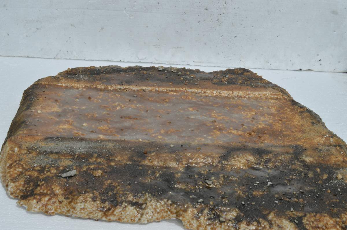 Теперь основное… Делаю замес асфальтовой массы. В готовую смолу засыпаю песок и тщательно перемешиваю. Затем добавляю полифепан и также тщательно перемешиваю. Получается густая коричневая масса, в которую добавляю сажу маленькими порциями. Добавлять сажу надо очень аккуратно. Работать желательно в перчатках. Сыпать сажу так, чтобы не пылила, в противном случае всё кругом будет чёрным. По возможности эту массу можно приготовить на улице или в гараже, не боясь того что она застынет.