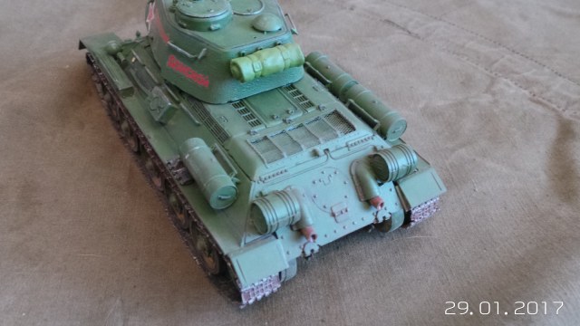 М-да... Со стыками деталей, следами от половинок прессформ и толкателей, действительно беда. Насчёт цвета тоже совершенно справедливо сказано, что для боевой машины он не тот. Но! Танк именно в таком цвете будет замечательно смотреться на постаменте памятника. Только скатку брезента с башни убрать. Сколько их у нас таких по всей стране стоит? И красят их обычно перед 9 мая той зелёной краской, на какую разорились, скрепя сердце, местные власти. Так что, лично моё мнение, из этой модели ещё можно сделать очень неплохую виньетку.