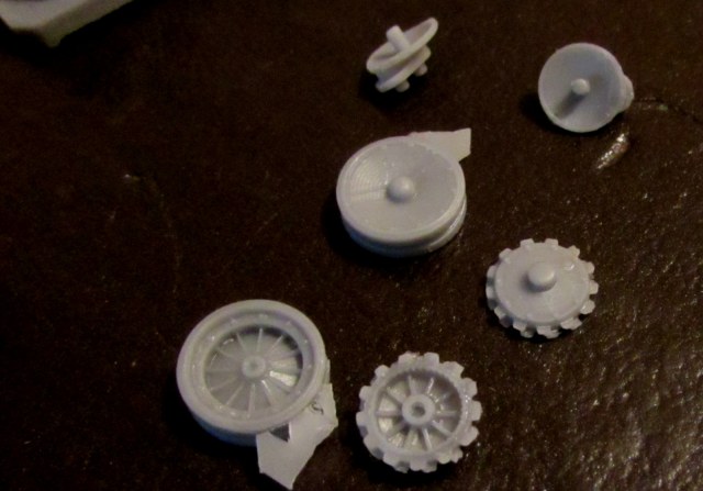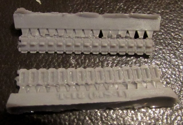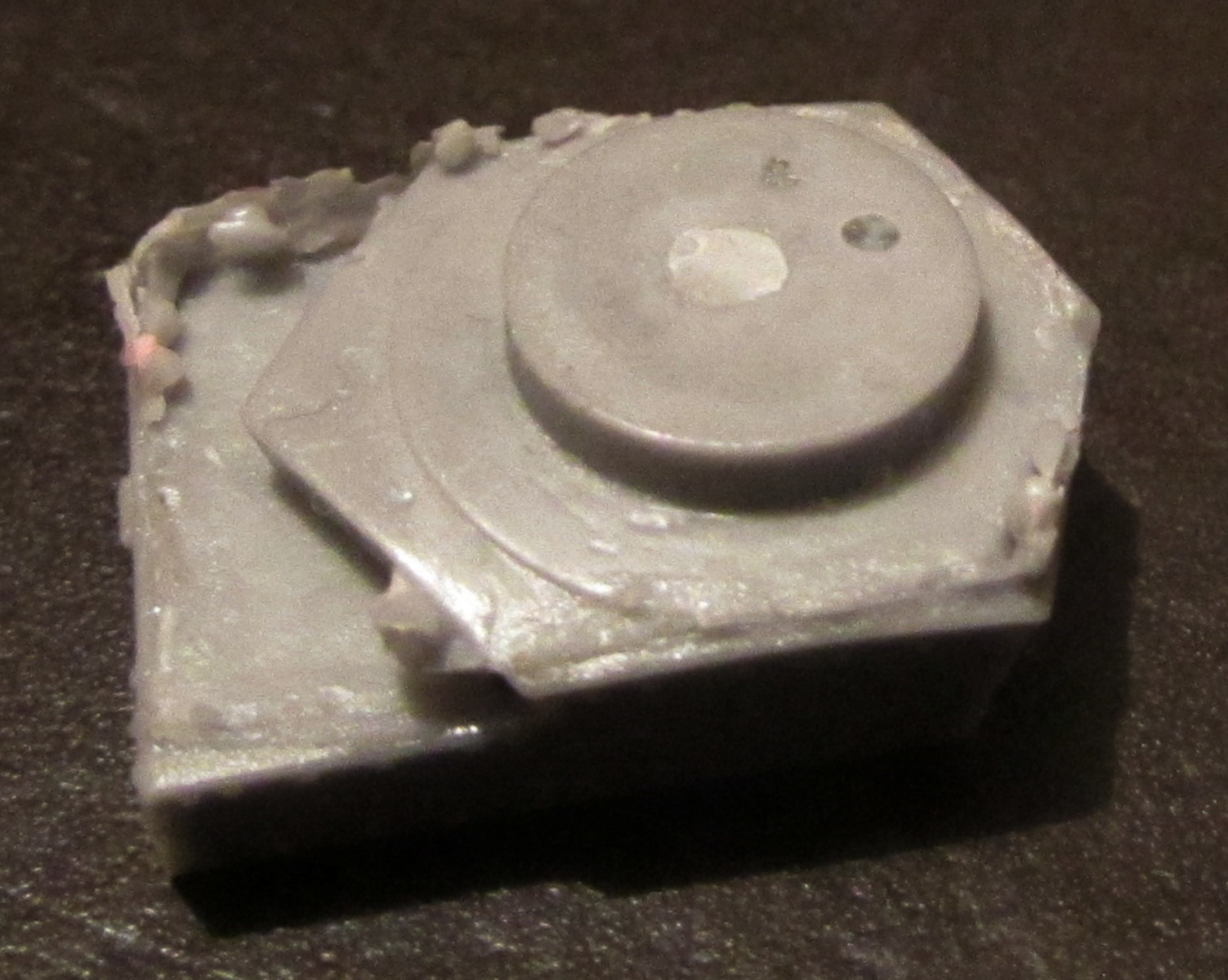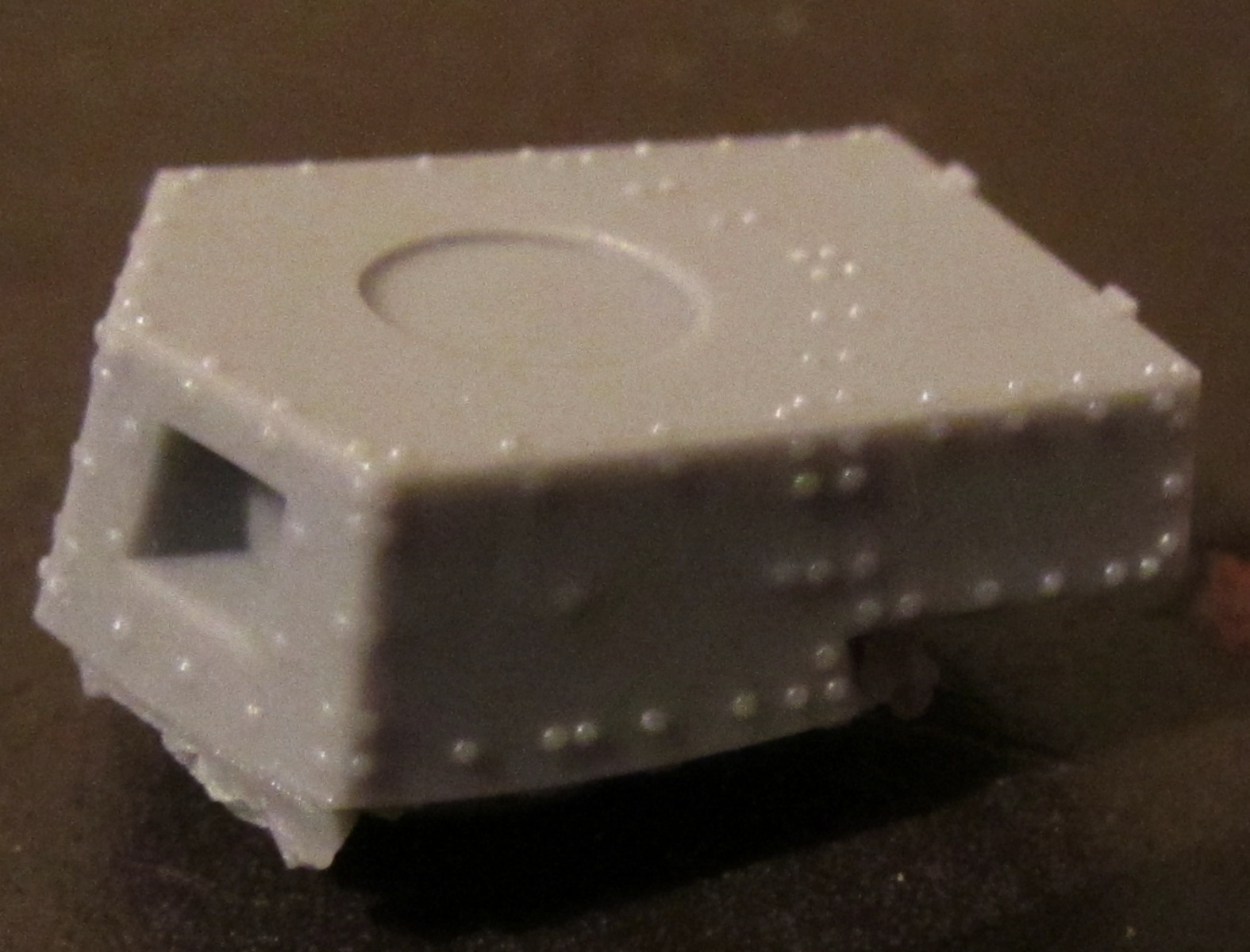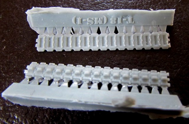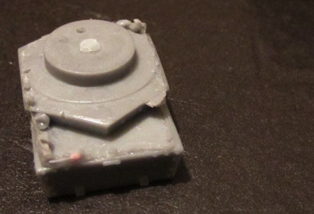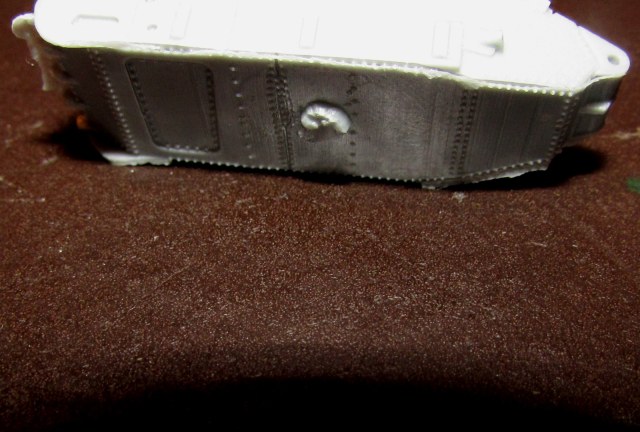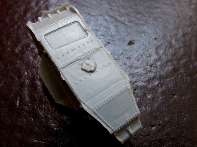 Литье приличное, хоть и с непроливом в корме и облоем по периметру корпуса и башни. Смола светло-серая, грубоватая, с изрядным количеством облоя - причем облой очень твердый. Клепка есть, она хорошая - но в погоне за масштабностью ее сделали настолько мелкой, что боишься красить даже баллончиком (а ведь еще как-то грунтовать надо будет!). Кстати, здесь дело обстоит еще хуже - из-за падения качества клепка мелкая и УЖЕ замыленная. Красить будет еще страшнее.