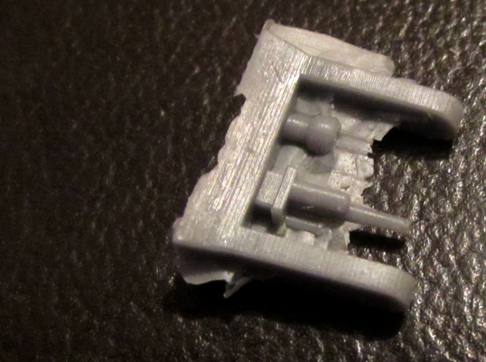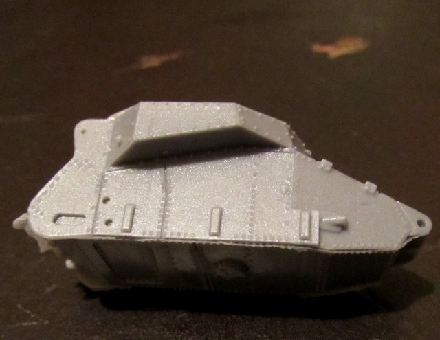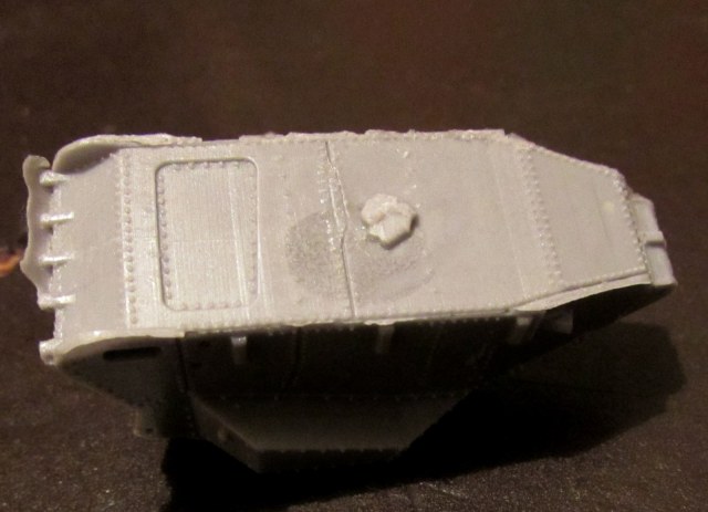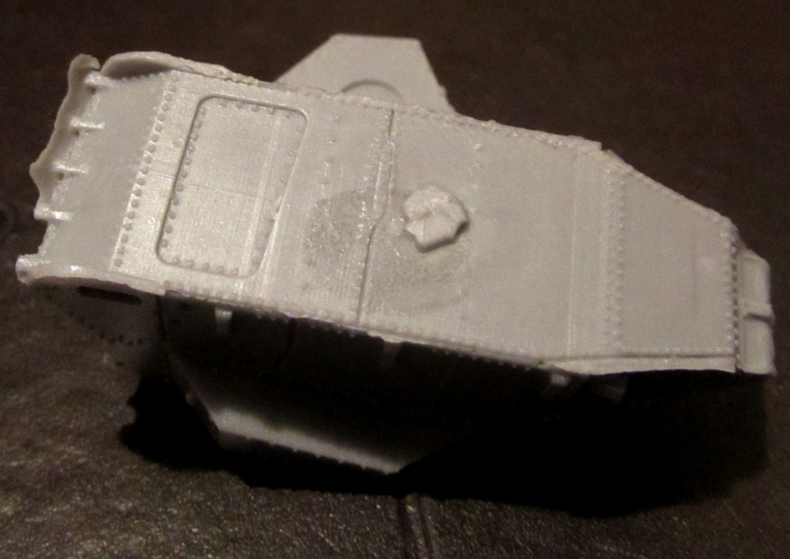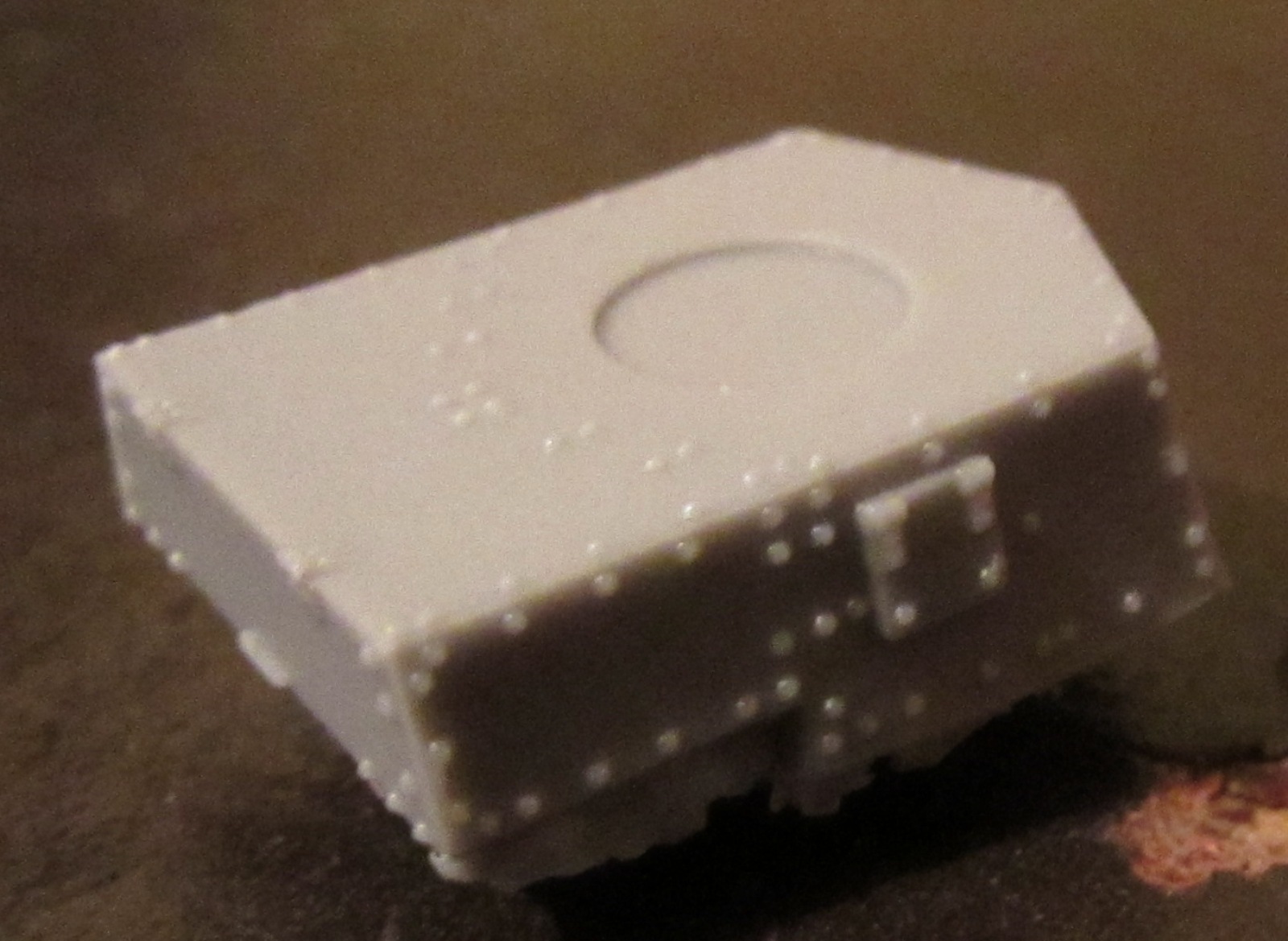 Литье приличное, хоть и с непроливом в корме и облоем по периметру корпуса и башни. Смола светло-серая, грубоватая, с изрядным количеством облоя - причем облой очень твердый. Клепка есть, она хорошая - но в погоне за масштабностью ее сделали настолько мелкой, что боишься красить даже баллончиком (а ведь еще как-то грунтовать надо будет!). Кстати, здесь дело обстоит еще хуже - из-за падения качества клепка мелкая и УЖЕ замыленная. Красить будет еще страшнее.
