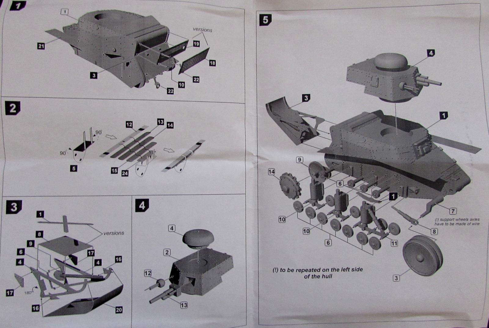 Ходовая сделана хорошо, подробно - но какая же она непрочная! Вроде и клеишь аккуратно, - а вечно что-то ломается. Все настолько тоненькое, что и гуляет туда-сюда, и ломается, и клеится трудно. Как будто мало этого - так еще и все пипочки-балансиры длиннее раза в 3, чем надо. Хочешь крепить катки на тележки - отрубай эти пипочки начисто, иначе уродство и кошмар. Поддерживающие ролики тоже должны быть сдвоенными - но даны одинарными; никаких стоек не предусмотрено (хотя в инструкции показаны!).