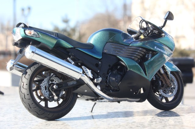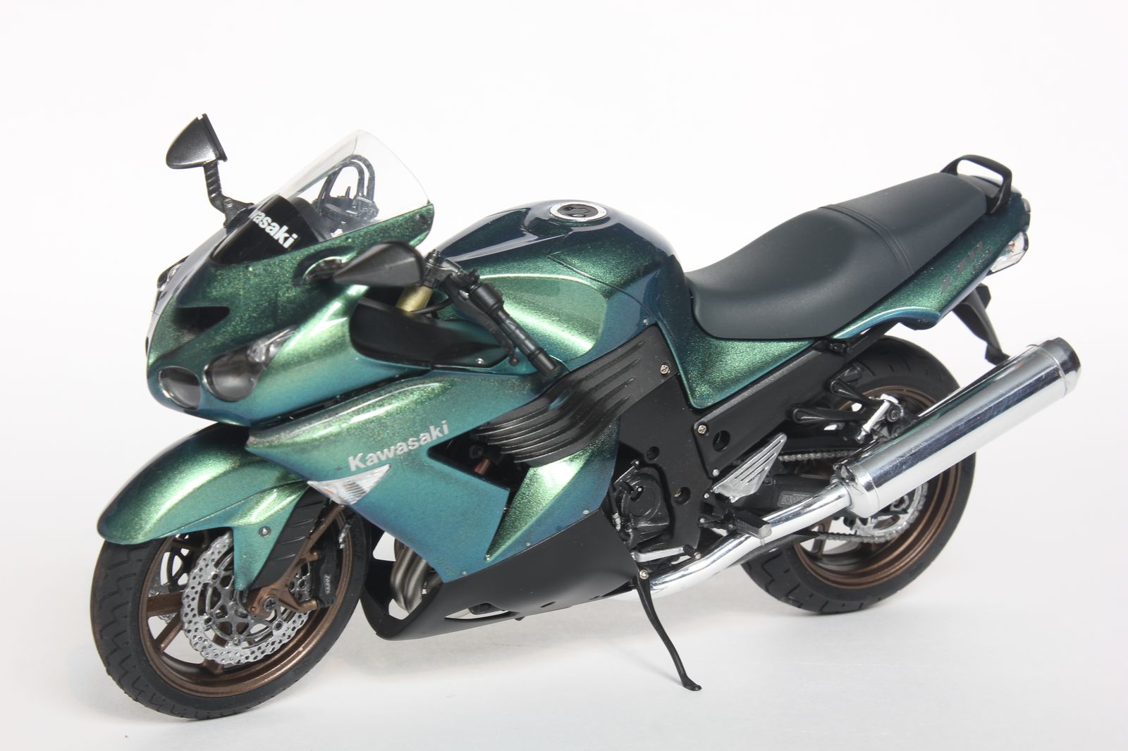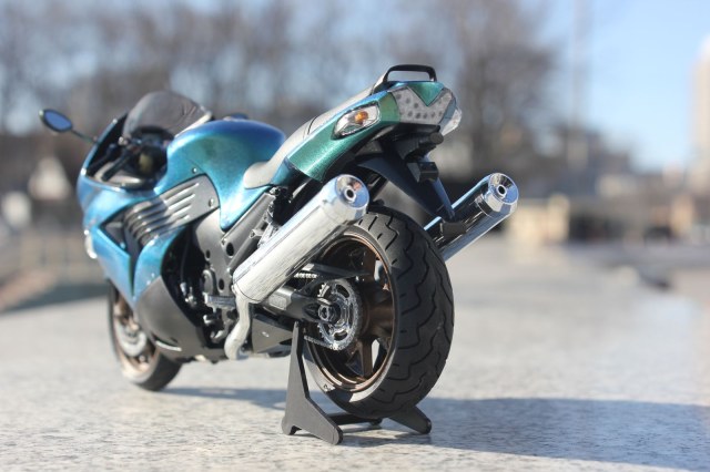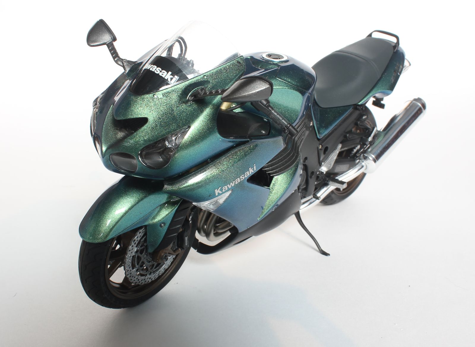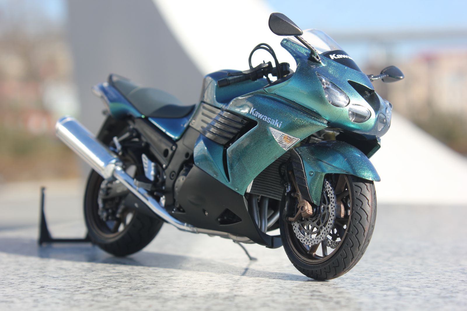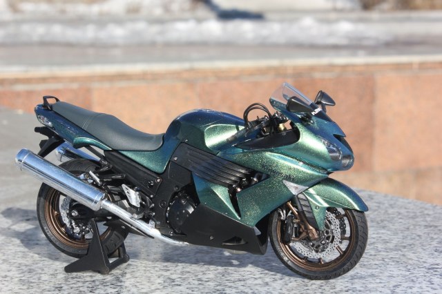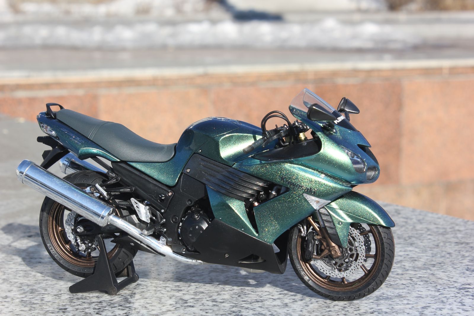 Хочу представить Вашему вниманию Kawasaki ZZR 1400 в 1/12. Цвет Tamiya PS iridescent Blue/Green на черный мат. Сверху 2К лак MS. В живую при солнечном освещении цвет просто шикарный. Зеленый и синий. Поймать на фотоаппарарт сложно.
