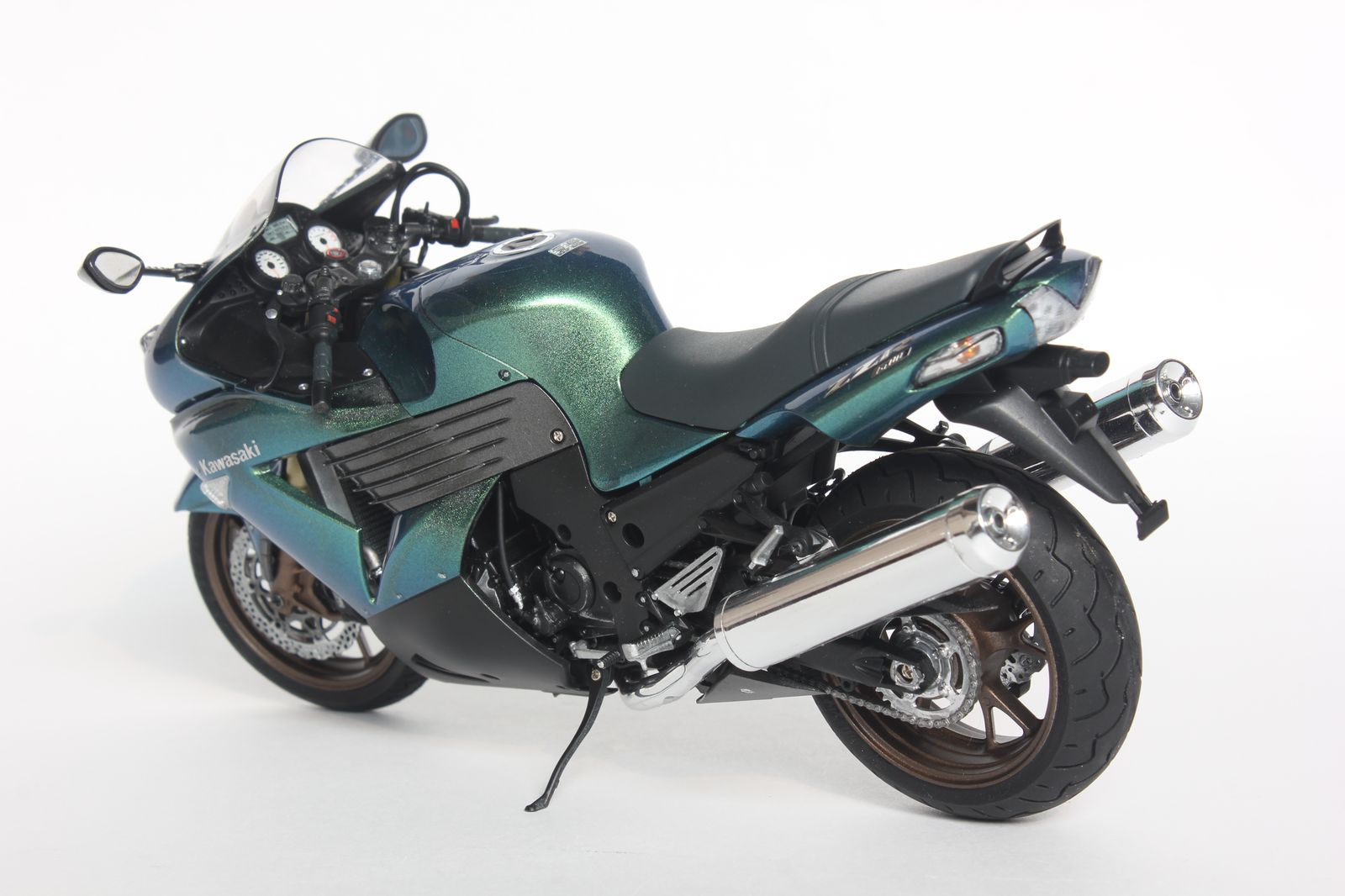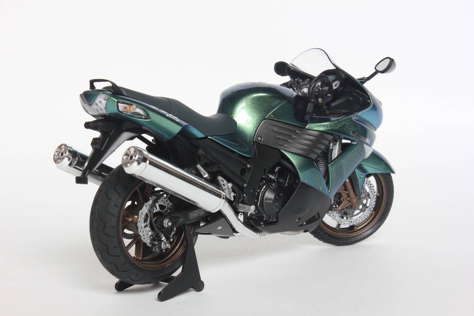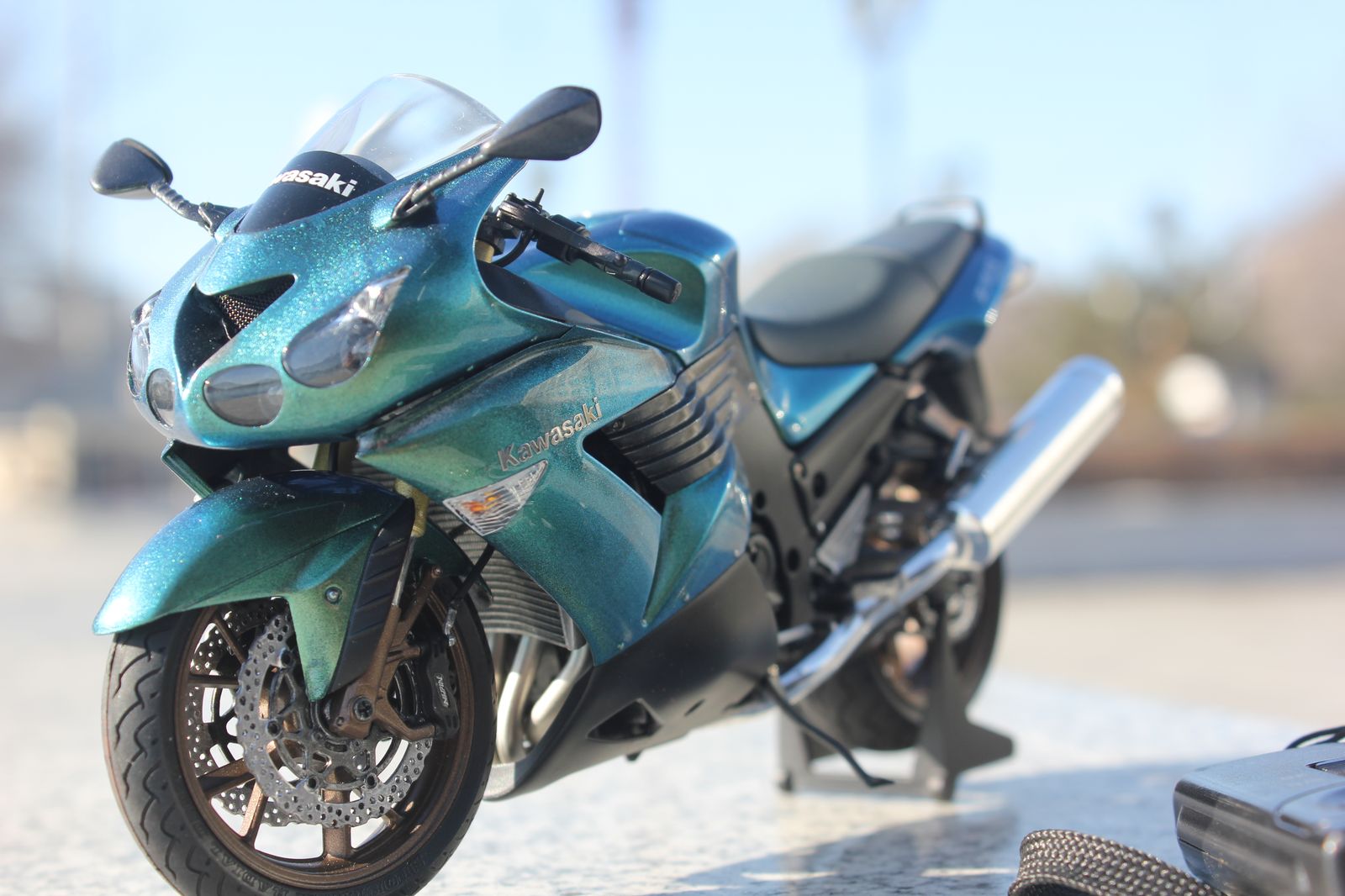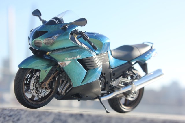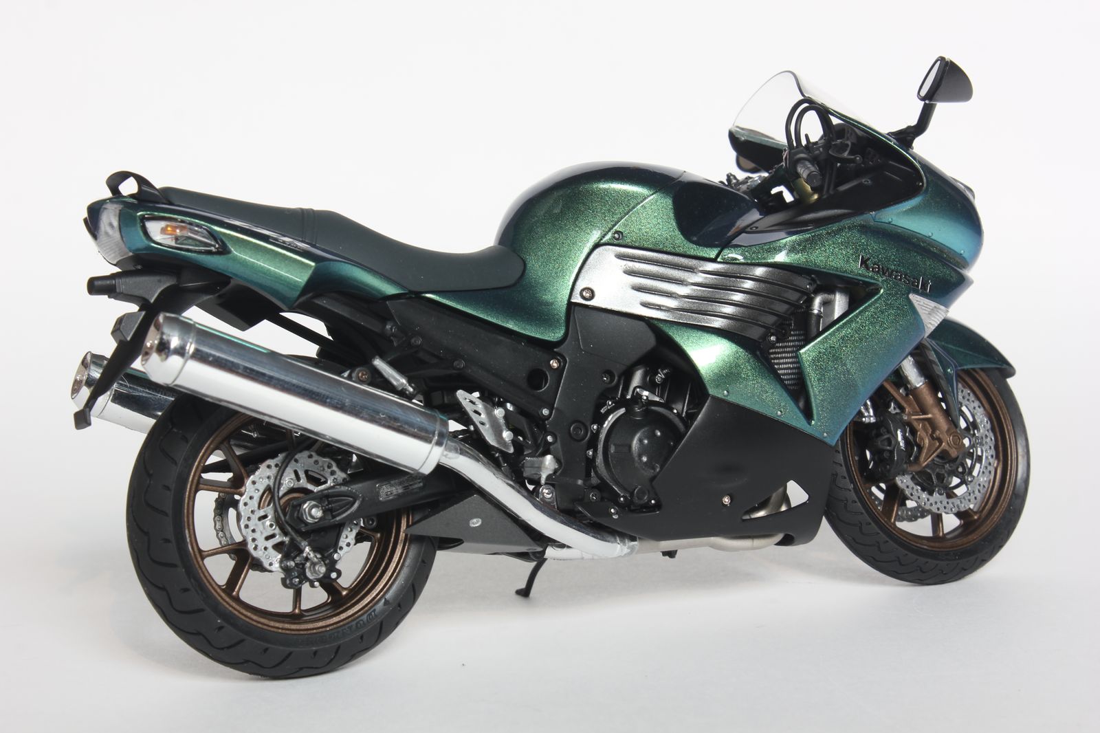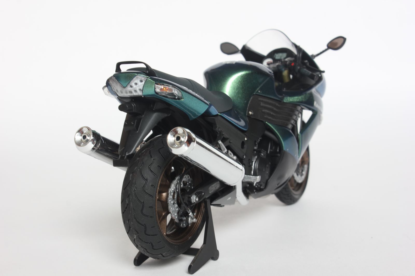Хочу представить Вашему вниманию Kawasaki ZZR 1400 в 1/12. Цвет Tamiya PS iridescent Blue/Green на черный мат. Сверху 2К лак MS. В живую при солнечном освещении цвет просто шикарный. Зеленый и синий. Поймать на фотоаппарарт сложно.