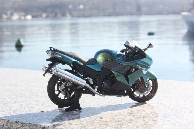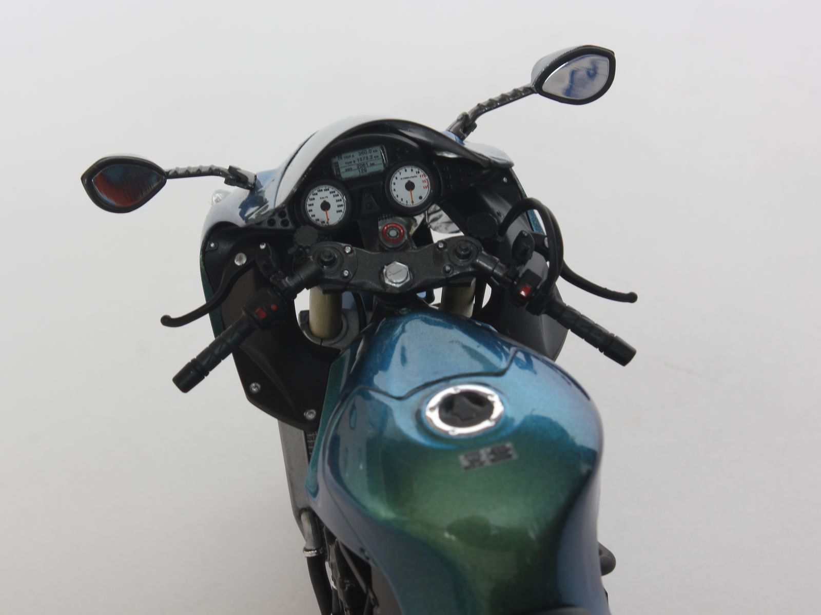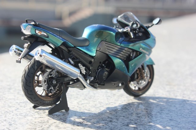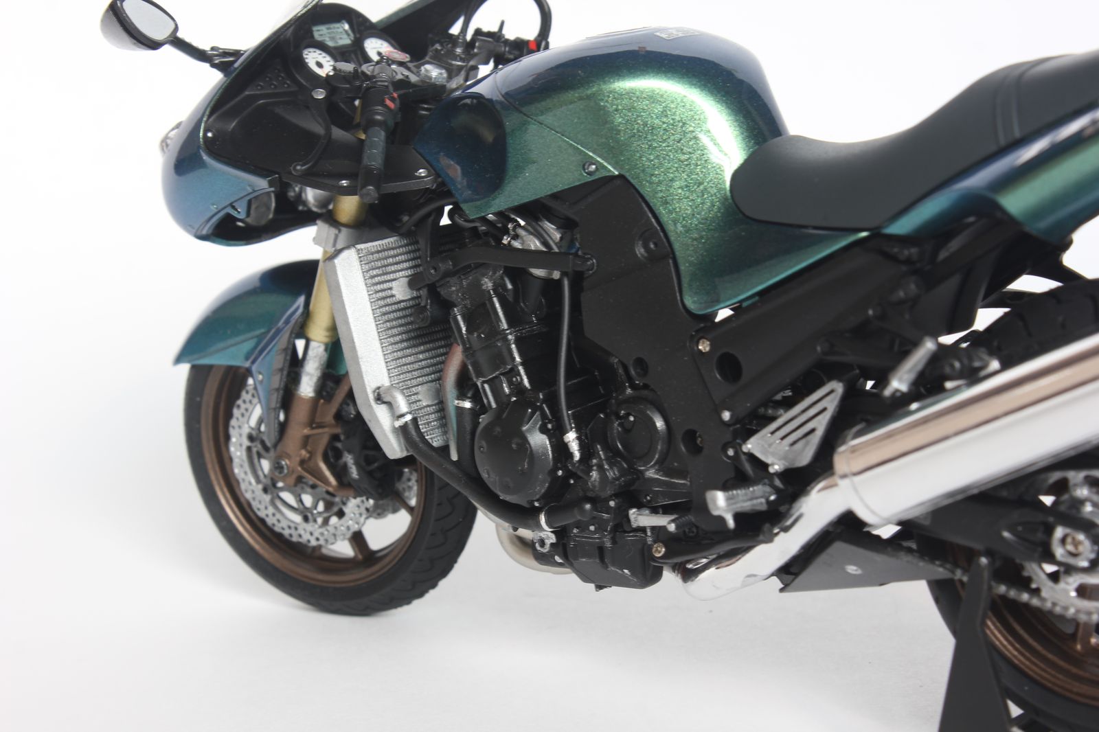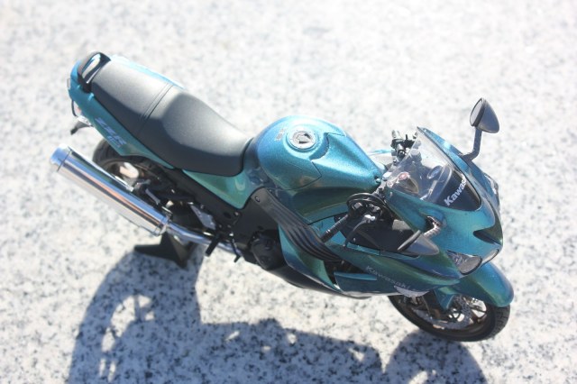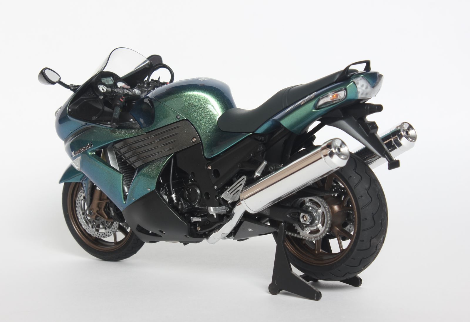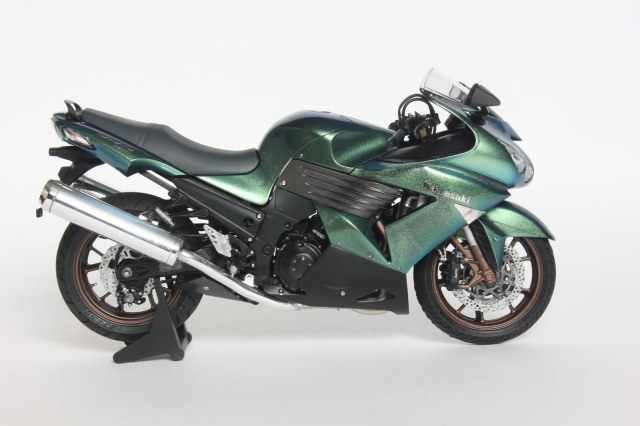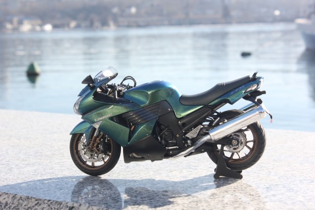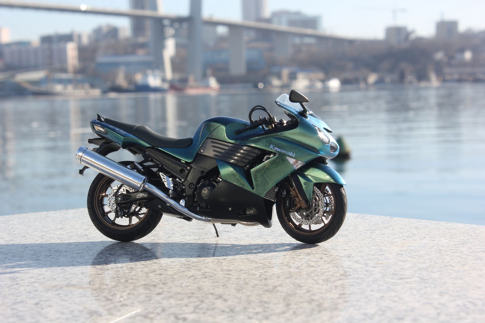 Хочу представить Вашему вниманию Kawasaki ZZR 1400 в 1/12. Цвет Tamiya PS iridescent Blue/Green на черный мат. Сверху 2К лак MS. В живую при солнечном освещении цвет просто шикарный. Зеленый и синий. Поймать на фотоаппарарт сложно.