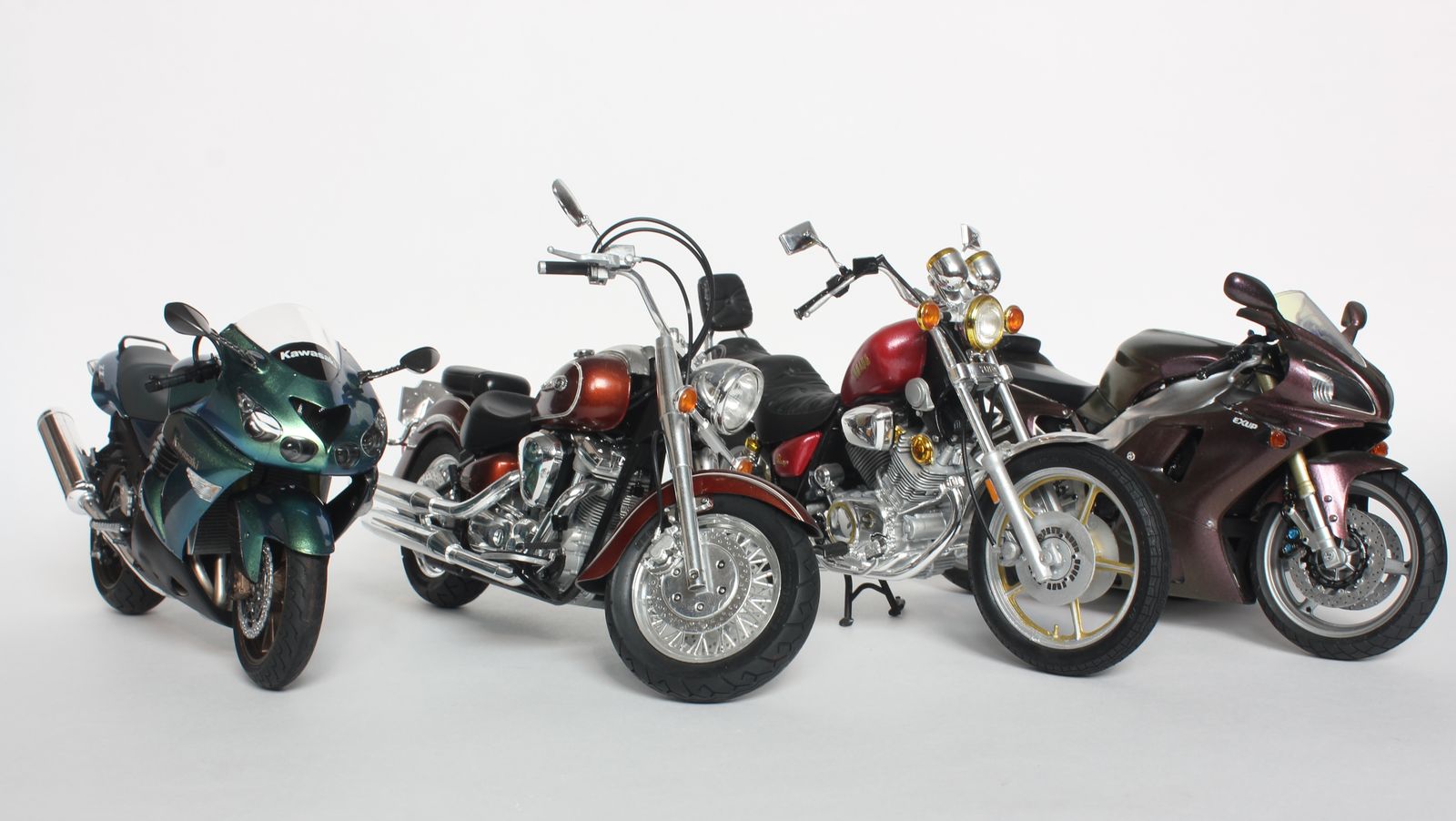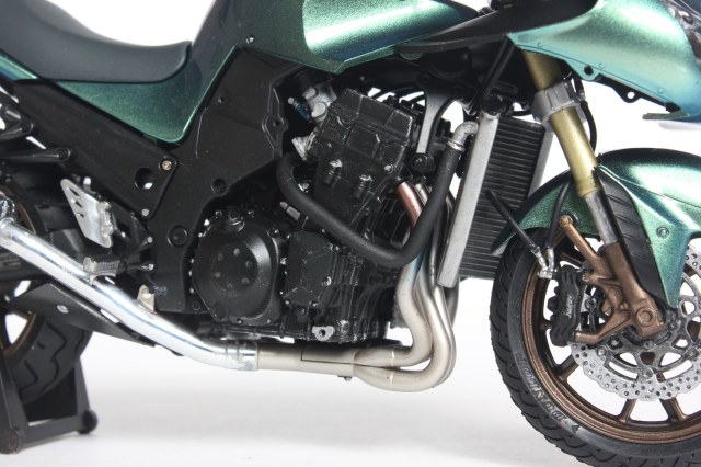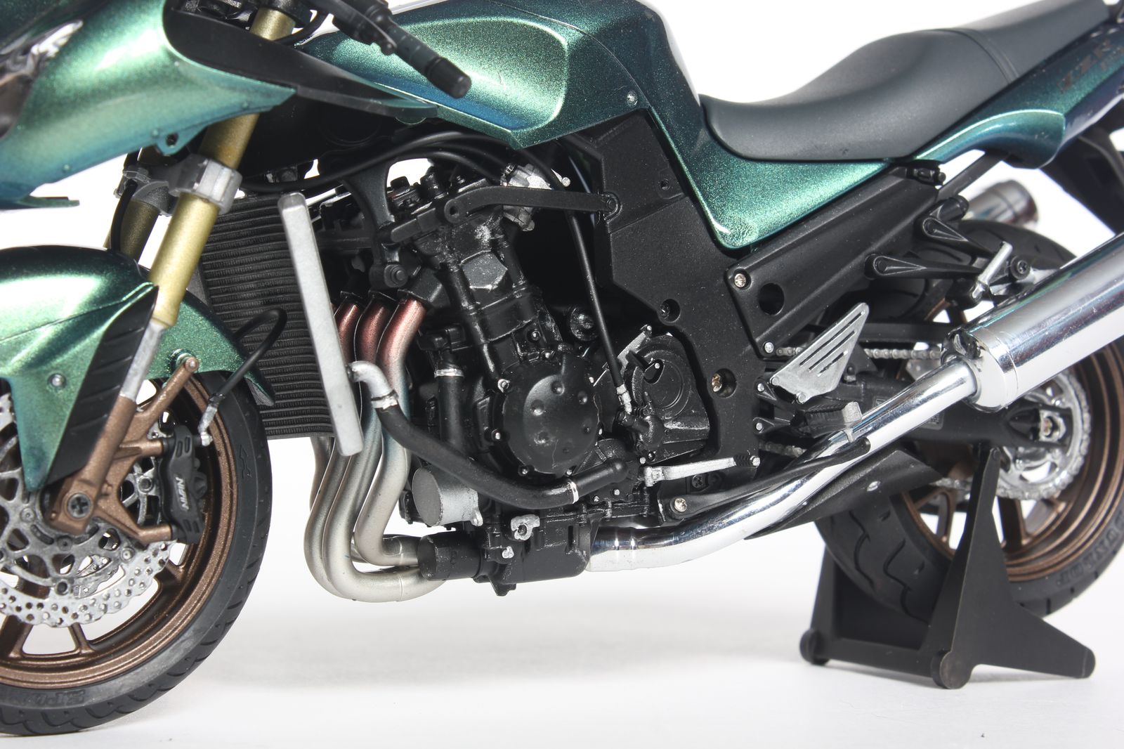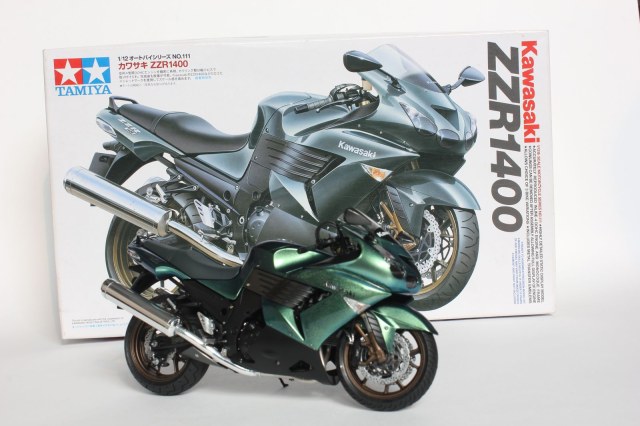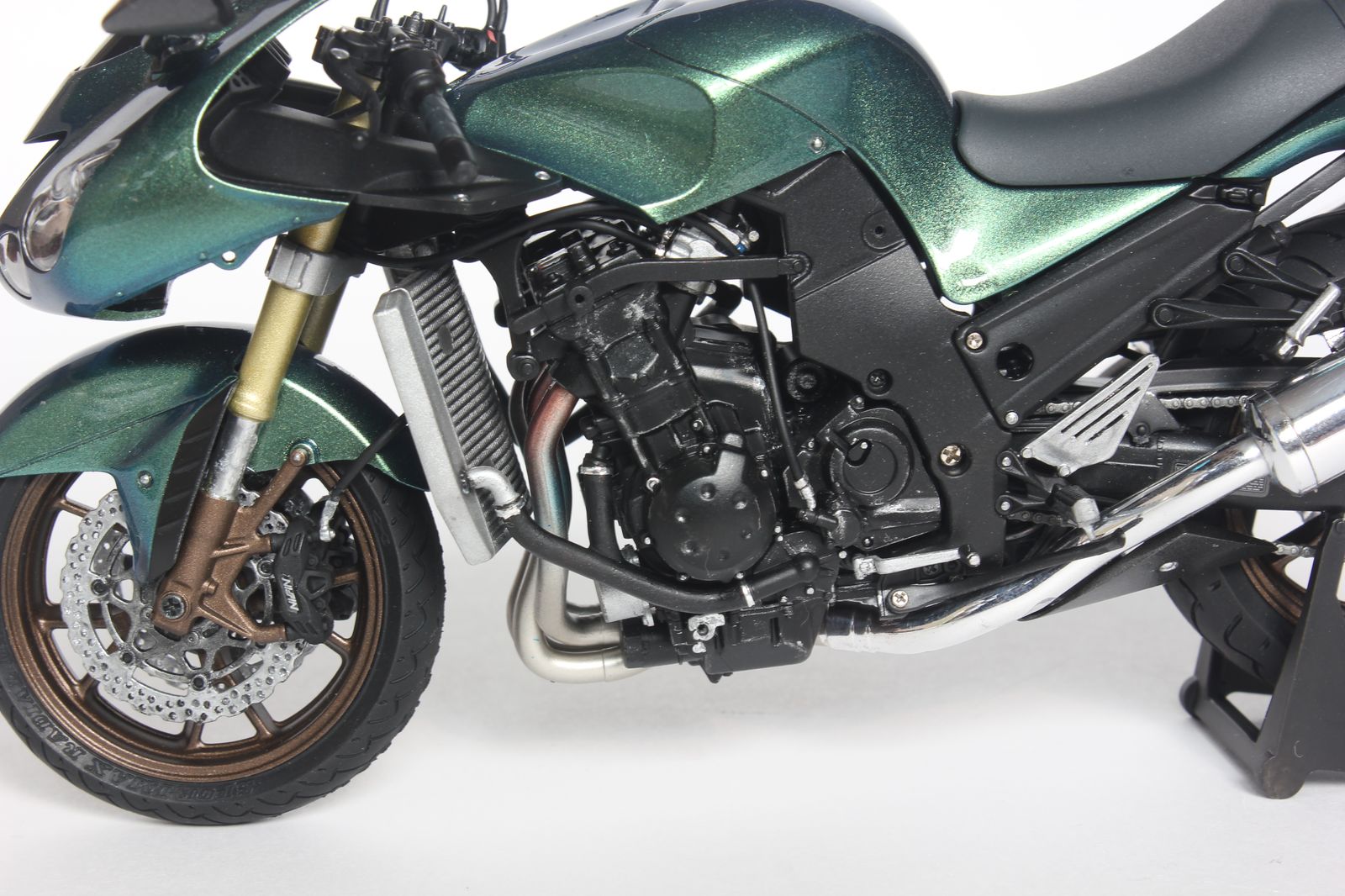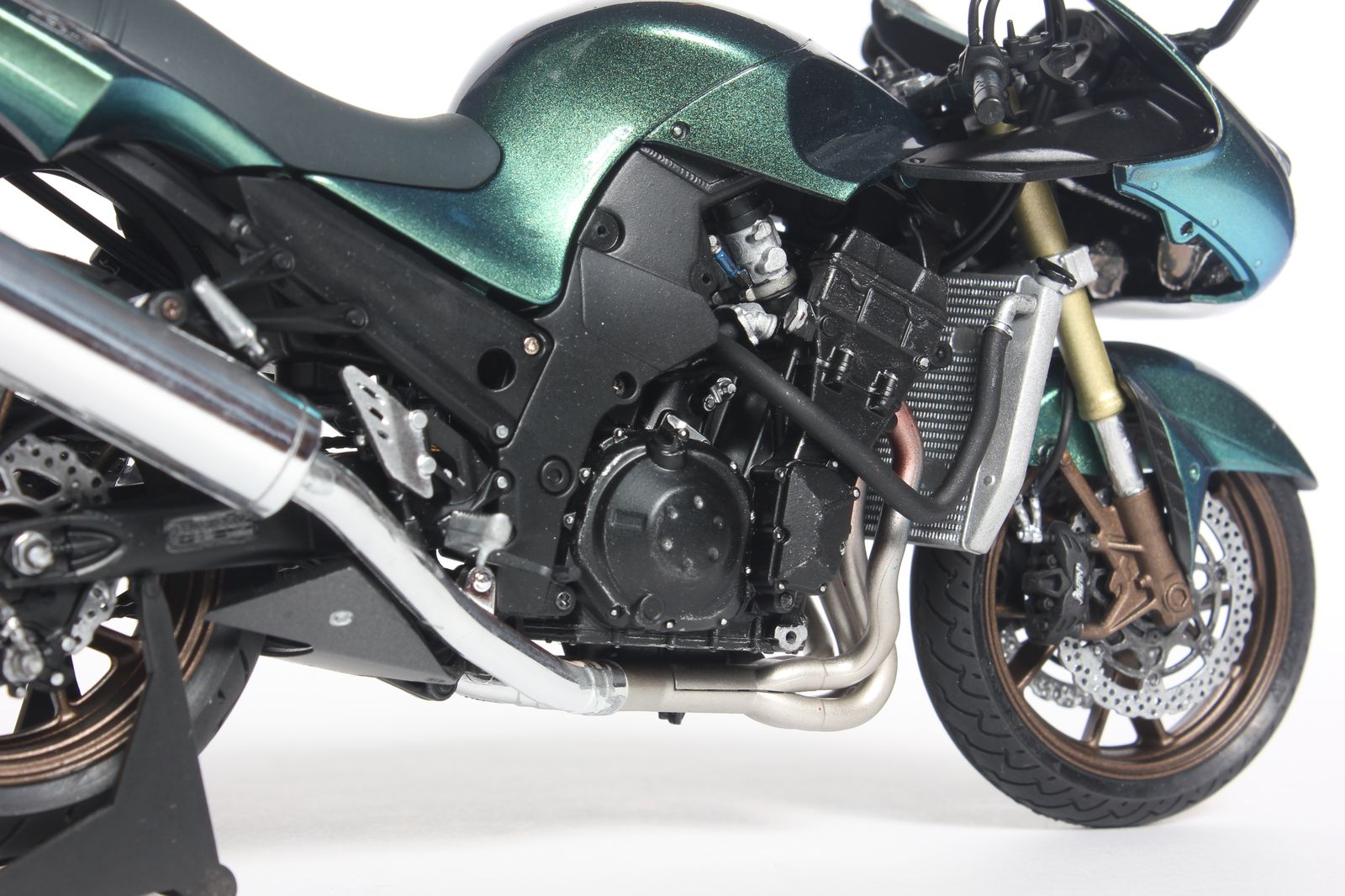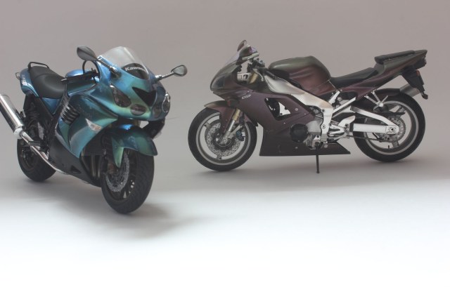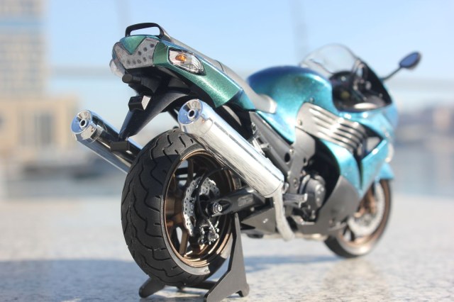 Хочу представить Вашему вниманию Kawasaki ZZR 1400 в 1/12. Цвет Tamiya PS iridescent Blue/Green на черный мат. Сверху 2К лак MS. В живую при солнечном освещении цвет просто шикарный. Зеленый и синий. Поймать на фотоаппарарт сложно.