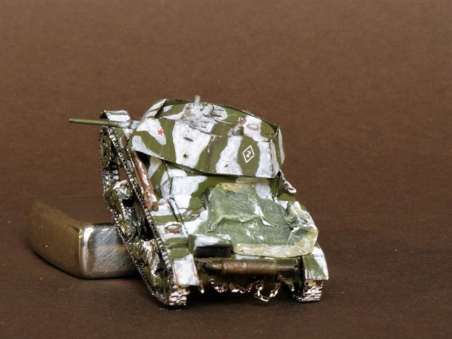Опробовал технику "накинутого брезента", ведь по замыслу танк стоял/ночевал в морозном зимнем лесу и бойцы частично зачехлили моторный отсек. Красная звезда и тактический номер на башне добавлены для эстетического восприятия и визуального дополнения.