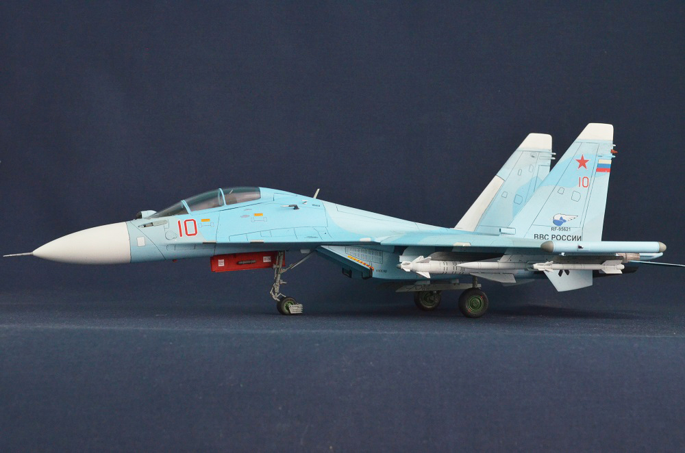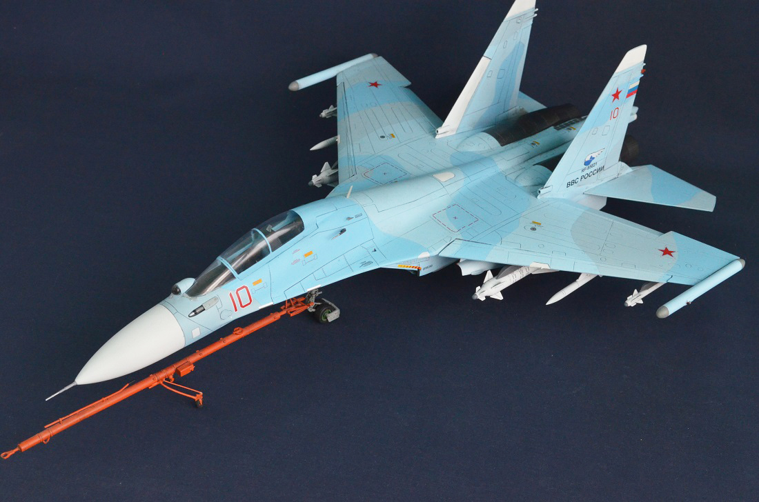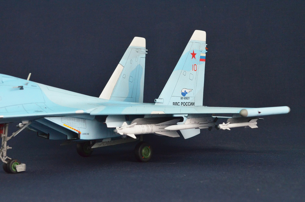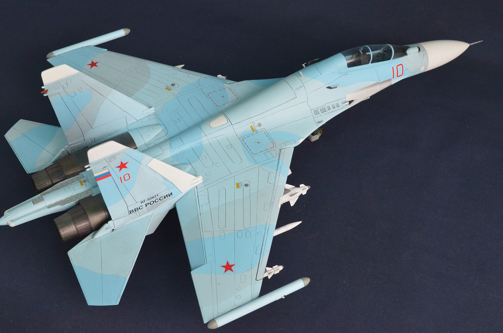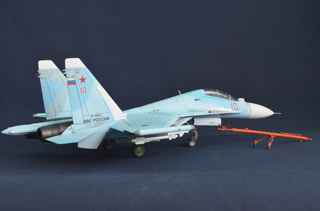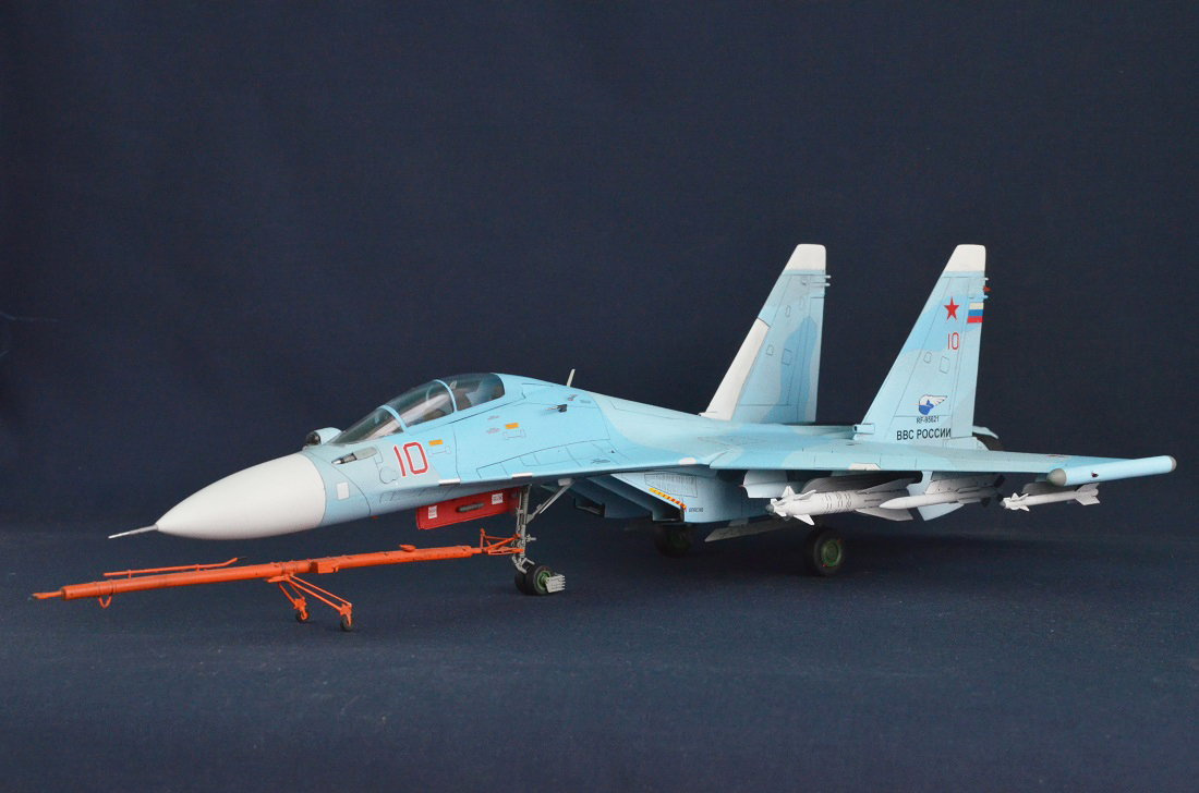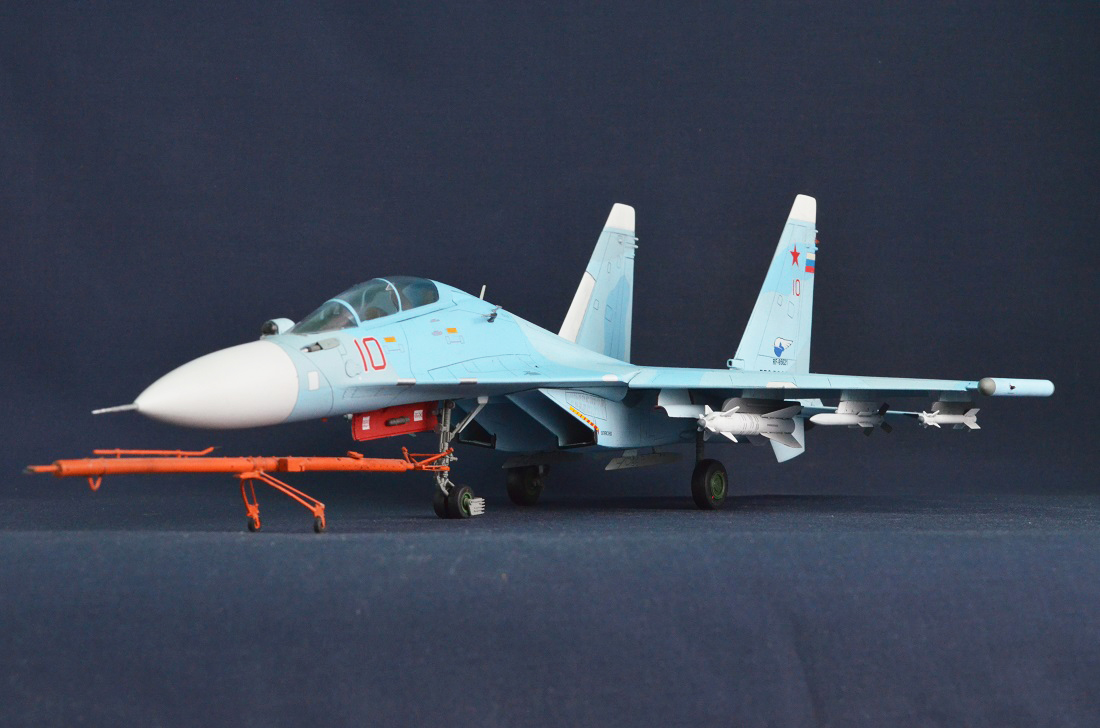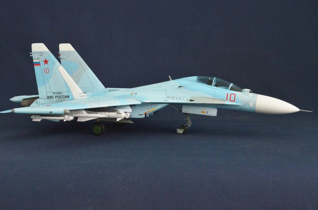 Что собой представляет данный набор выпущенный в 2014 году , собственно старый Су-27 УБ дополненный новыми литниками с деталями характерным конструктивными изменениями в конструкции планера, это носовая часть со смещенным к правому борту ОЛС, штанги дозаправки топливом. На кили данный производитель не стал замарачиватся и оставил их старыми, хотя они имеют совсем другую форму.