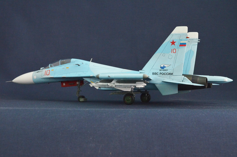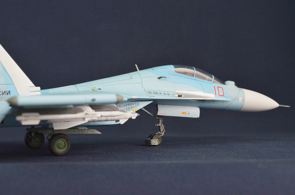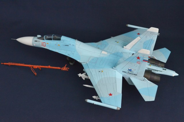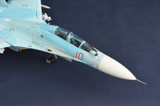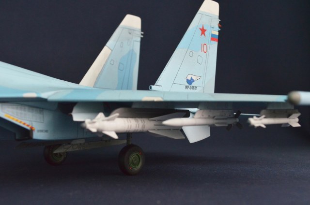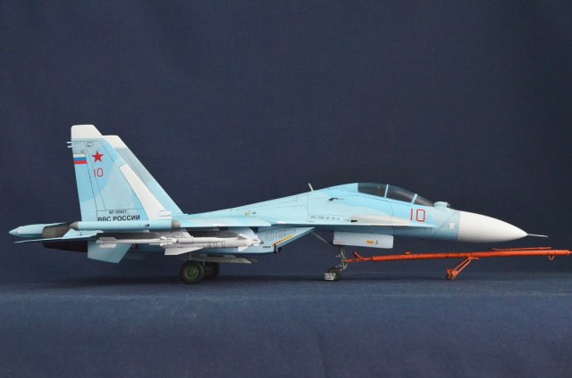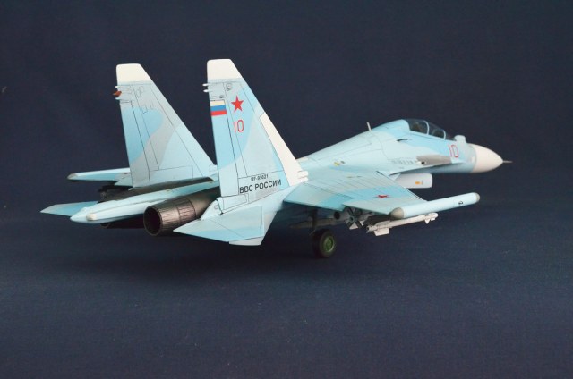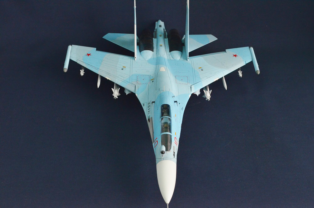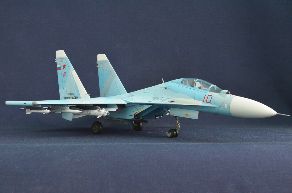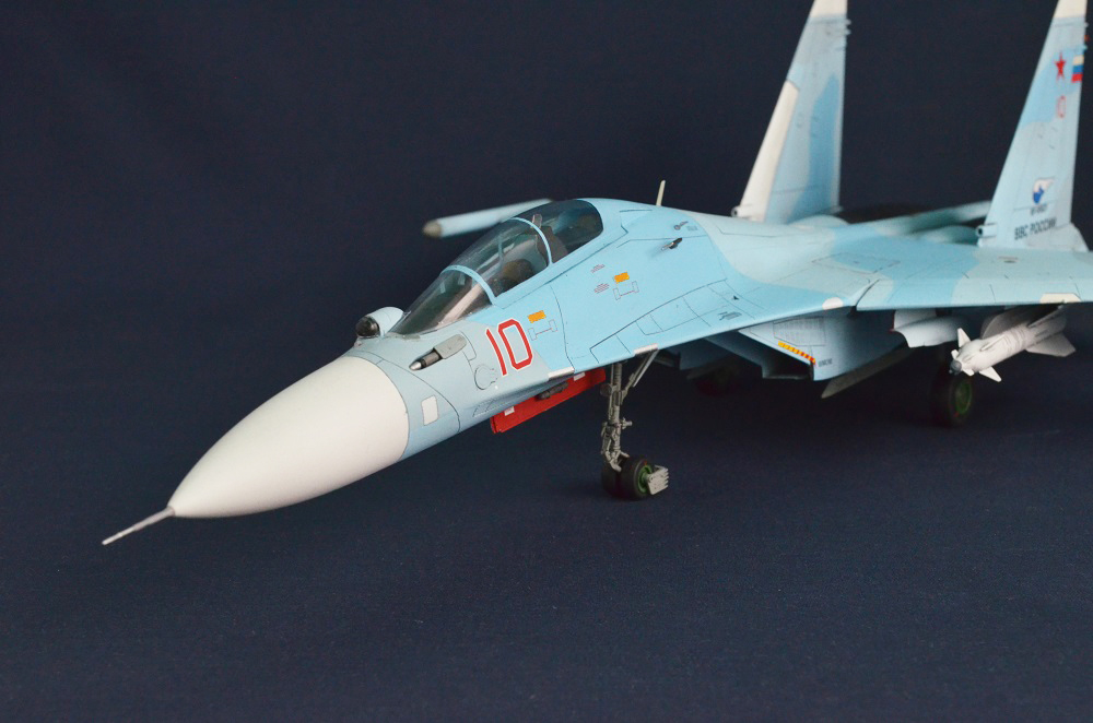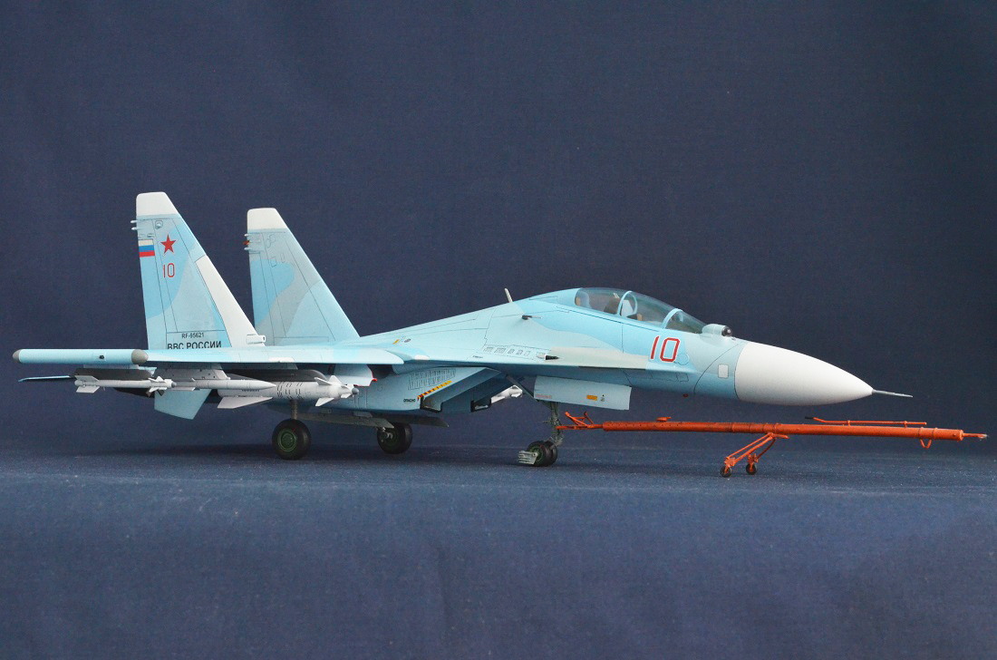 Что собой представляет данный набор выпущенный в 2014 году , собственно старый Су-27 УБ дополненный новыми литниками с деталями характерным конструктивными изменениями в конструкции планера, это носовая часть со смещенным к правому борту ОЛС, штанги дозаправки топливом. На кили данный производитель не стал замарачиватся и оставил их старыми, хотя они имеют совсем другую форму.