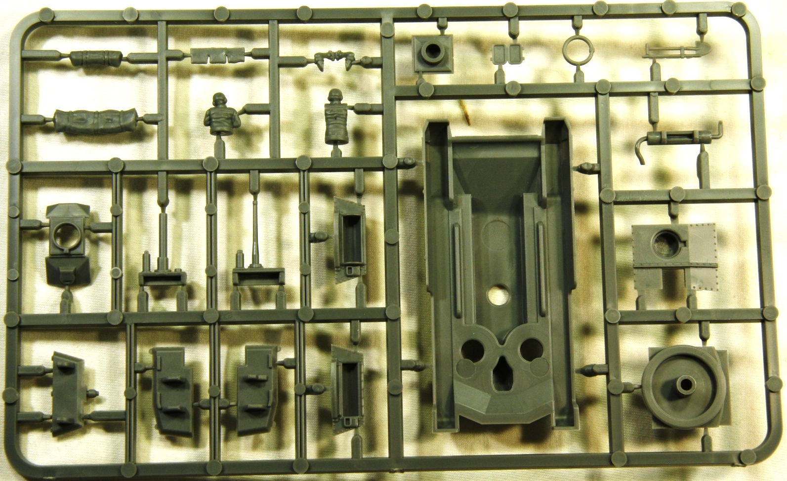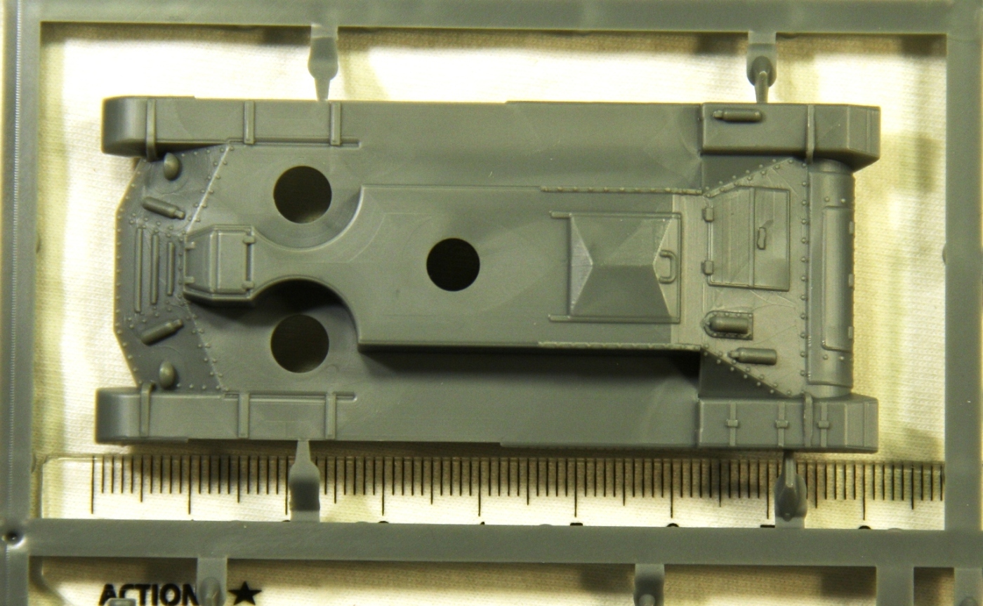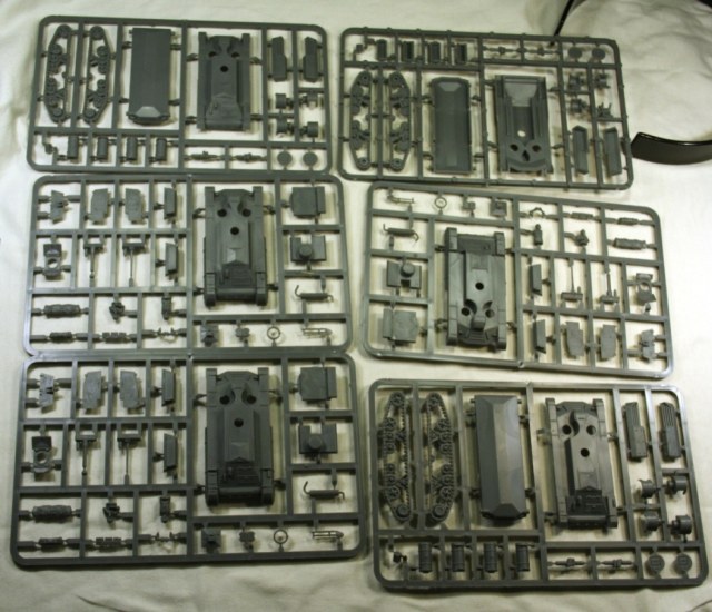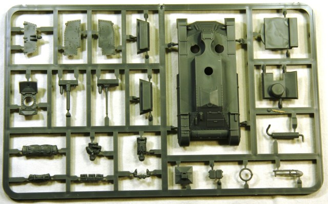 Набор содержит 3 совершенно одинаковых комплекта литников, которые позволяют собрать на выбор один из трех вариантов танка, один с гаубицей и два с пушкой (один из них пустынный). Литье качественное, облоя и утяжин не замечено. Детализация набора довольно бедная, примерно на уровне БТТ в 1/100 от «Звезды». Характерной особенностью БТТ от «PlasticSoldiers» является наличие в наборе фигурок танкистов, которые можно использовать, в варианте с открытыми люками.