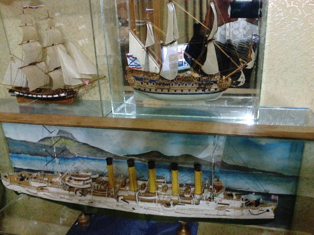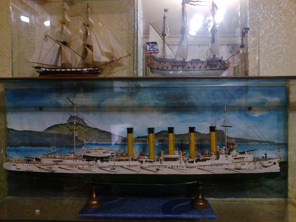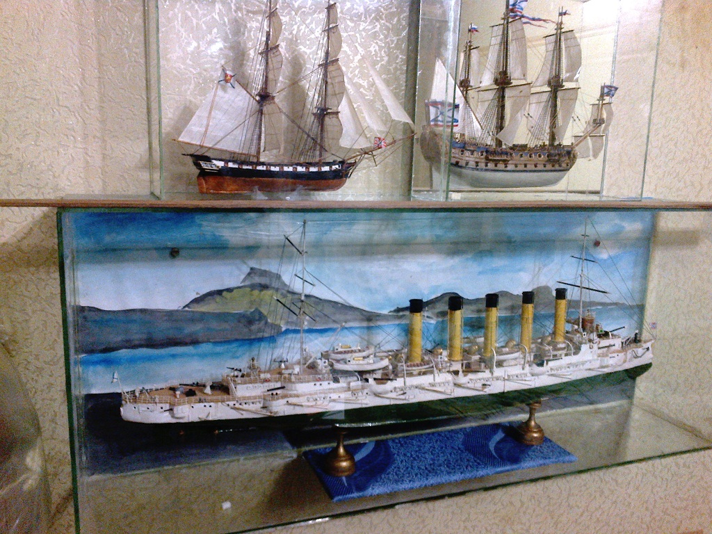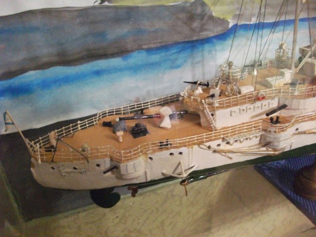 И наконец крейсер- Аскольд участник Русско-японской войны,примечателен пятью дымовыми трубами.единственный в Русском флоте.Изготовлен из картона с применением местами папье-маше,твердый пенопласт и зубочистки.Окрашен эмалями ПФ.