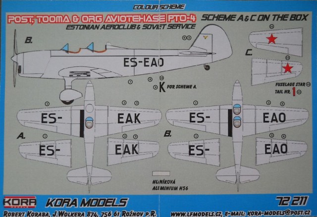 Модель из смолы от фирмы Kora в масштабе 1/72 (номер по каталогу 72211) упакована в небольшую картонную коробку с верхним открытием. В наборе даётся возможность собрать на выбор двухместный вариант самолёта на лыжах или одноместный колёсный вариант. Качество литья нормальное, имеются незначительные дефекты. Проработка фюзеляжа и крыла выполнена относительно неплохо. Мелкие детали смотрятся хуже. В моём наборе отсутствует носовая часть капота, придётся изготавливать её самостоятельно. Декали прилагаются на два варианта - эстонский и советский. Качество печати декалей вызывает нарекания. Ваку-козырьки даются в двух экземплярах и смотрятся приемлемо. Сборочная инструкция малопонятна, схема окраски присутствует в цвете.