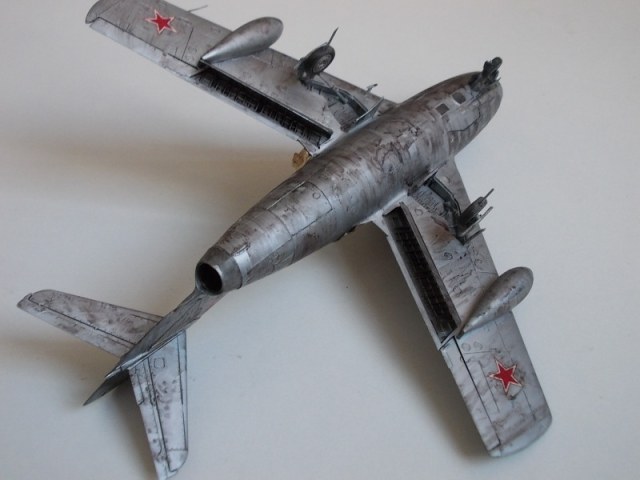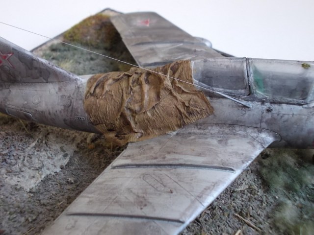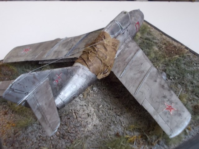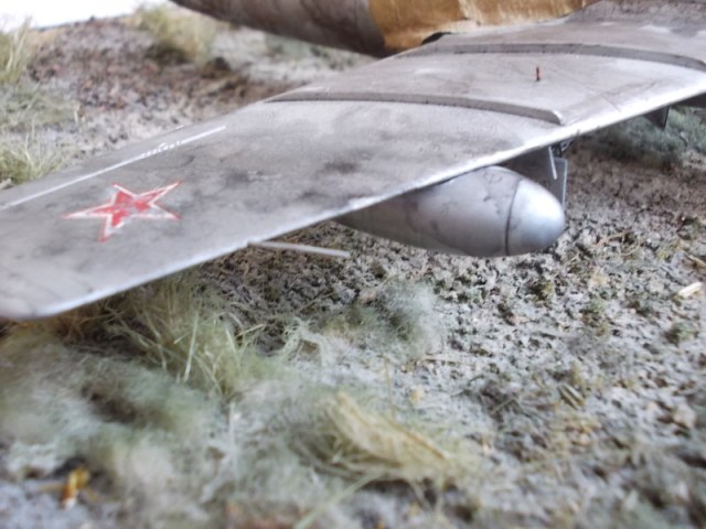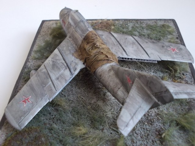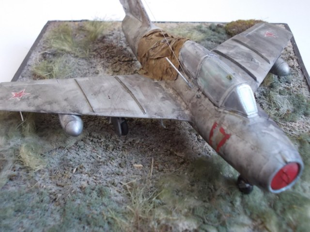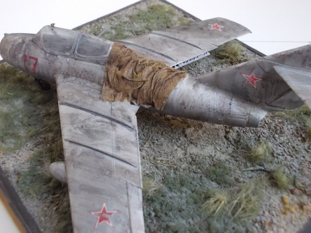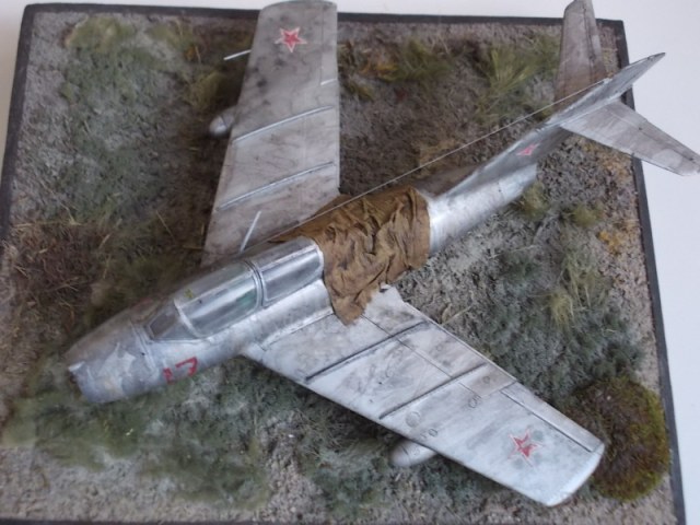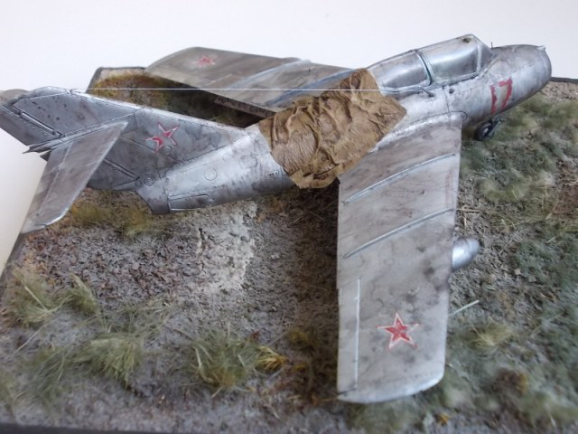 Приветствую,коллеги! Наверно приходилось наблюдать брошенные на краю аэродрома некогда грозные боевые самолёты?! Не многим из них удалось попасть в музеи,большинство доживала свой век в зарослях лопухов и репейника,пока не попадали под нож бульдозера.Вот и мне пришла в голову такая мысль,после приобретения МиГ-15УТИ от Хоббика.Модель откровенно слабая,кабинет почти пустой,море переделок и доработок.Меня такая перспектива не радовала.Собрал как есть,с минимальными доработками.И после почти 2 лет стояния на полке модель за один день была упакована в небольшую диорамку,если так можно сказать.Красил типографской серебрянкой,тонировка Хамбролл+уайт спирит,акриловая смывка ХОМА.Что получилось - смотреть вам.Главное,что модель не ушла в мусорное ведро,жалко было.