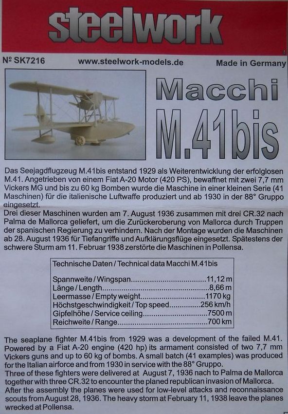 Модель Macchi M.41bis раньше выпускалась фирмой Dekno. На сегодняшний день набор от Steelwork безальтернативен. Рекомендуется любителям итальянской авиации и интересующимся темой гражданской войны в Испании.