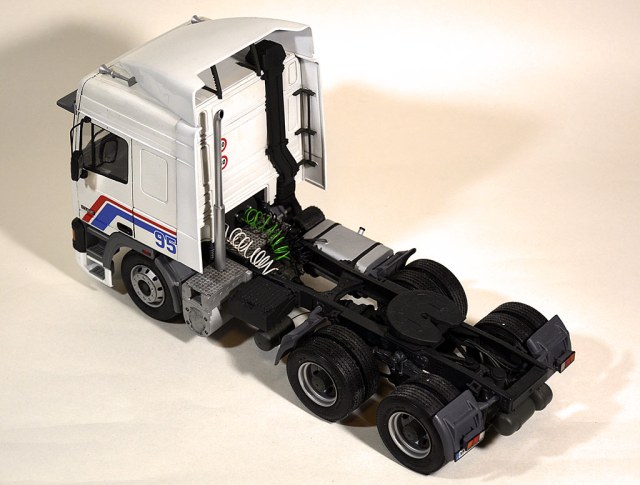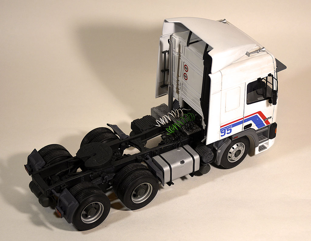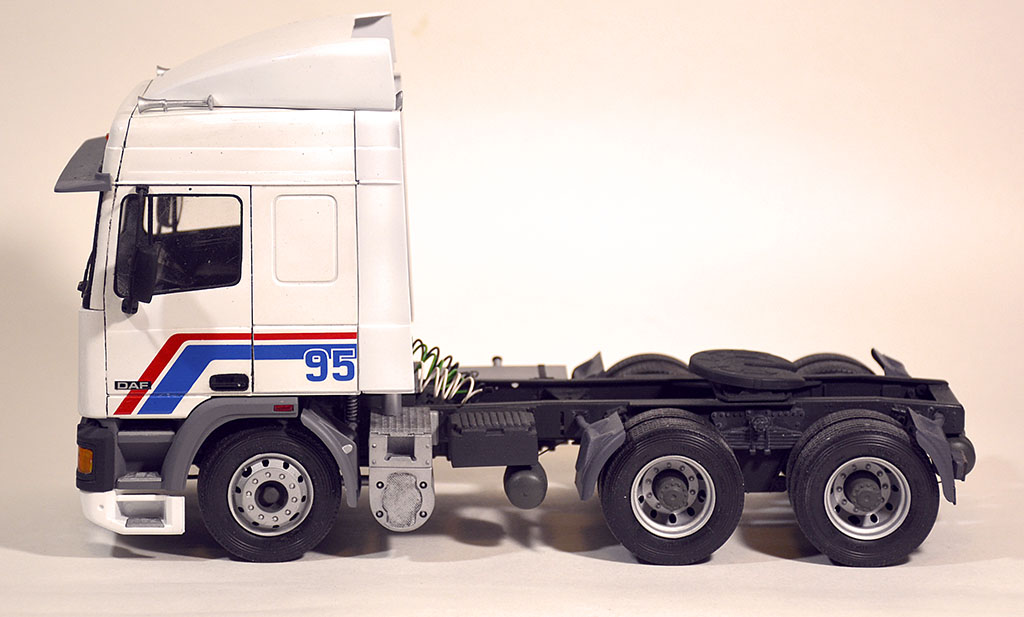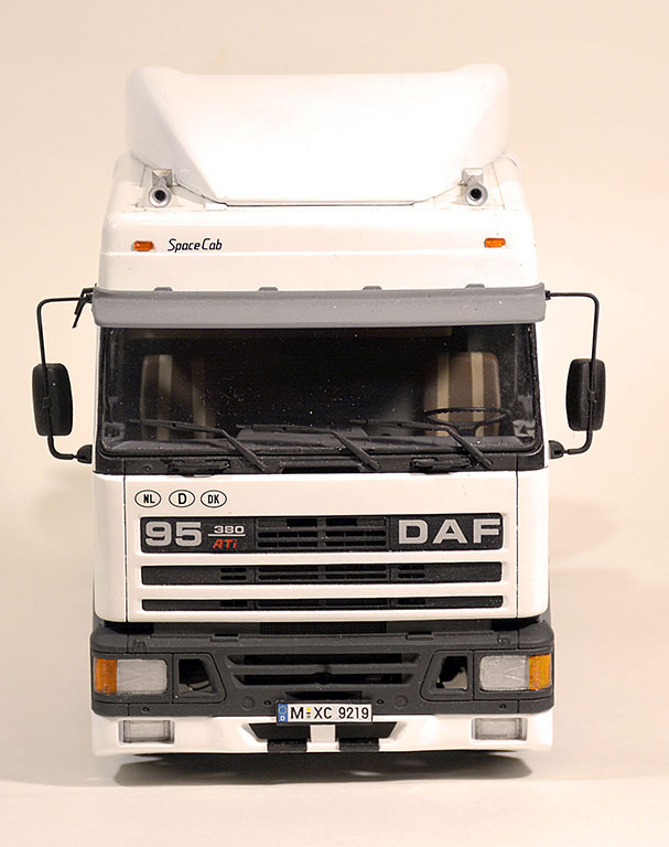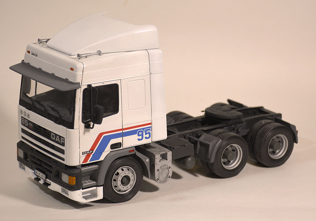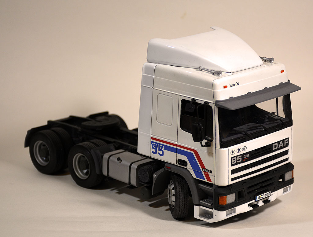Представляю Вашему вниманию тягая DAF 95 ориентировочно 90-91 года выпуска. Данные экземпляры встречались мне и на наших дорогах, правда двухосники. Модель неплохая, но очень много следов толкателей, много шпаклевки. Краски Тамия, Лак 2к.