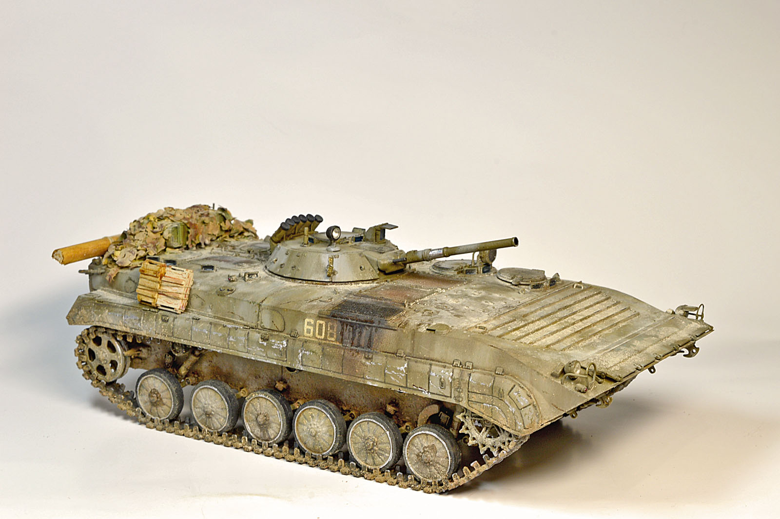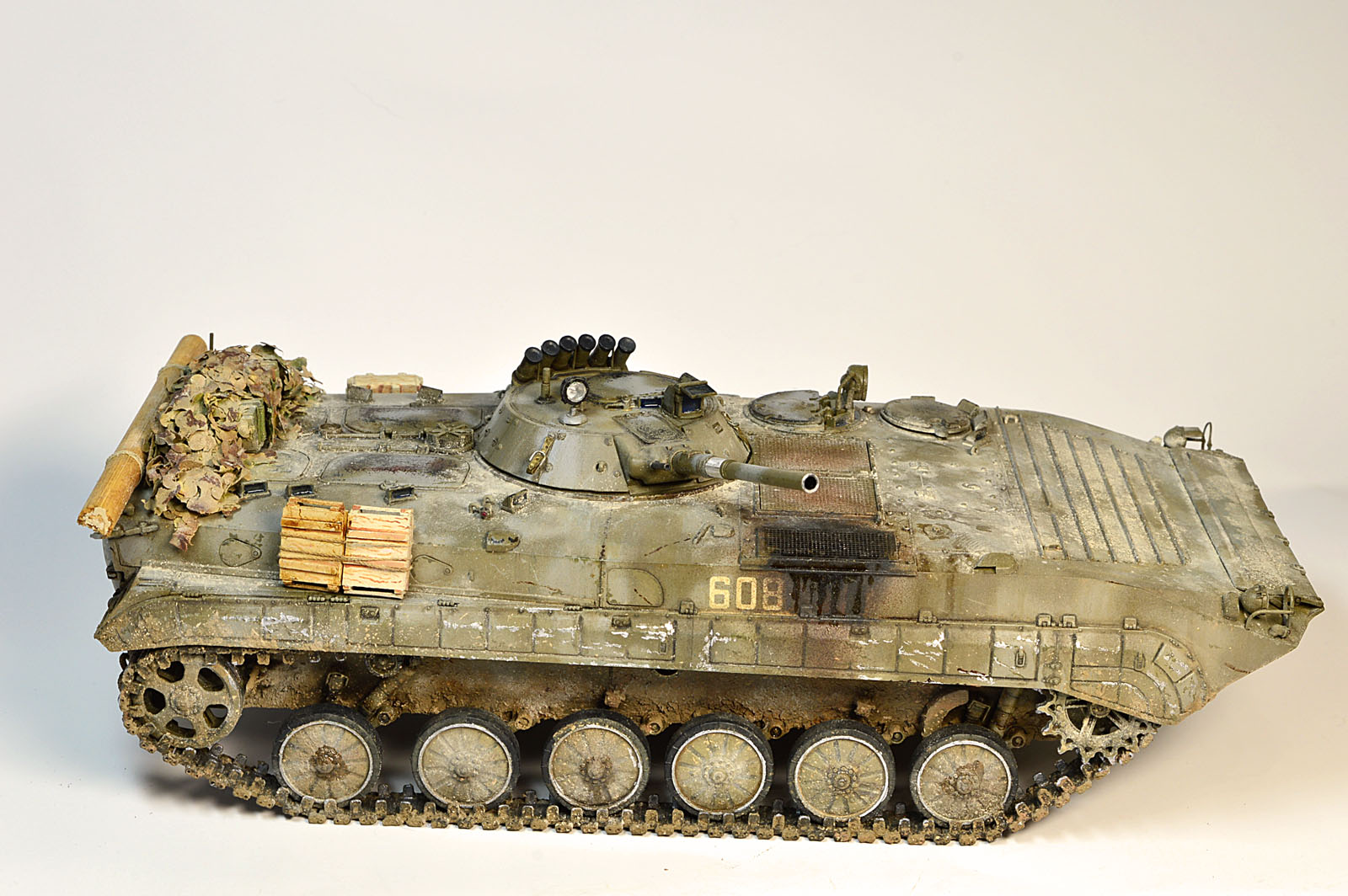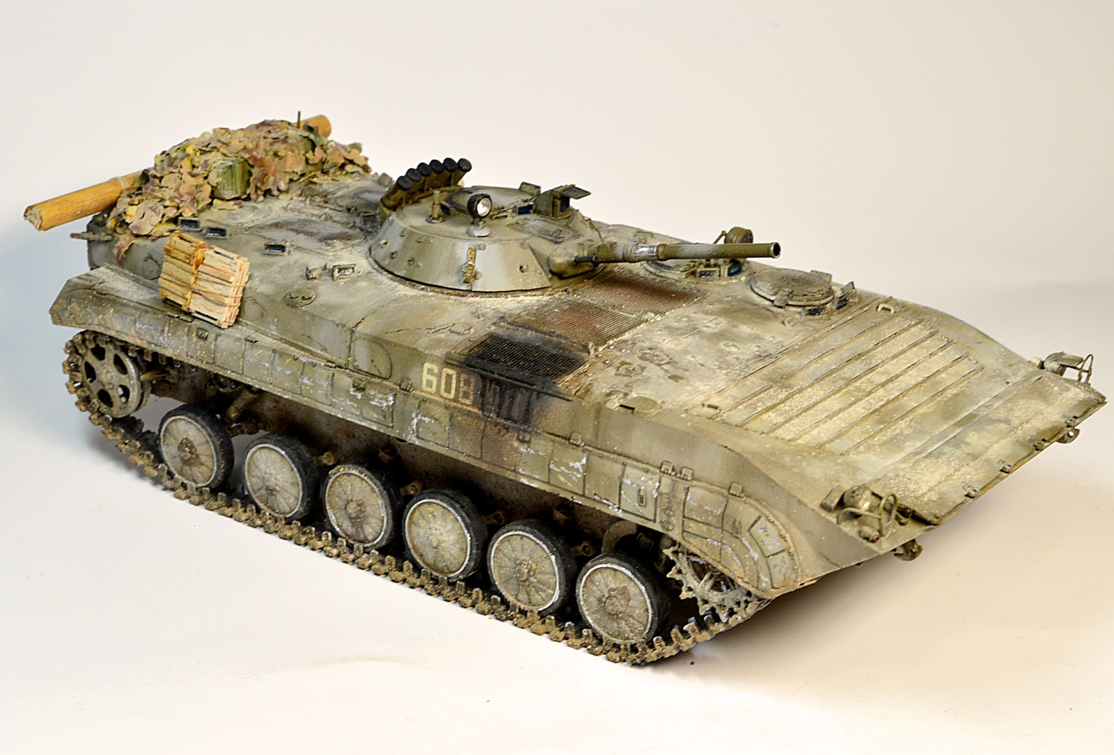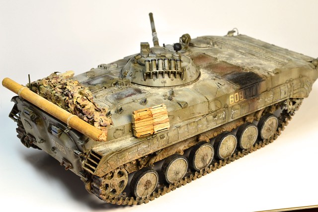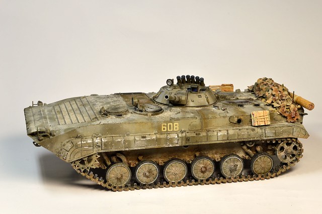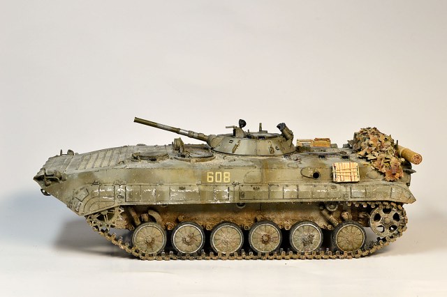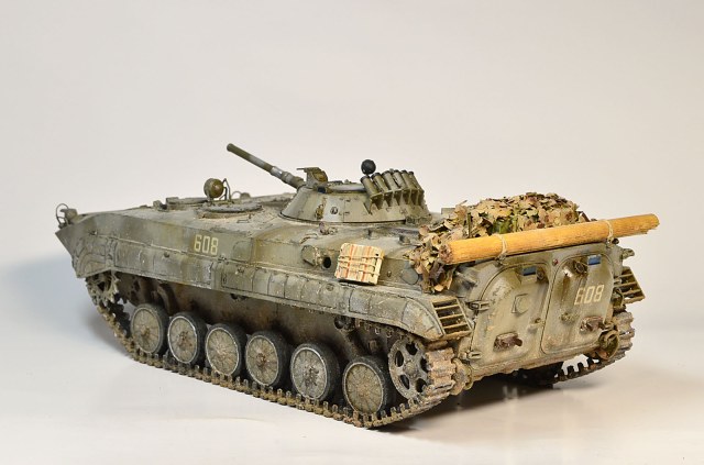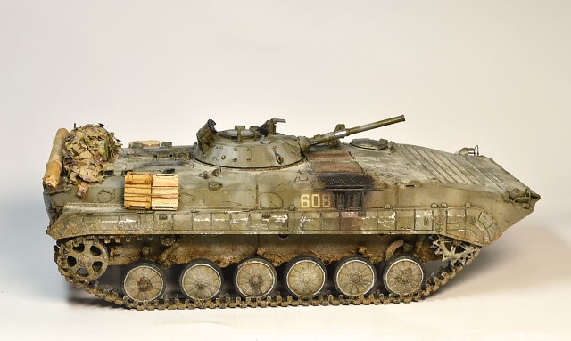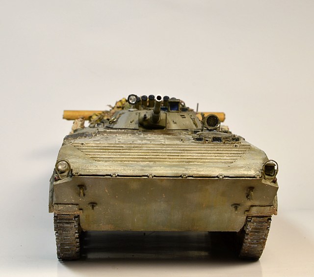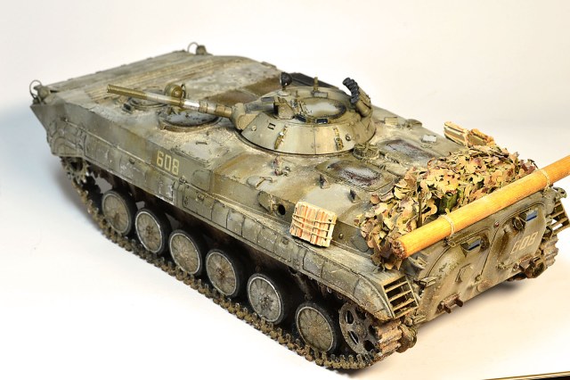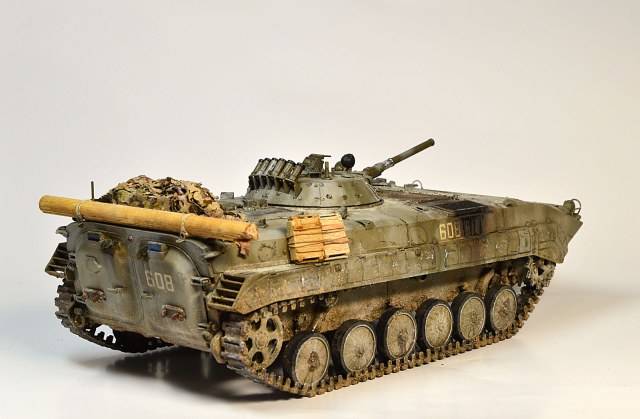 Представляю Вам модель афганского трудяги, рабочей лошадки пехоты. Сама модель хороша, есть точеный ствол и неплохой ПТУР со станком. Собиралась на одном дыхании шпаклевать пришлось лишь стык верхней части корпуса с носом. При окраске использовал набор краски от Ammo Mig для современной российской бронетехники №7109. Цвет мне не понравился, но переделывать не стал. Так как машина из ограниченного контингента, то я ее всю хорошенько пропылил. Использовал в качестве тонировки масляные точки и пигменты Мастер пигмент. Приятного просмотра.