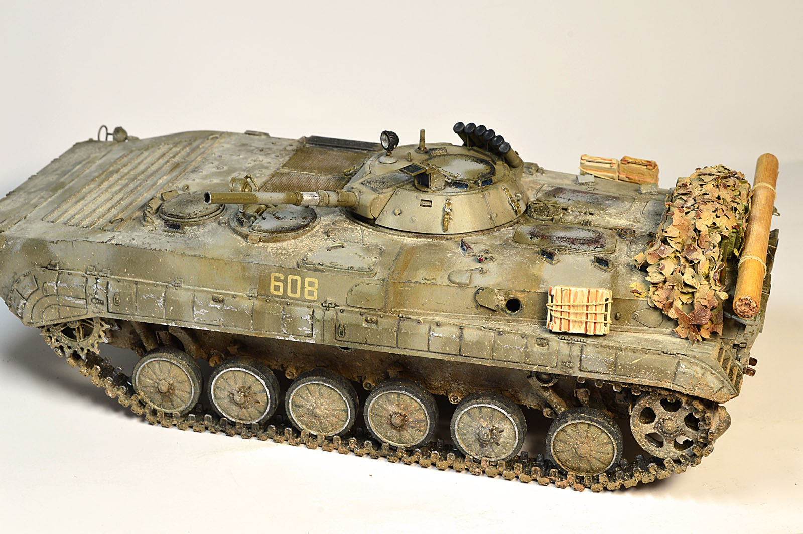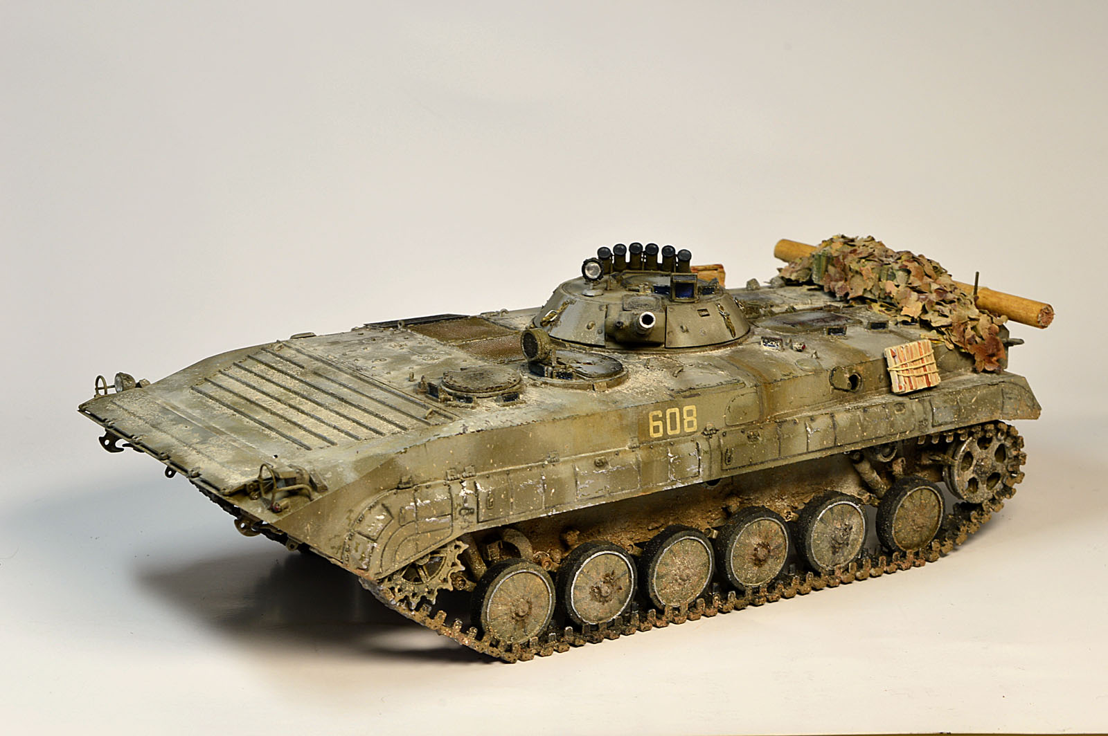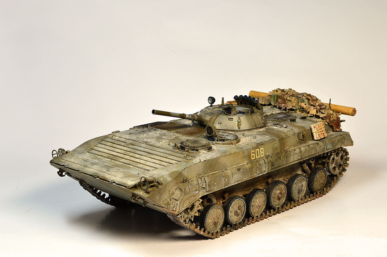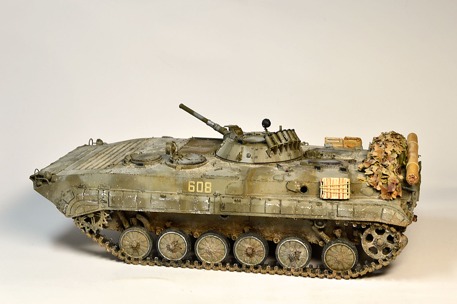 Представляю Вам модель афганского трудяги, рабочей лошадки пехоты. Сама модель хороша, есть точеный ствол и неплохой ПТУР со станком. Собиралась на одном дыхании шпаклевать пришлось лишь стык верхней части корпуса с носом. При окраске использовал набор краски от Ammo Mig для современной российской бронетехники №7109. Цвет мне не понравился, но переделывать не стал. Так как машина из ограниченного контингента, то я ее всю хорошенько пропылил. Использовал в качестве тонировки масляные точки и пигменты Мастер пигмент. Приятного просмотра.