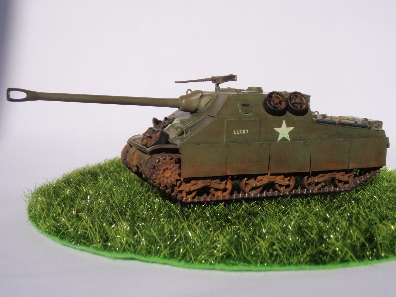 Эти орудия, вместе с инструкциями по переделке среднего танка М4 Sherman в САУ, были отправлены в Европу. Первые 12 экземпляров этой САУ были собраны именно в Европе из танков М4 Sherman различных модификаций с повреждениями башни или орудий. Представленная в наборе от UM САУ была переделана из танка модификации М4А4 и получила название "Lucky". Первые же бои показали превосходную бронепробиваемость 120 мм пушки новых САУ. Пушка получила самые лестные отзывы военных. Но из-за массы пушки почти в три тонны (!) ходовая танков М4 не выдерживала нагрузок. В США начался выпуск САУ М38, но уже на новой подвеске HVSS. До окончания работ над тяжелым танком со 120 мм пушкой, было решено выпустить САУ М38 ограниченой серией в 38 экземпляров.
