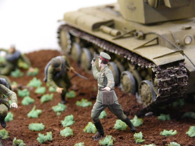 В данной работе мной использован танк КВ-2 от фирмы "Звезда" и фигурки из набора "Атака пехоты" от фирмы Мастер Бокс (МВ). Как сам КВ, так и фигурки, не подвергались конверсиям.
