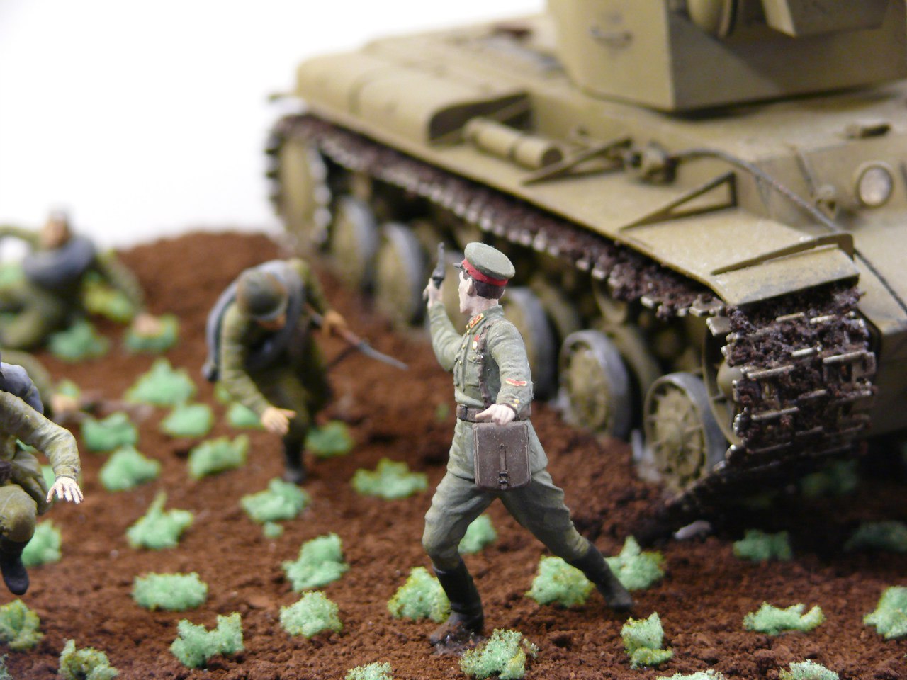 Симпатичная работа. Единственный момент - уж больно стерильно выглядят танк и бойцы. Мне кажется, что земля на поле влажная и падая в нее, они должны были хорошенько измазаться