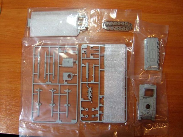 Модель производит очень приятное впечатление. Качество соответствующее для этой фирмы. Всё аккуратно упаковано в пакеты. Деталировка упростилась. Как я погляжу это уже повсеместная тенденция к упрощению сборки. Корпуса модели даются целыми деталями и состоят из низа и верха. Плюс небольшое колличество навесных деталей. Не знаю, хорошо это или плохо. Собирать стало легче, но меньше возможности для переделок и меньше "ночной магии и колдовства" над сборкой множества малюсеньких деталек. Лючки, тросы и шанцевый инструмент отлиты вместе с корпусом, что требует дальнейшего их срезания или если оставлять, то неудобно окрашивать и не придаёт плюсов копийности.
