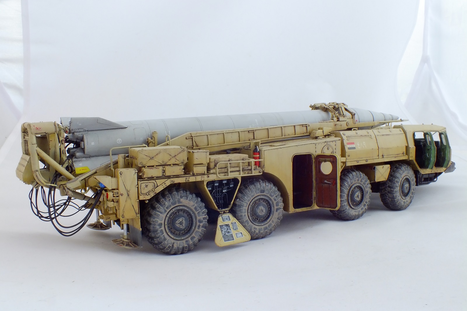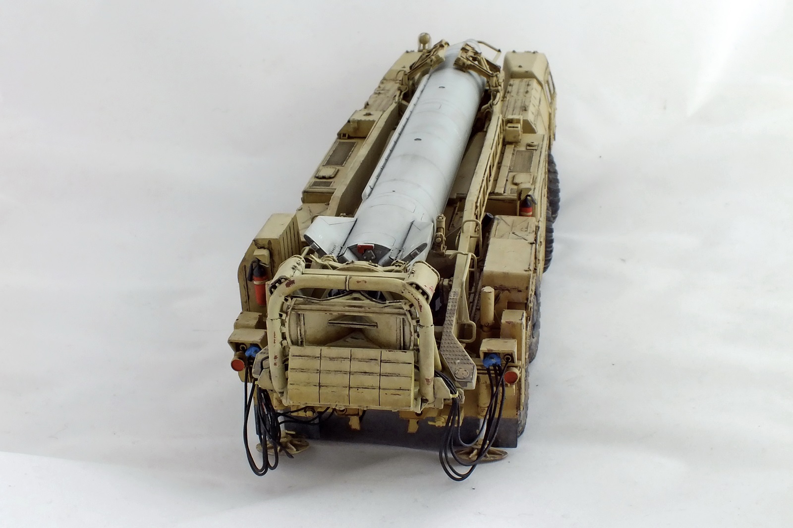 Набор понравился.Трудоёмкий, но работать интересно. От себя добавил тормозные шланги к колёсам, кое где немого проводки, шланги гидравлики и подачи воздуха. Заменил фары на "Эльф".Сделал колёса нагруженными, (на фото почти не видно ).