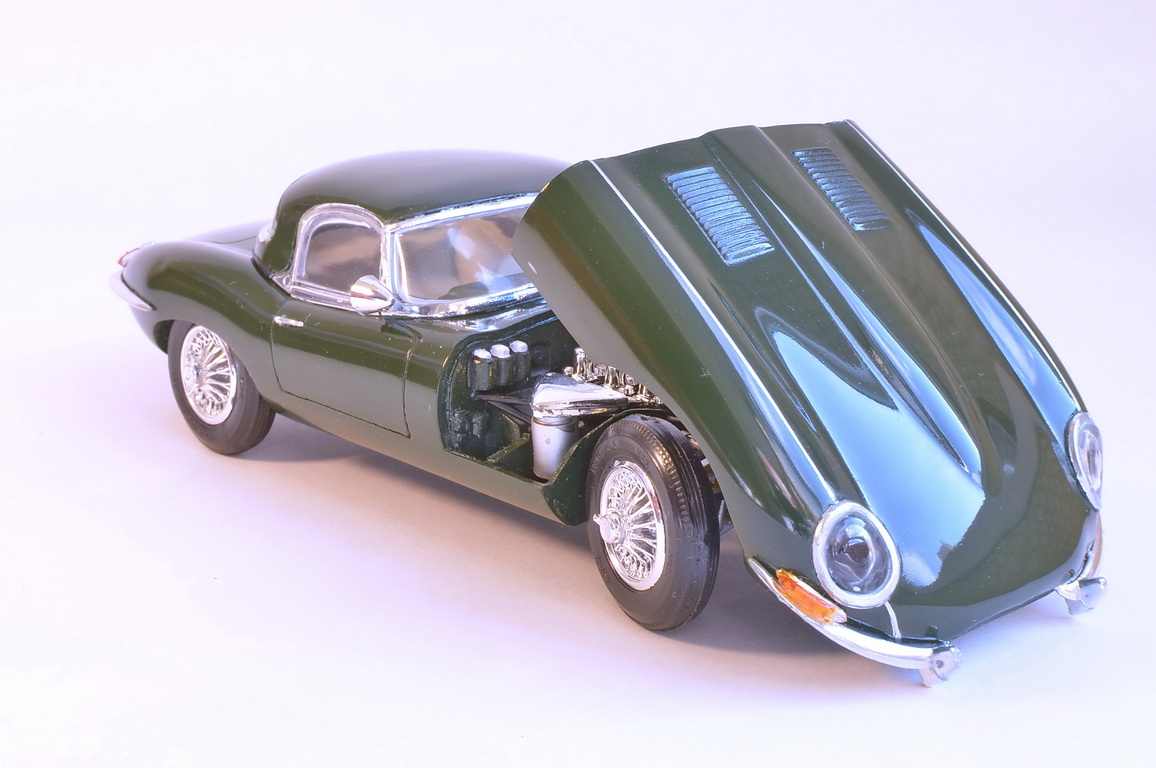 Представляю на Ваш суд результат сборки данного автомобиля. Собирать его я начал в мае 2016 года, и все это время в основном пилил и пилил. Качество деталей ужасное, особенно литники, покрытые хромом. Стекла очень толстые, почти миллиметр, кроме того лобовое стекло, заднее стекло и боковые стекла сделаны как единое целое. Ягуар решил делать закрытым и это увеличило работу на месяц. Несколько раз бросал, но снова возвращался чтобы доделать. Много было возни с корпусом, который состоял из двух частей. Пришлось сначала его склеить, шпатлевать, зачищать, грунтовать, а потом изощряться с салоном. Был большой косяк, когда вместо полировки махнул тамиевской шпатлевкой из тюбика. Ну и всё сначала.