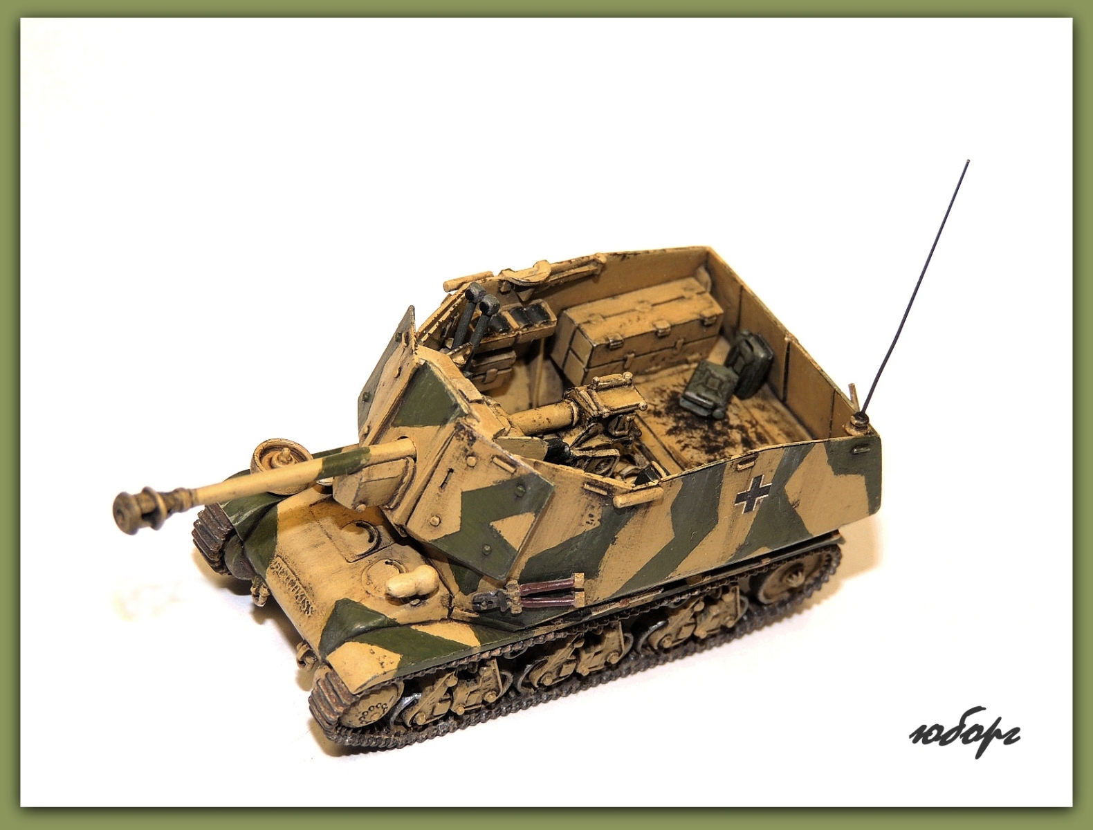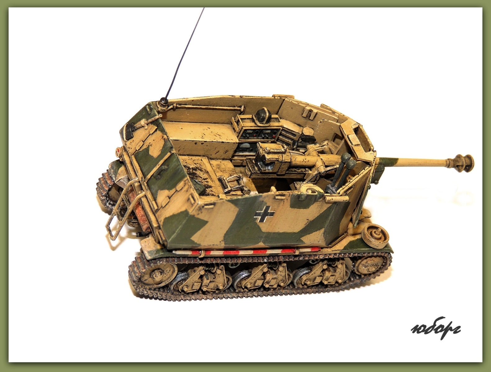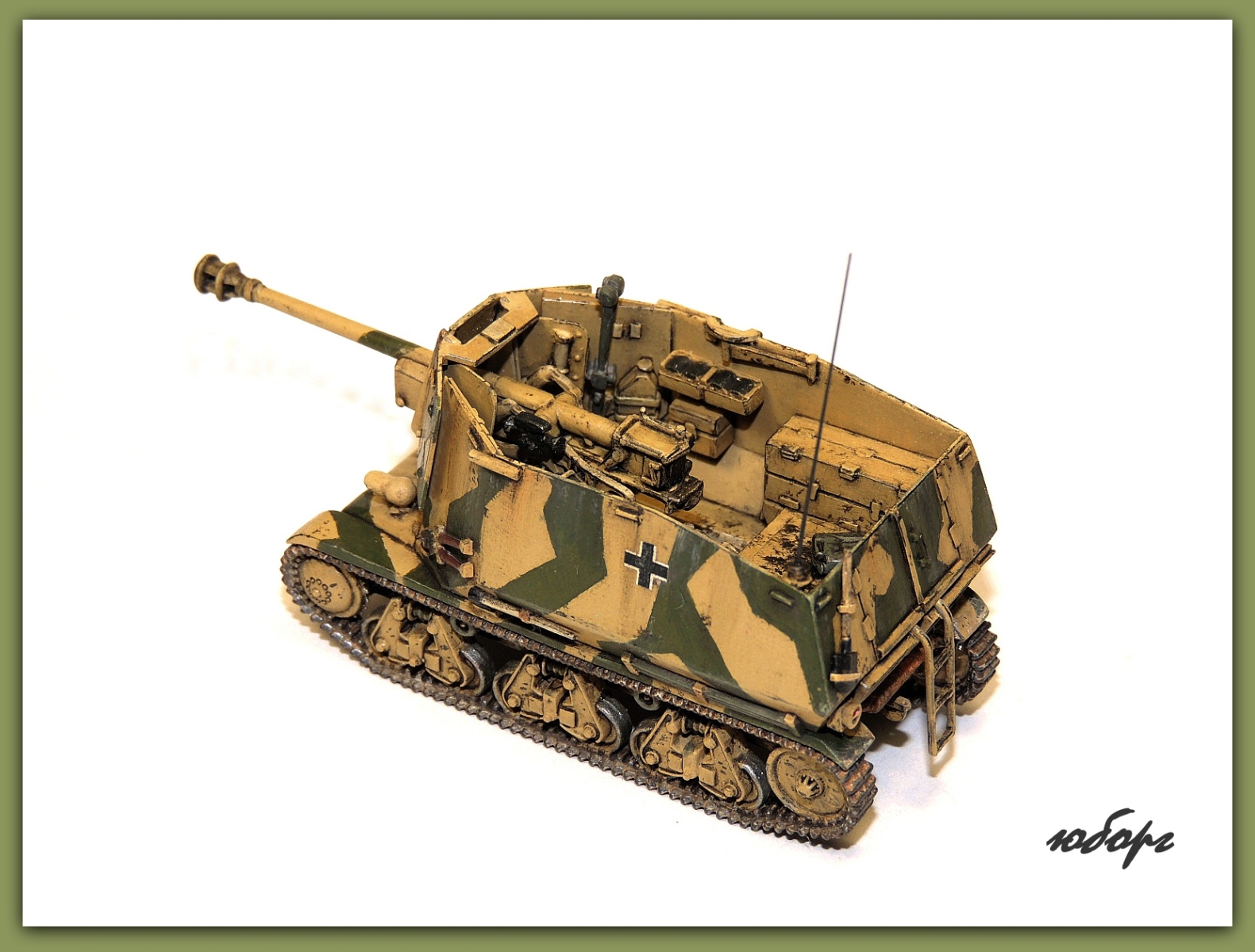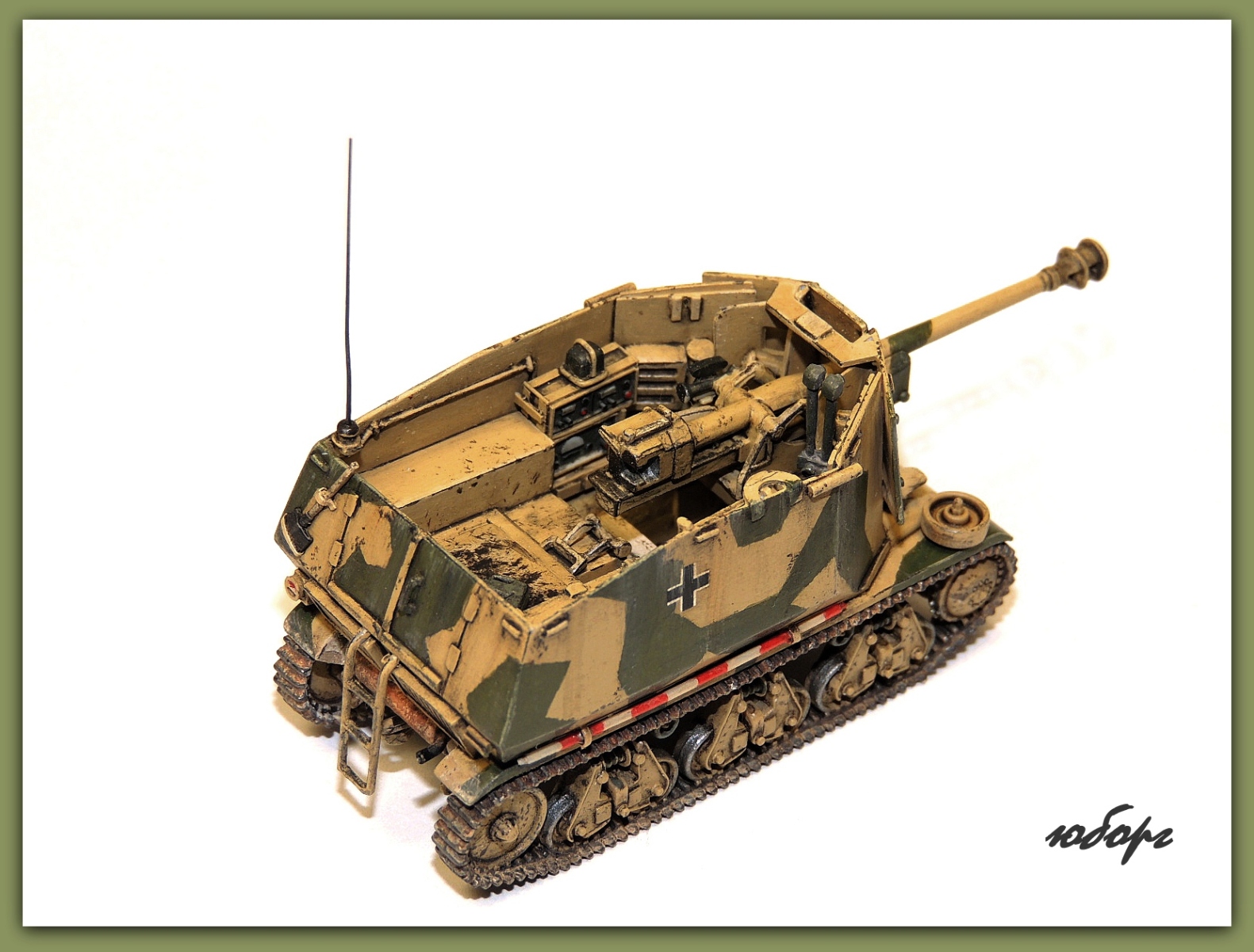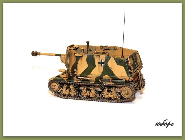 Очень люблю открытые самоходки! Но даже рассматривая модель уже собранную, забывается сколько труда вложено во всевозможную мелочевку. Одна только рация чего стОит! Да еще принять во внимание, что пилилось из нескольких моделей! Достойнейшее пополнение коллекции - Юрий, прими мои поздравления!
