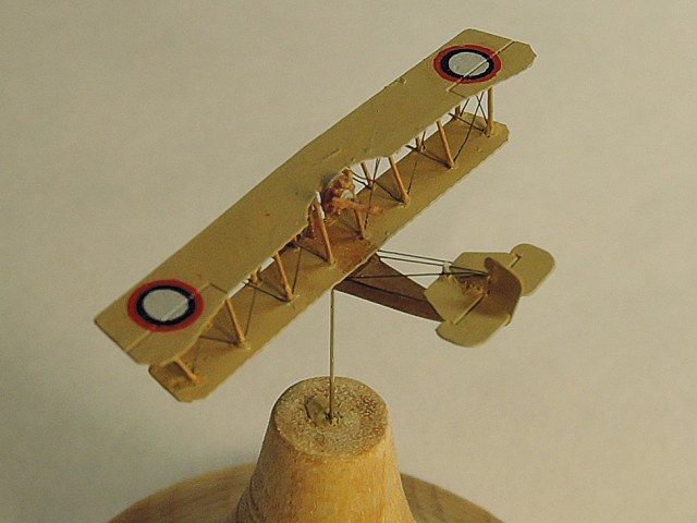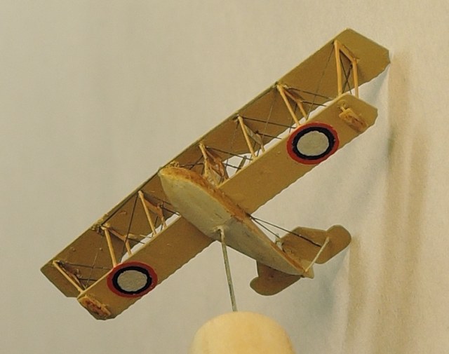 на нижнее крыло установил стойки и покрасил, установил растяжки из нити лайкра 0,048мм, закрыл верхним крылом. На корпус установил хвостовое оперение, растянул его, установил бипланную коробку. Для российских кокард выбил пробойником из остатков других декалей круги трёх цветов, наклеил на крылья тремя слоями.