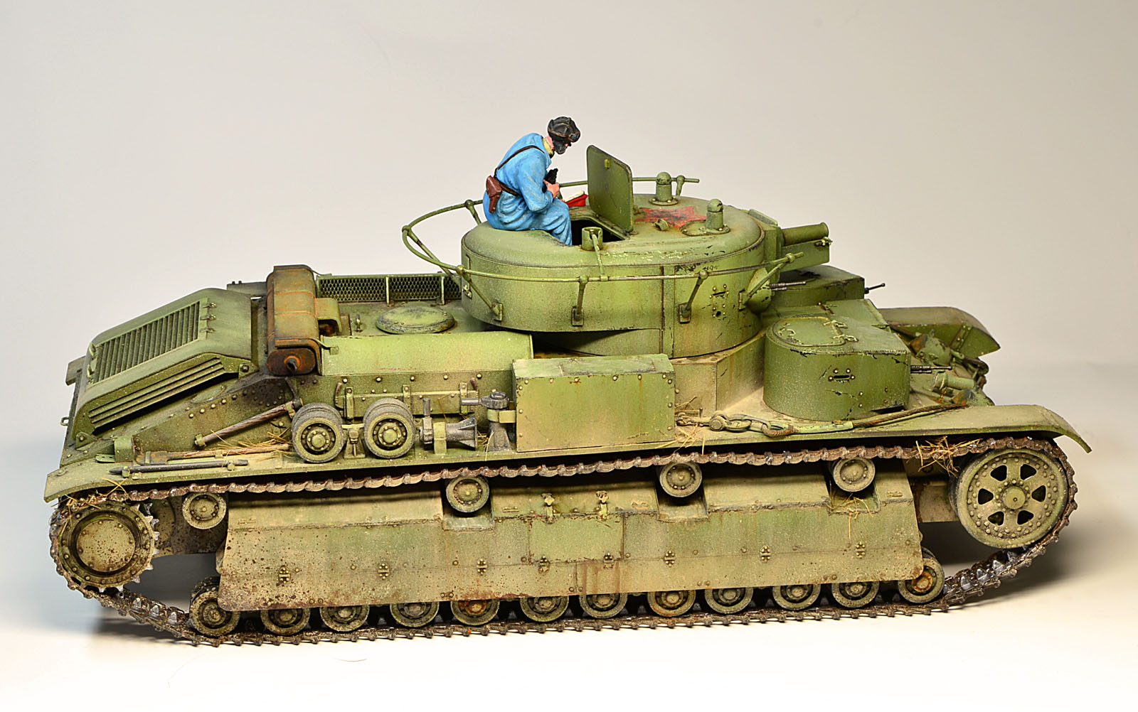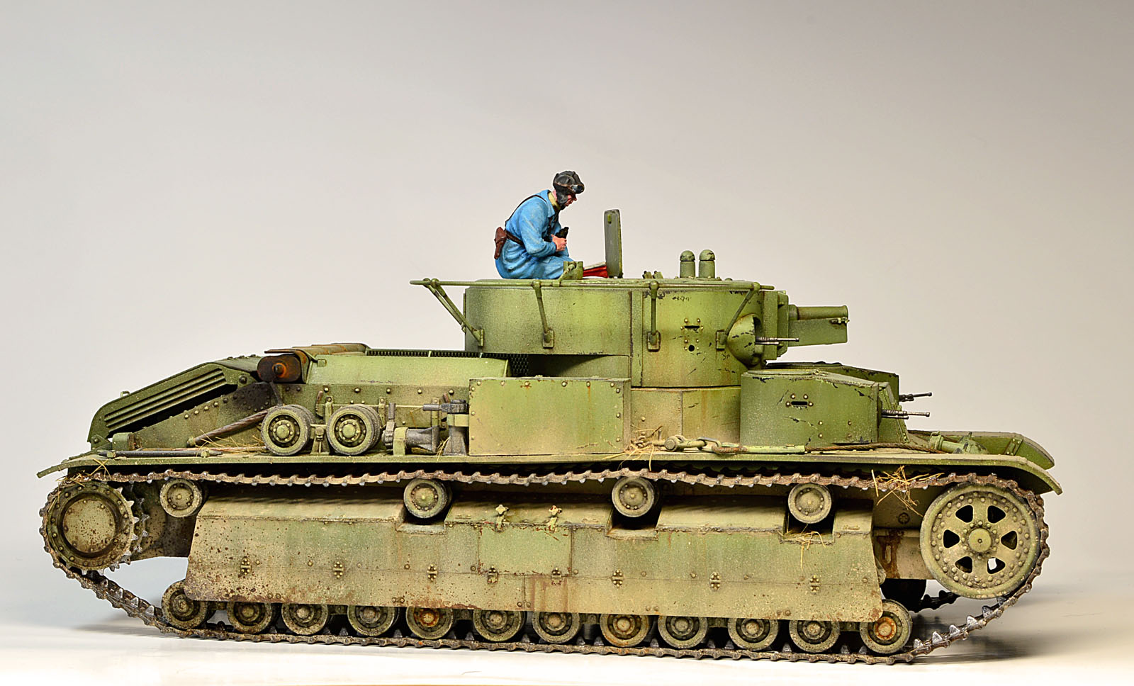 Хорошая работа. Но высветление выступающих частей и мелочёвки нарочито. И почему танкист в голубом?