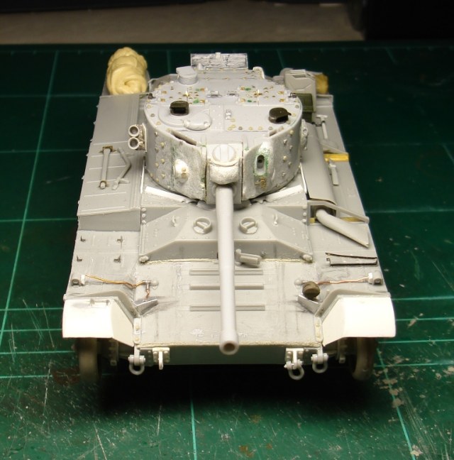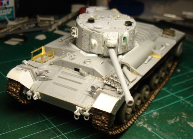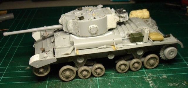 Корпус взят от «Миниарта», а башня – от «Макета». Основные доработки коснулись именно её. Переделана маска на Mk IX («Миллипут»), снесён и заново установлен весь крепёж на крыше и бортах башни («Мастерклуб», травлёные гайки и обрезки плат ФТД), пластиком нарастил башенную нишу, заново изготовил забашенный ящик (пластик + алюминиевая фольга), дымовые гранатомёты и проводку к ним (обрезки винтовок + литники + проволока). Тамиевским грунтом имитировал фактуру литья, наклеил фототравлёные литьевые номера.