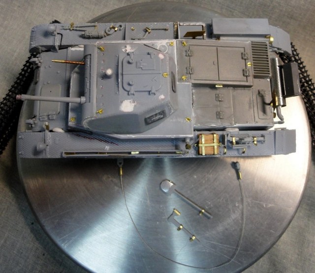 Лючки на смотровых приборах по кругу башни из запасников от Тамии, где нет смотровых приборов все сточил и зашпаклевал.