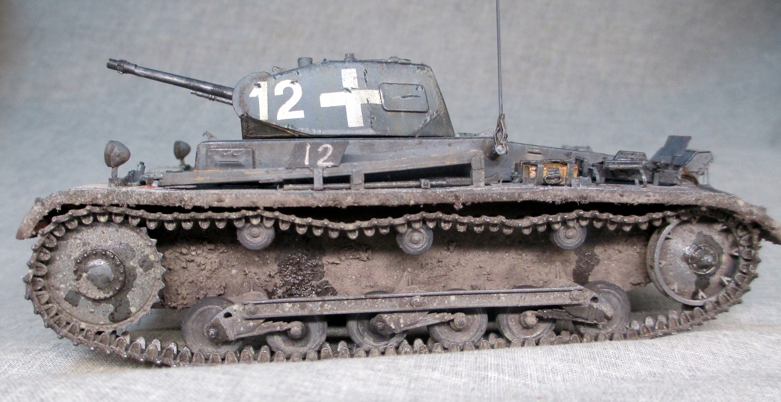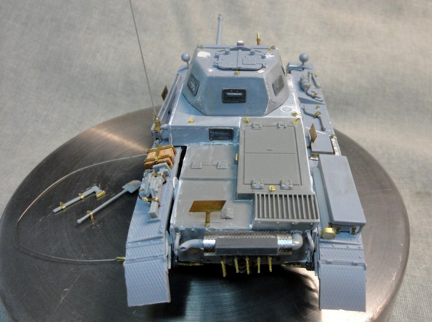 Сточил толщину пластика где видно. Изменил форму т. К. у ранних двоек гусеничная полка идет слегка на излом в районе МТО, поснолил все что связано с шанцем. Шанцевый инструмент взял из запасов в основном Дракон сделал крепления по фото из травла, от былых моделеей, которого остается всегда в изобилии, если вы покупаете хорошую модель от дракона, у меня их было штук несколько. Передние крылья подпружинил пружинками в пластике от Дракона, задние то же пришлось сделать только косынки из доширакопластика. Ложемент антенны рассек по вдоль сточил серединку и сделал с помощью кусочков травла, по фотографиям, что то более похожее, антенна тянутый литник, а ее устройство складывания подпружиненное, так же по фото из запасов травла. Брусок под домкрат вырезал из буковой дощечки и опять таки кусочки травла и проволоки, так же туда пошел скотч аюминиевый. Фары высверлил родные и сделал из доширакопластика светомаскировочные крышки, проводка к ним проволока, гудок был из травла а корпус шайба из куска литника, рядом с сигналом отбойник переднего люка из бронзовой трубочки в которую вставил пластиковый пруток. Замки на ящик зип по правому борту и кранштейны которыми он крепится к полке, судя по фото и чертежам на данной модификации зачастую было по 2 огнетушителя, я установил один а на другом борту просто крепления под него. Пенал под банник за ящиком ЗИП по фото из подручных материалов. Добавил недостающую косынку по правому борту из листового пластика производства До-ши-рак. Таблички в форме параллелограмма на которых наносились номера машины так и не знаю в чем их смысл, так же из запасов травла. Кронштейн для зенитного пулемета по правому борту делать не стал, не нашел фото его устройства.
