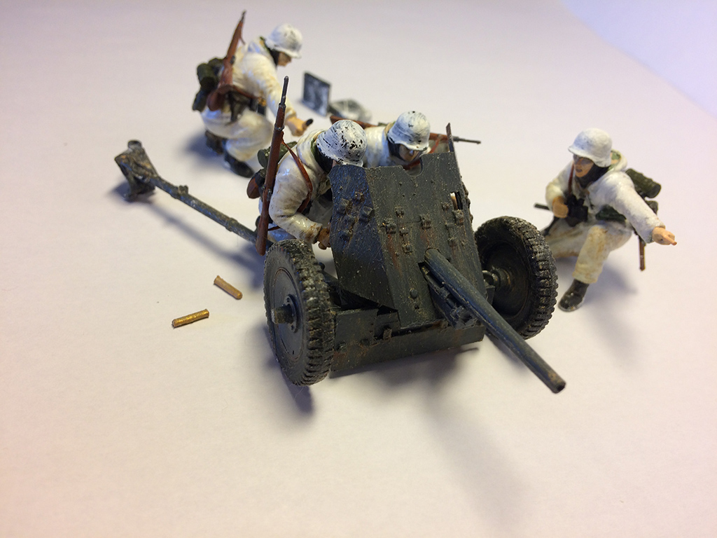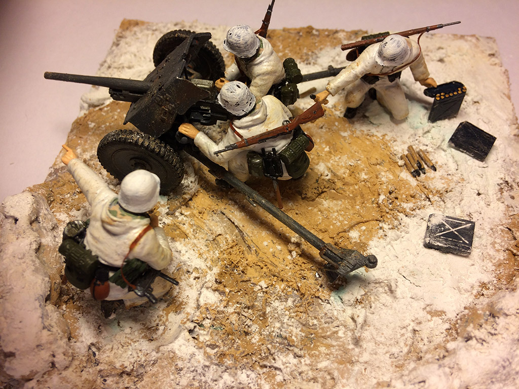 Привет всем! Собрал свою вторую модель (первым был ханомаг собранный и раскрашеный по инструкции) и решил сделать как-то более интереснее. Красил акриловыми красками от звезды. Так как средств на масляные краски, смывки и др. пока нет грязь на одежде и пушке наносил краской в керосине поверх слоя матового лака. Основание заливал клеевым пистолетом. Грязь и снег делал из талька с краской.