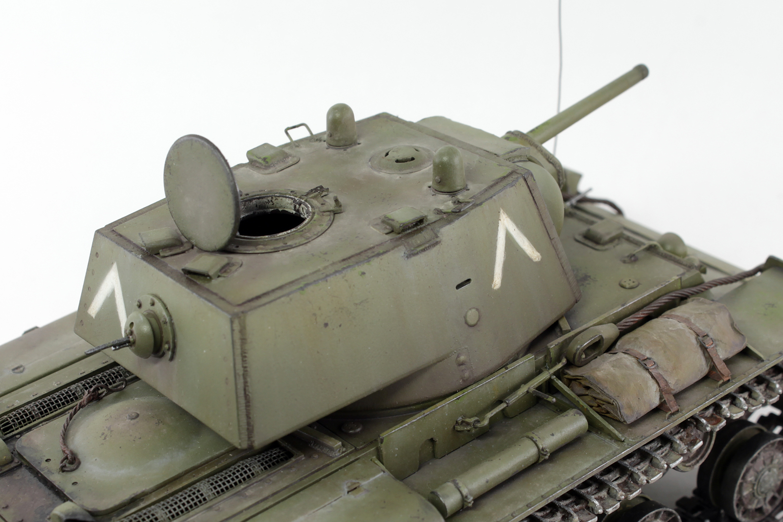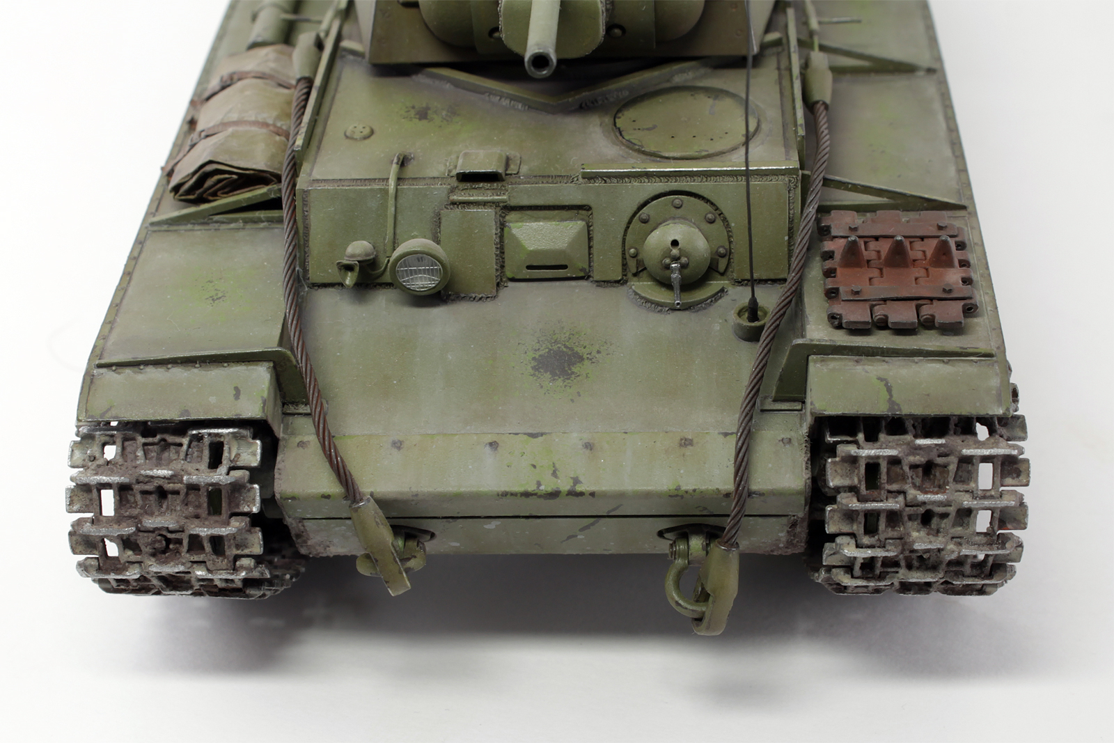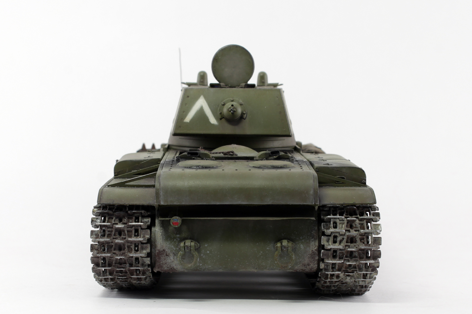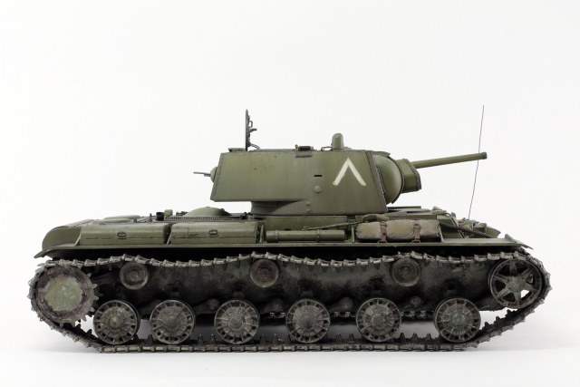 Очень хорош КВ у Вас получился, видно, что Вы матчасть этой машины изучали, модель дорабатывали. Позвольте пару придиризмов. Кормовой фонарь окрашен правильно, вот только сама деталь, похоже, перевернута, судя по фотографиям, верхняя часть фонаря, та, что синего цвета, должна быть по своему размеру (площади) больше нижней. Ну и заметны следы стыка пресс форм на запасных траках.