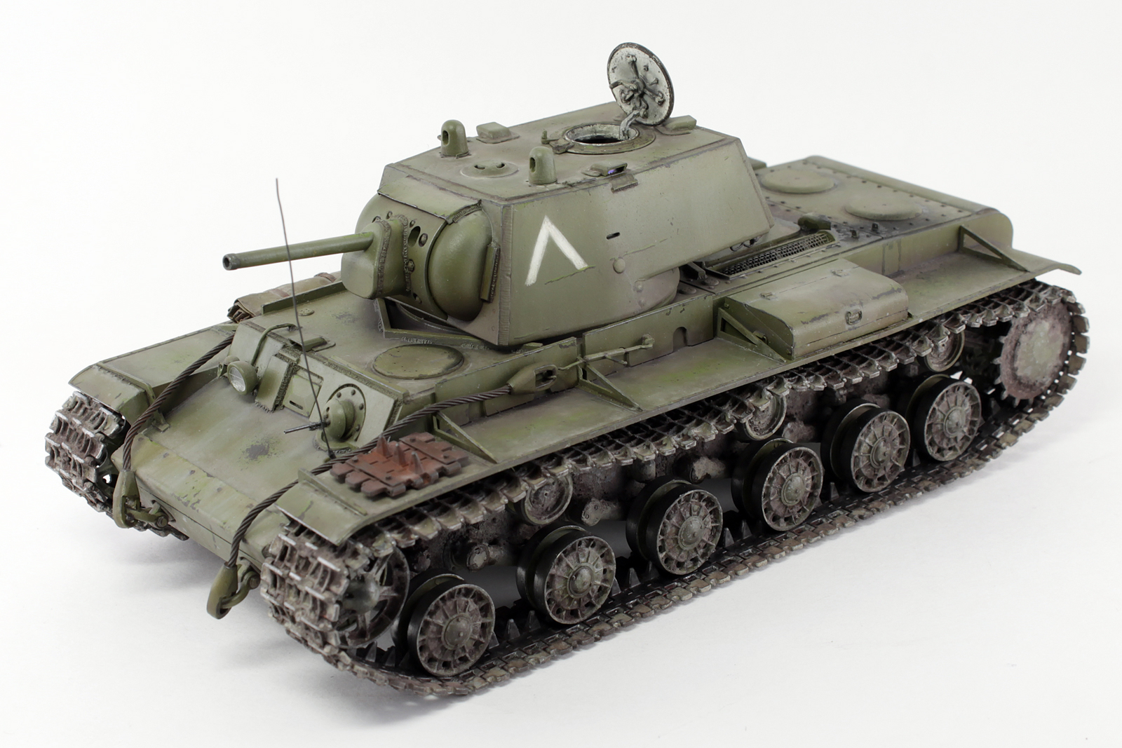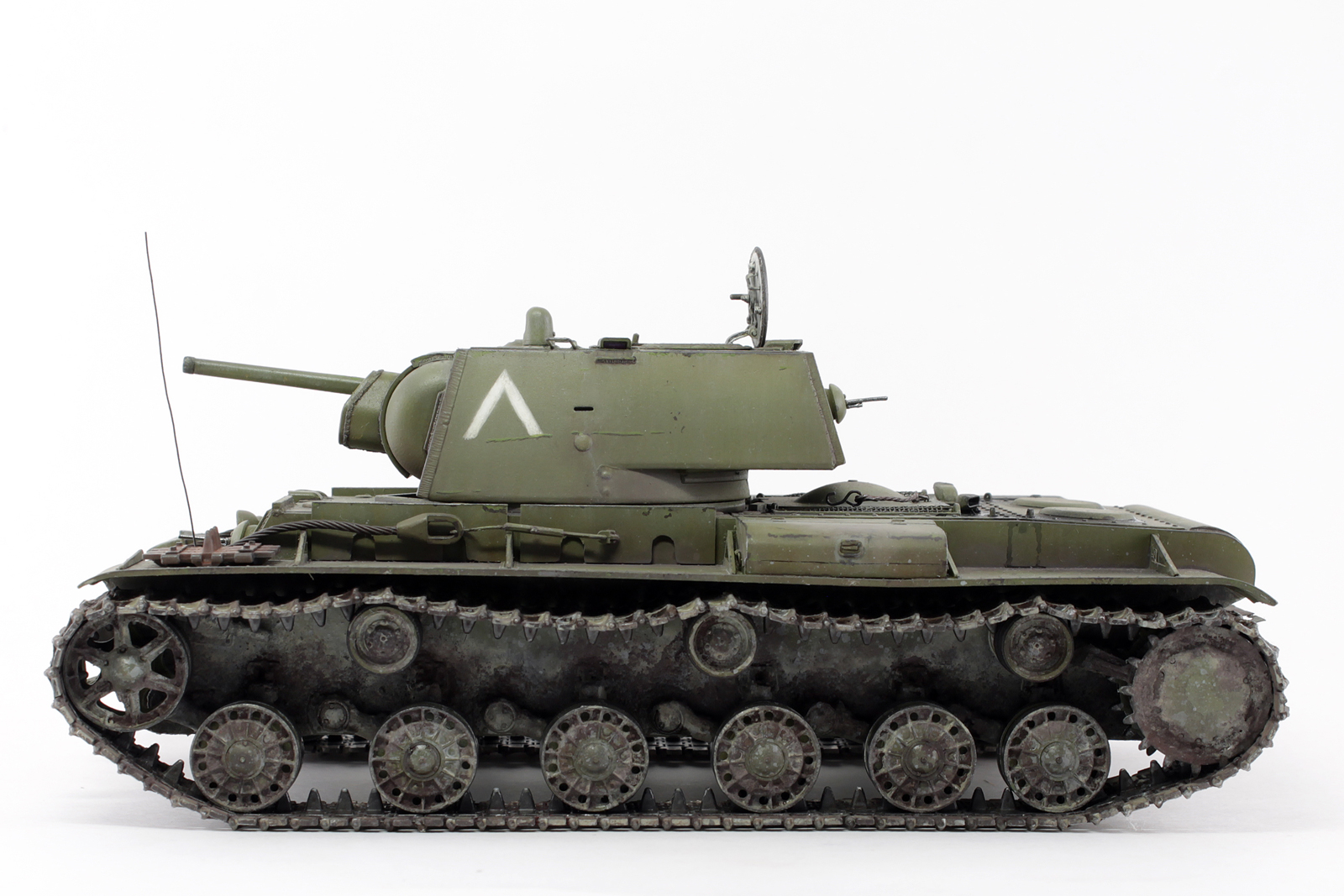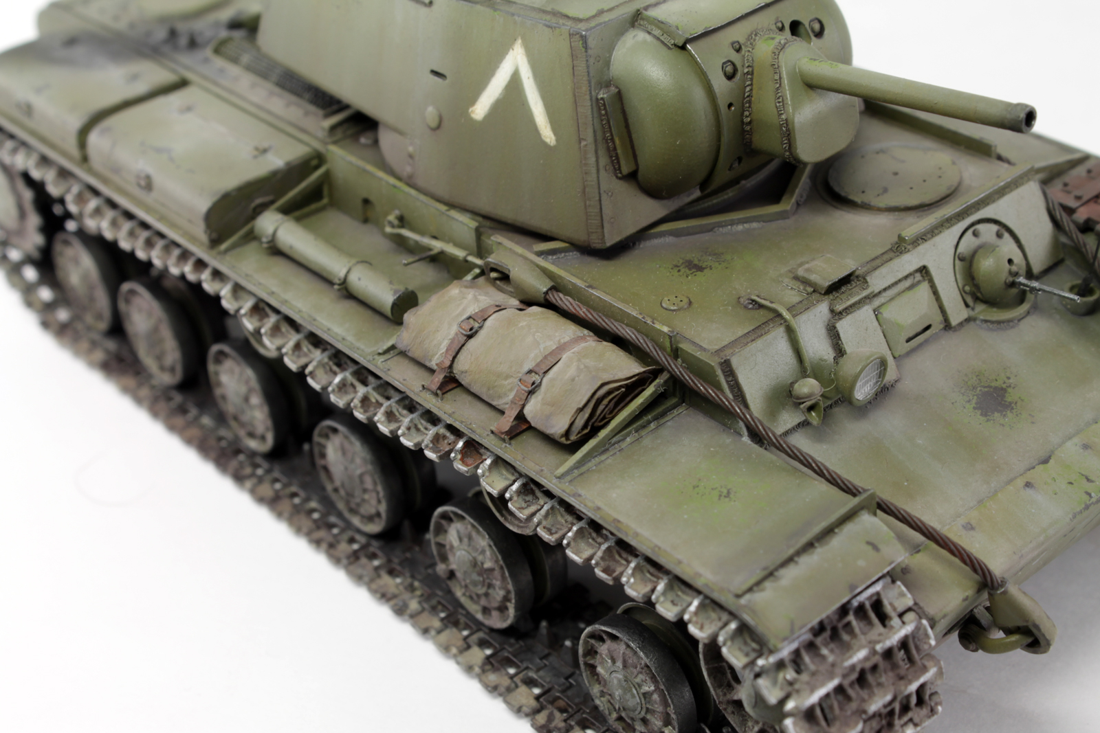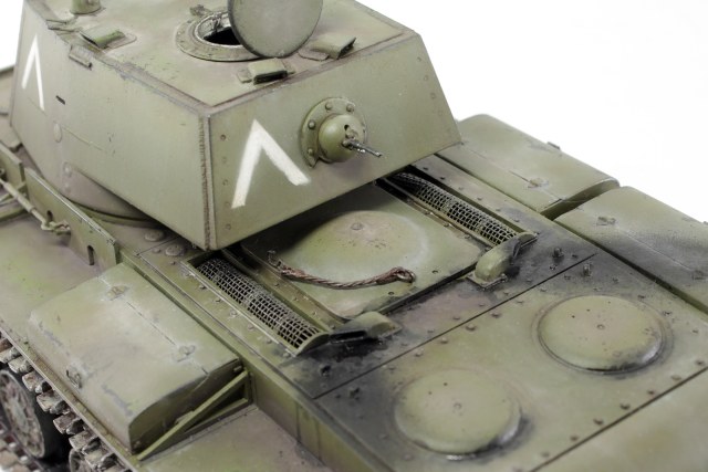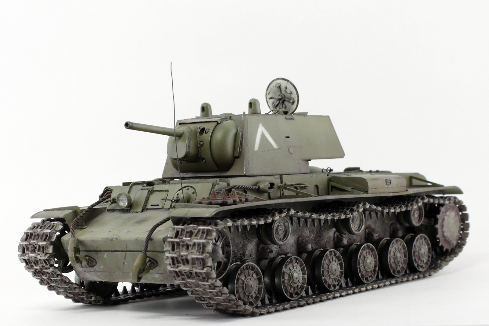 Очень хорош КВ у Вас получился, видно, что Вы матчасть этой машины изучали, модель дорабатывали. Позвольте пару придиризмов. Кормовой фонарь окрашен правильно, вот только сама деталь, похоже, перевернута, судя по фотографиям, верхняя часть фонаря, та, что синего цвета, должна быть по своему размеру (площади) больше нижней. Ну и заметны следы стыка пресс форм на запасных траках.