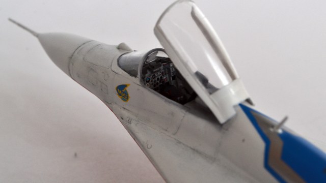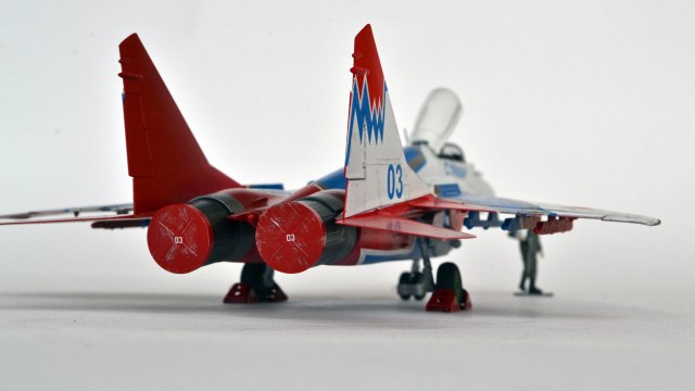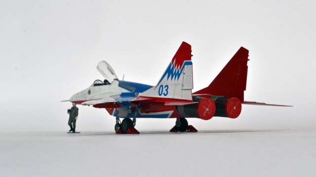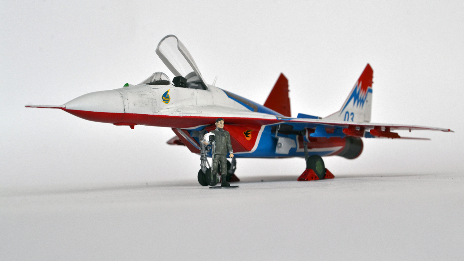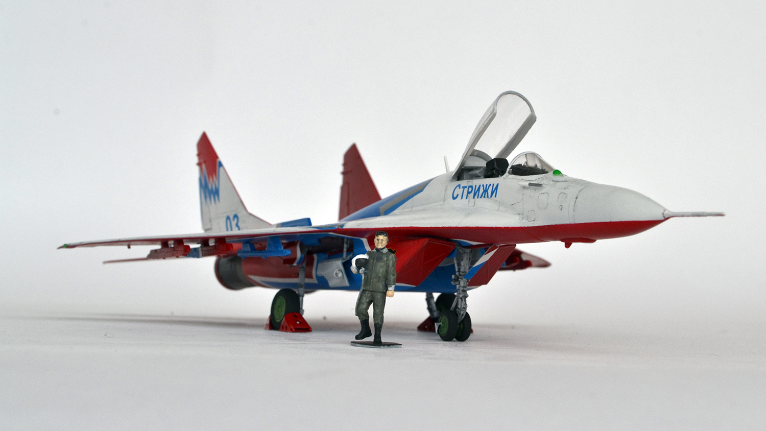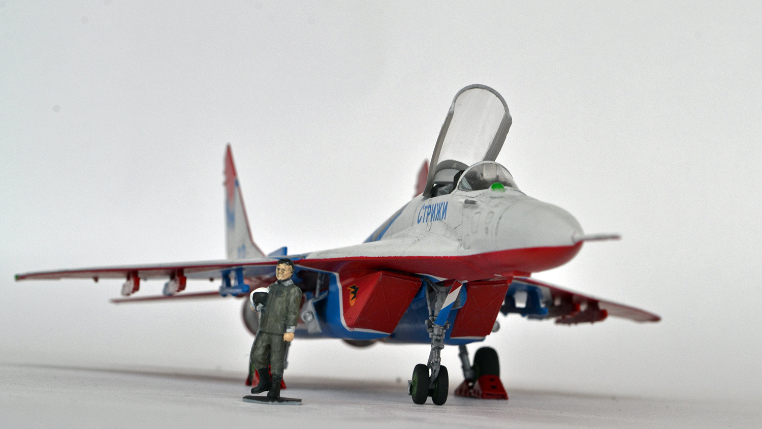 Заканчиваю все свои застрявшие проекты до конца недели. С этим МиГом не пошло ещё с этапе декалирования: синий стриж на спине под слоем футуры сложился в одну огромную гармошку и ничего с ним сделать не удавалось - расправляться не хотел. В итоге пришлось его полностью снимать и накрашивать через маски. Тематика не моя, поэтому в матчасть не лез, но наслышан, что модель Звезды хороша и достаточно точна. Ну и фигурки я расписывать, увы, не умею нормально :)