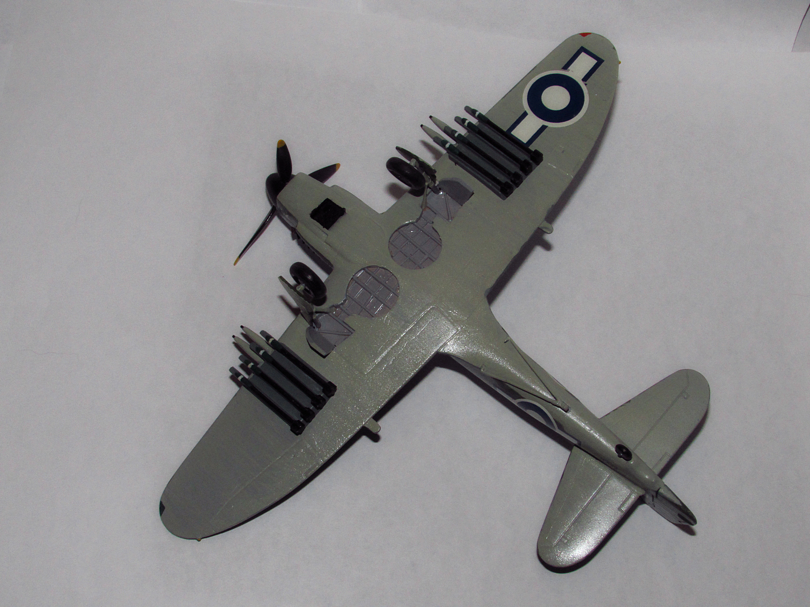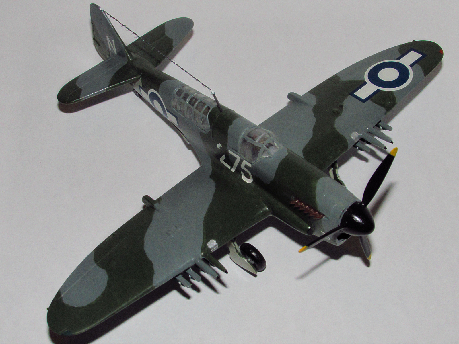 А на фото у нас модель палубного истребителя Британских ВВС Firefly Mk.1 времен ВОВ. Третья по счету собранная модель. Результат сборки из серии "хотели - как лучше, вышло - как всегда"... Уж слишком много "хотелок" пытался реализовать в данной модели. Первая попытка изобразить камуфляж, первая попытка переделки ниш шасси (тянутый литник)... Даже сеточка вклеена в нишу радиатора двигателя! А дальше началось! После окраски всплыл косяк со шпатлевкой на днище флюзеляжа. Бесповоротно запороты фонари кабин пилота и штурмана (просочился лак). У слову, нормально подогнать друг к другу половинки фонаря штурмана так и не смог. Лак поднял ворс на уже окрашенной нити, что антенну имитирует. И прочее, прочее...