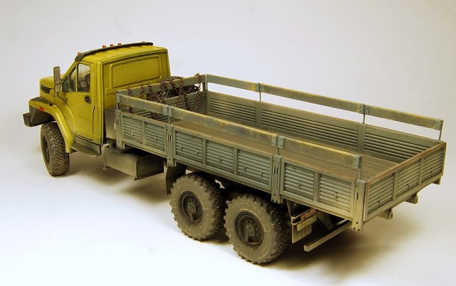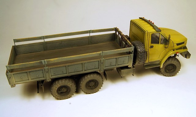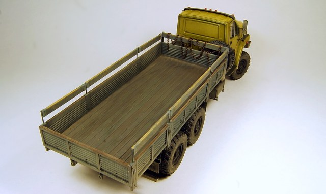 Отсутствуют декали (в том числе и на приборную панель), грязевые щитки на кузов даны на прозрачной пленке вместе с остеклением кабины (с какой целью непонятно, я использовал из трамповского набора на Урал). Ходовая часть выполнена крайне упрощенно, в частности элементы рулевого управления пришлось делать самостоятельно.