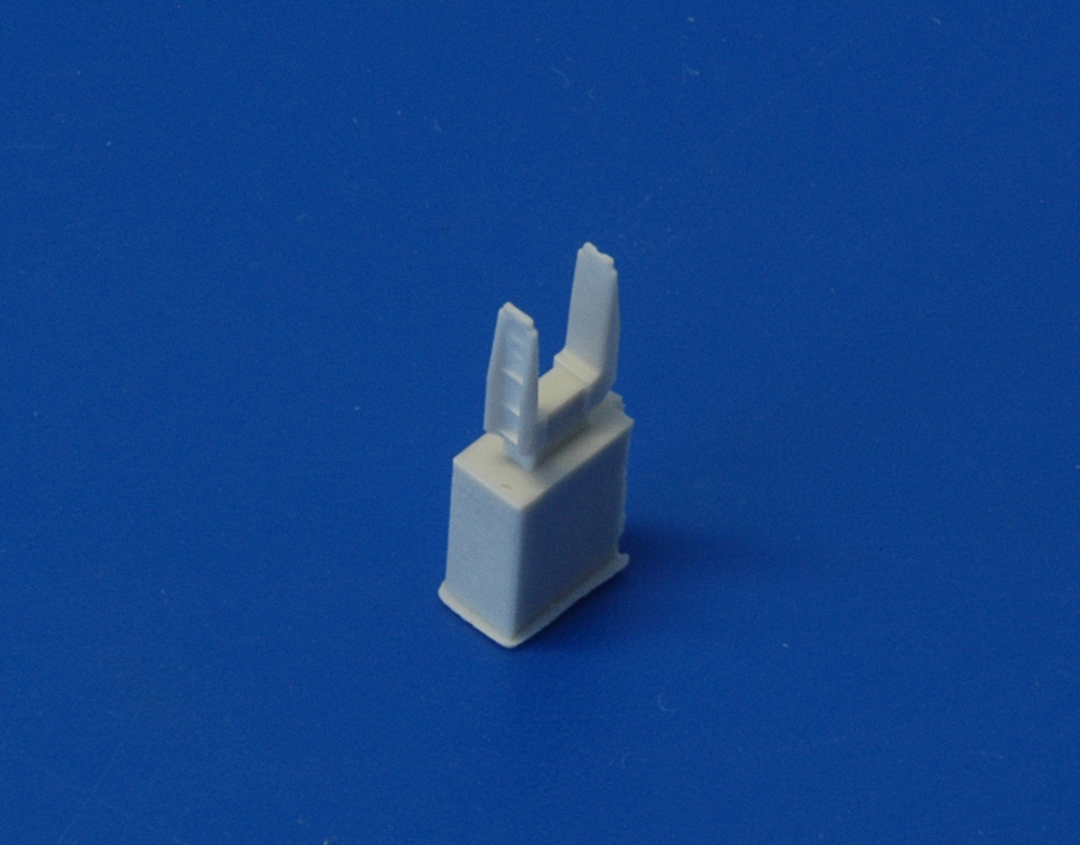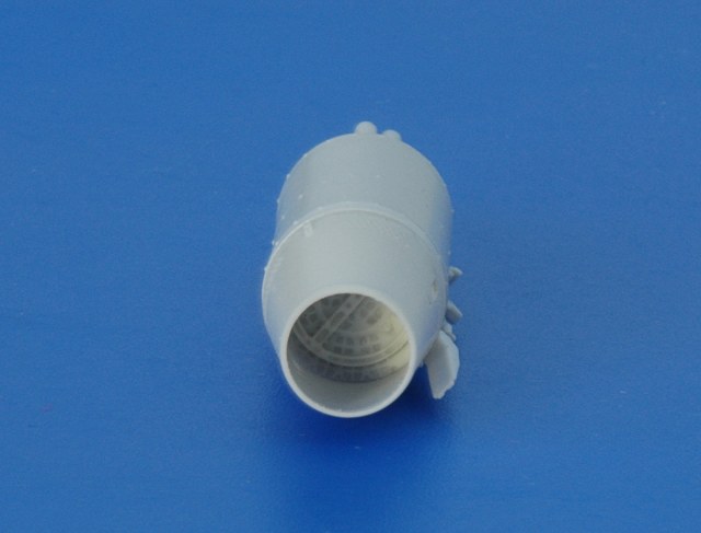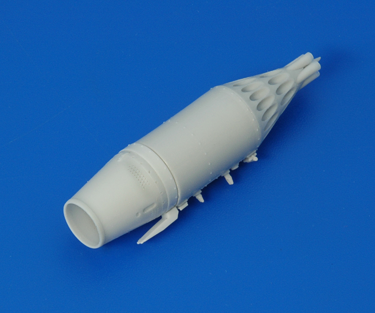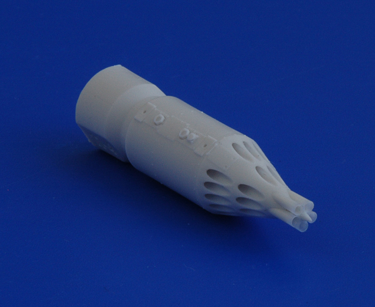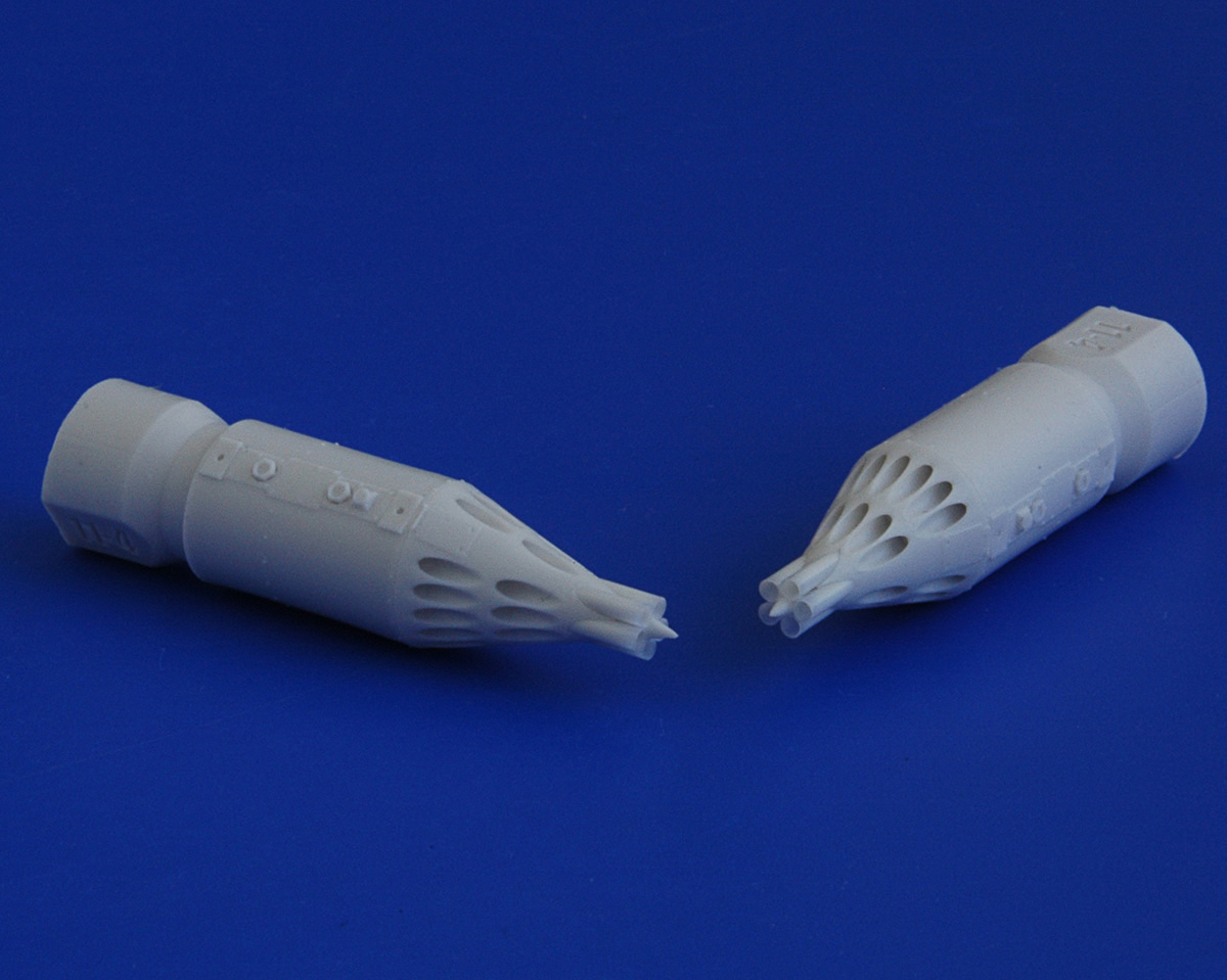 В первую очередь хочу обратить внимание на продуманное технологическое членение. Корпус блока с носовым обтекателем выполнены одной деталью, отдельными деталями даются детали казенной части и хвостовые обтекатели. Подобное решение сделано с единственной целью – качественно проработать казенную части блока. У компании АМ нет особых проблем с заказом фототравленных деталей, но посмотрите на фотографии реальных образцов. Два уровня травления, не могут передать деталировку казенной части. Можно только похвалить разработчиков за такой подход к проектированию. Понятно, при сборке возникнет необходимость обработать и совместить две торцевые поверхности, на мой взгляд, это не самая сложная задача для моделиста. Все остальное собирается без особых проблем. Хвостовой конус отделяется одним движением модельного ножа. Вторым движением убирается лишний облой и деталь с щелчком становится на свое место. Дальше устанавливаются детали подвески и один из самых распространенных в наших ВВС блоков готов к покраске.