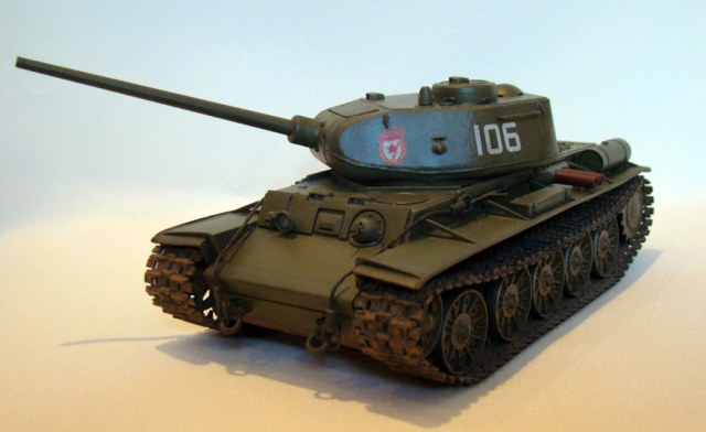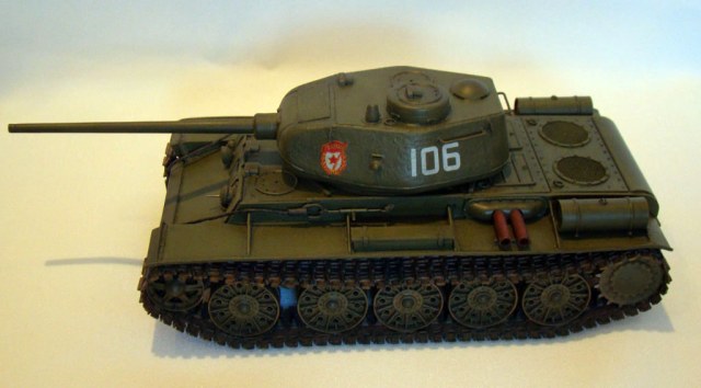 Там было много нюансов но делал из того что было с минимумом самодельных деталей.Хотелось обрезиненные катки типа паук -под рукой были невостребованные сталинградского типа - крышки ступиц отлил из шпаклёвки по слепку в пластилине.Люки на башне ставил КВешные мол машина всё таки на основе КВ и люки унифицированы .Смотровые приборы от КВ-1с.Колпак вентиляции на башне один по аналогии с ранними сормовскими башнями Т-34-85.Уместнее была бы пушка Д-5 ( в наборе башни она есть )как более ранняя но когда то она ушла на переделку звездовского ИС-2 в ИС-1. Самодел только крышка корпуса над двигателем и сеточки на люках над трансмиссией по аналогии с Т-44 ( там тоже вентиляция ) но форму оставил круглую .Ах да главное корпус укорочен на один балансир - в реале танк был бы короче примерно на пол метра.